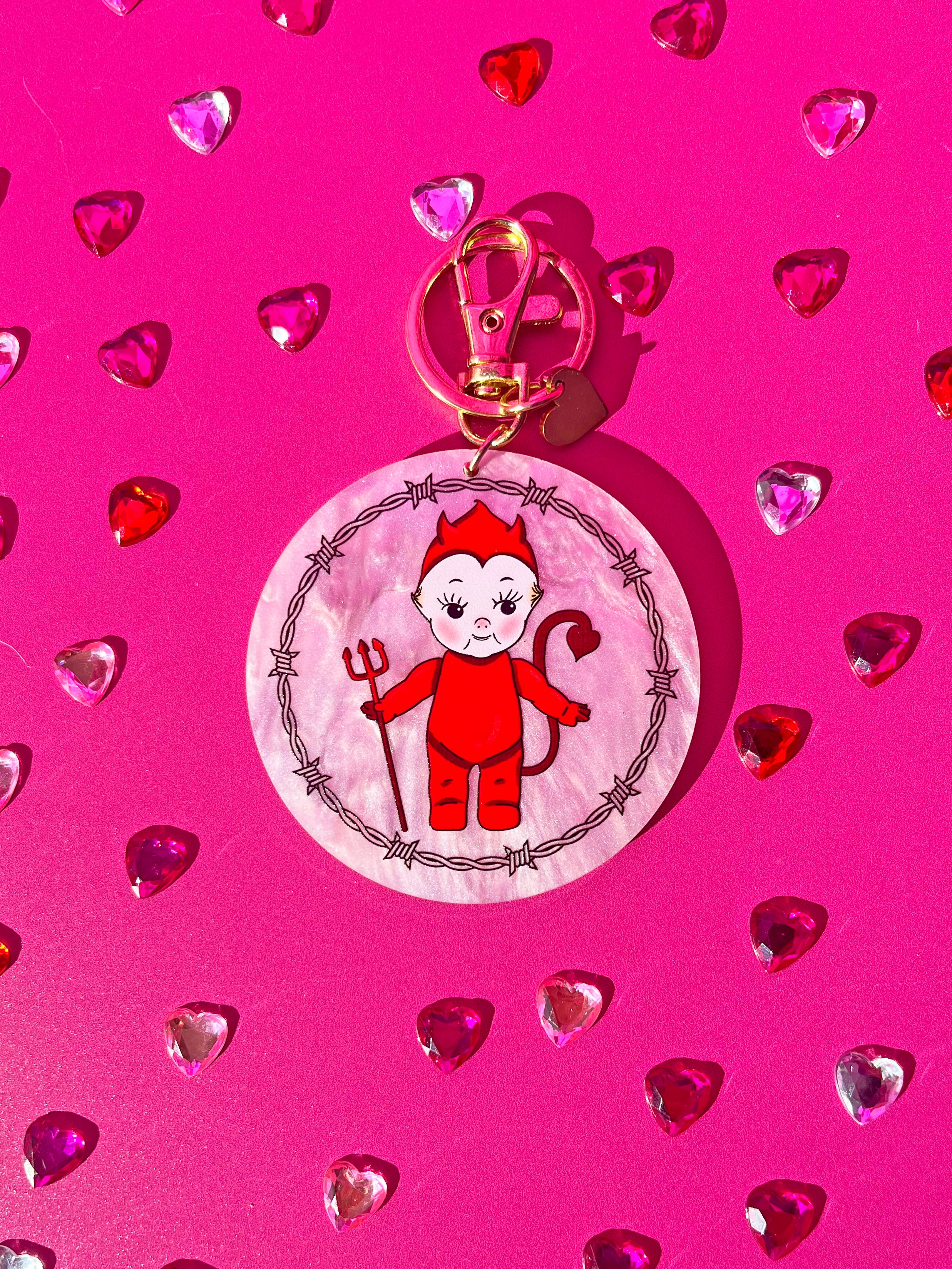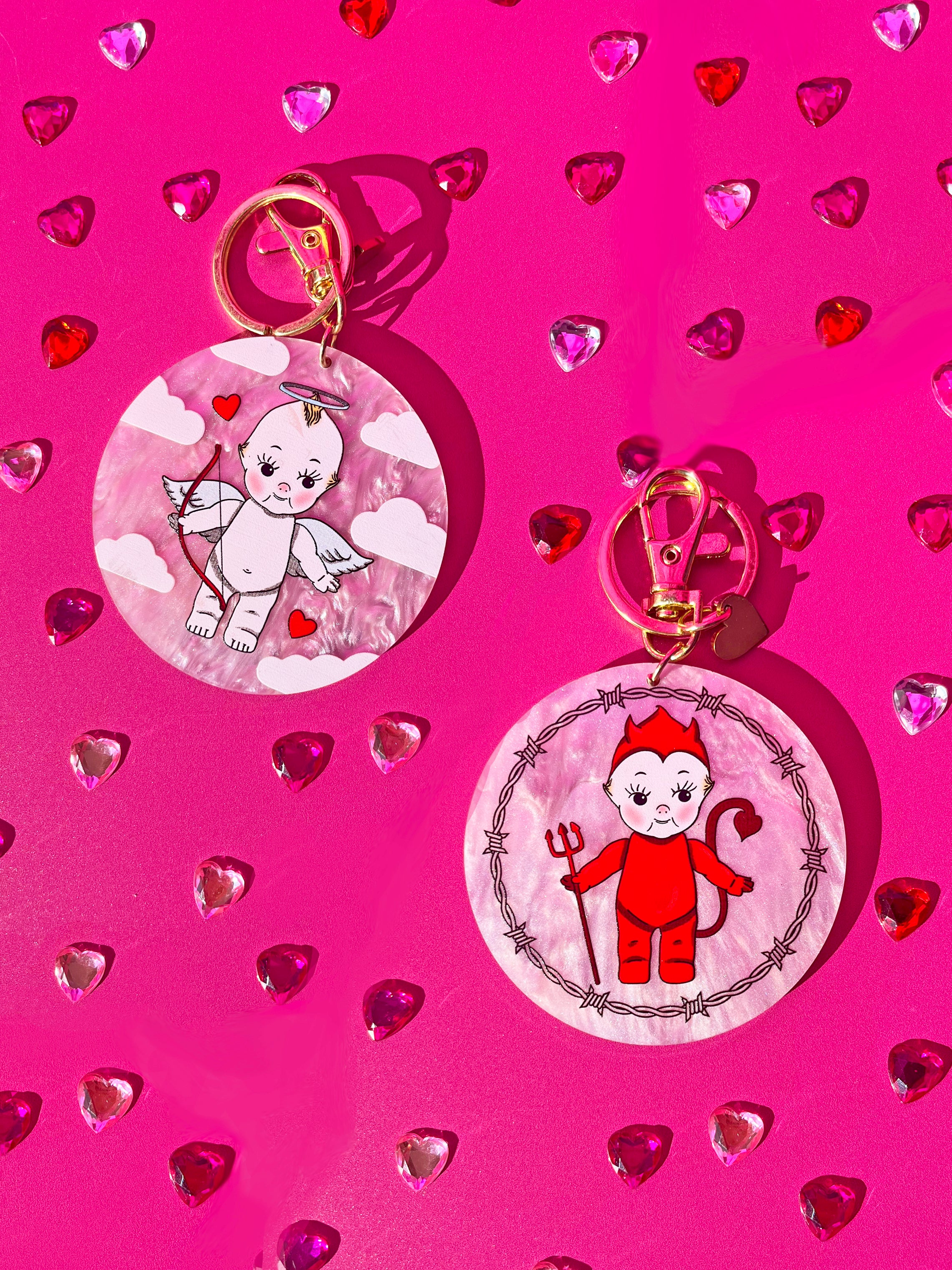 I'm just a baby angel/devil! This keychain features an angel kewpie on one side and a devil on the other. One for each of your personalities!