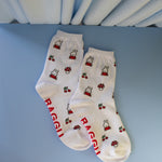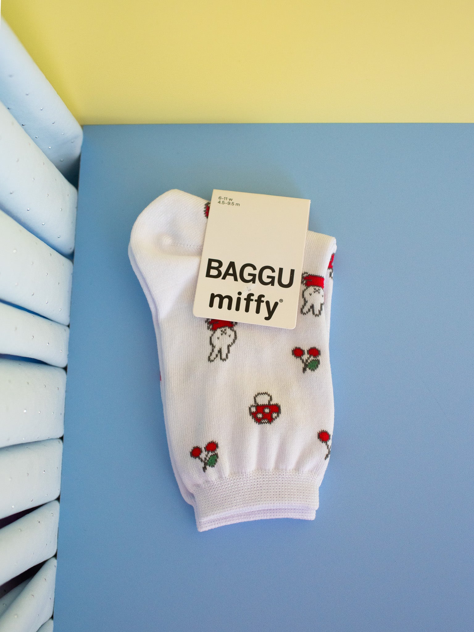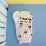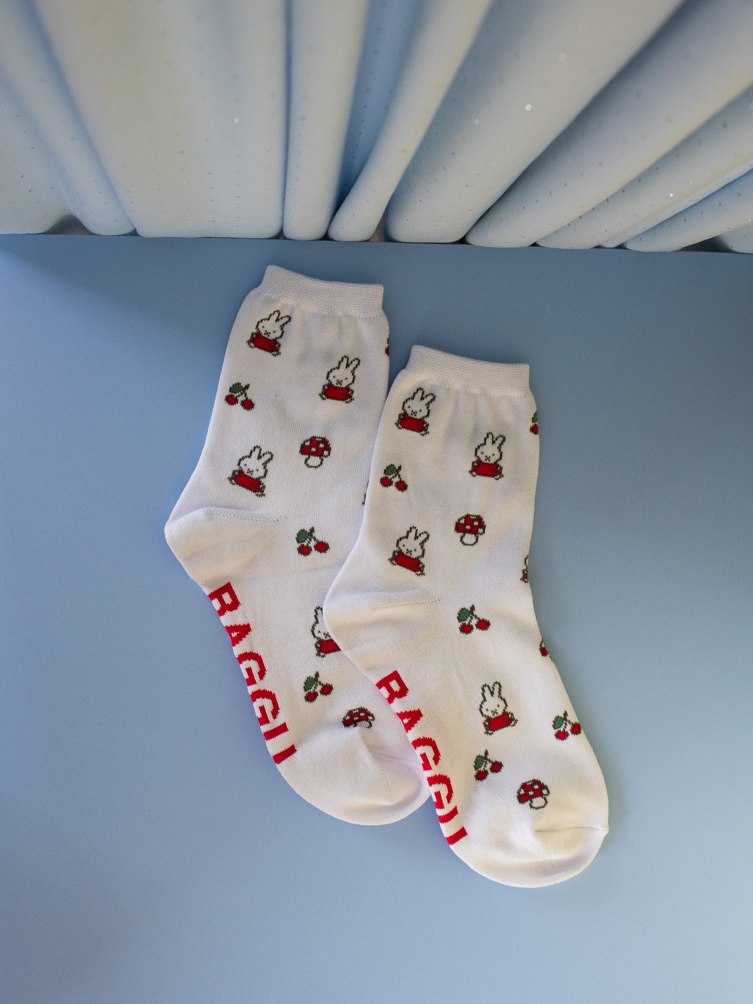 Socks are just bags for your feet, right? These crew socks are woven from soft and stretchy bamboo rayon material and feature a repeating design of Miffy with cherries and mushrooms! AH so cute!
