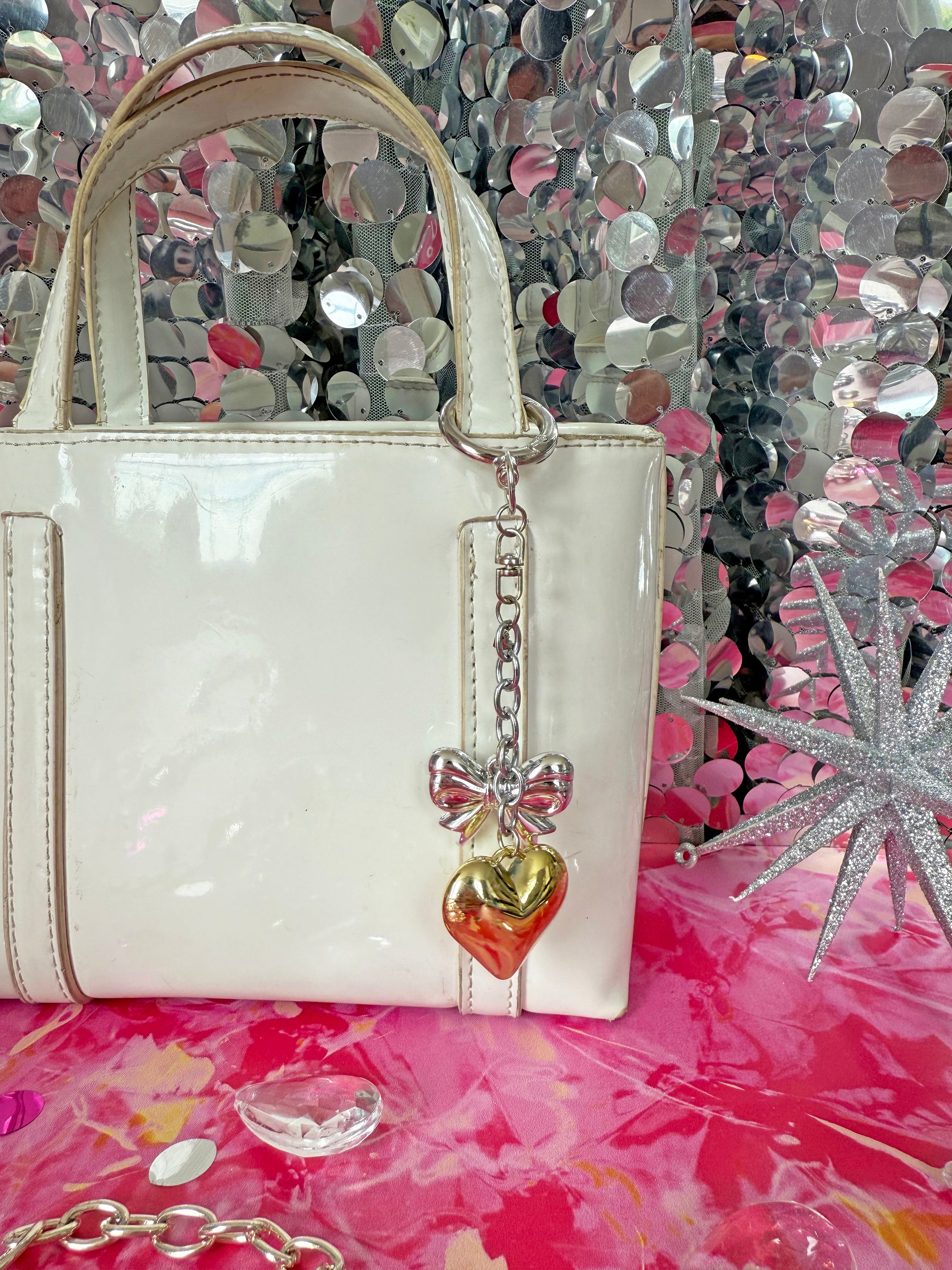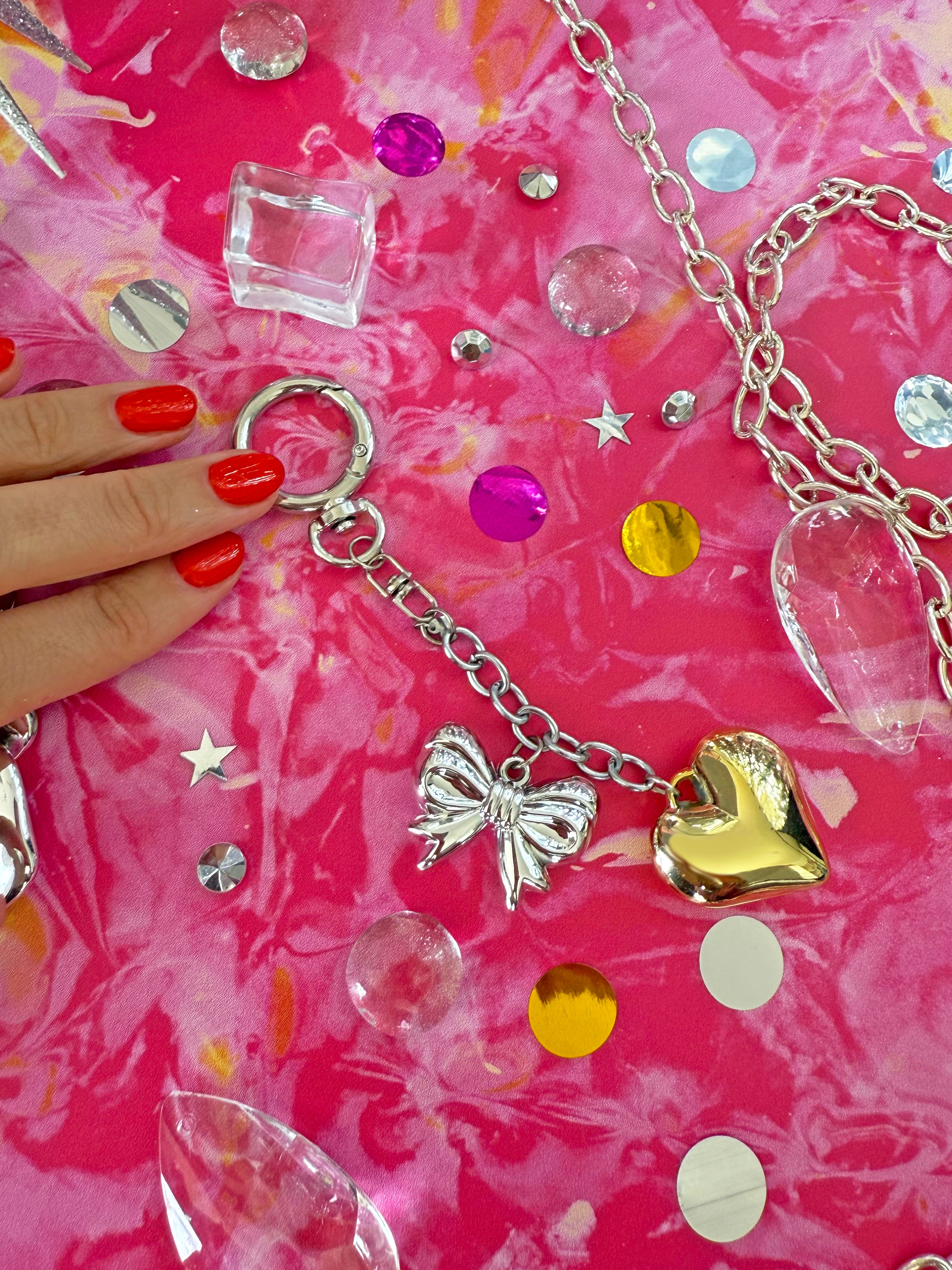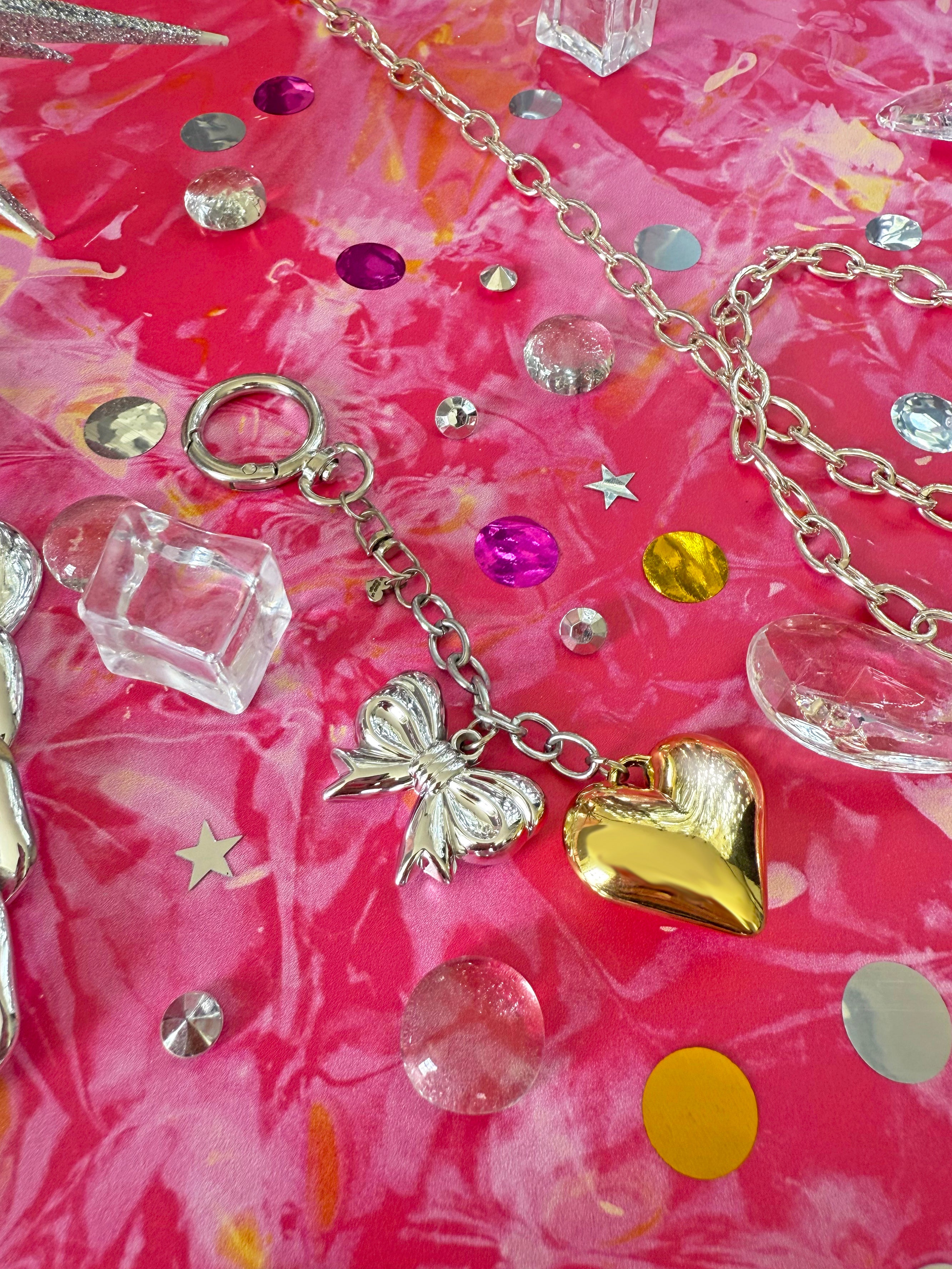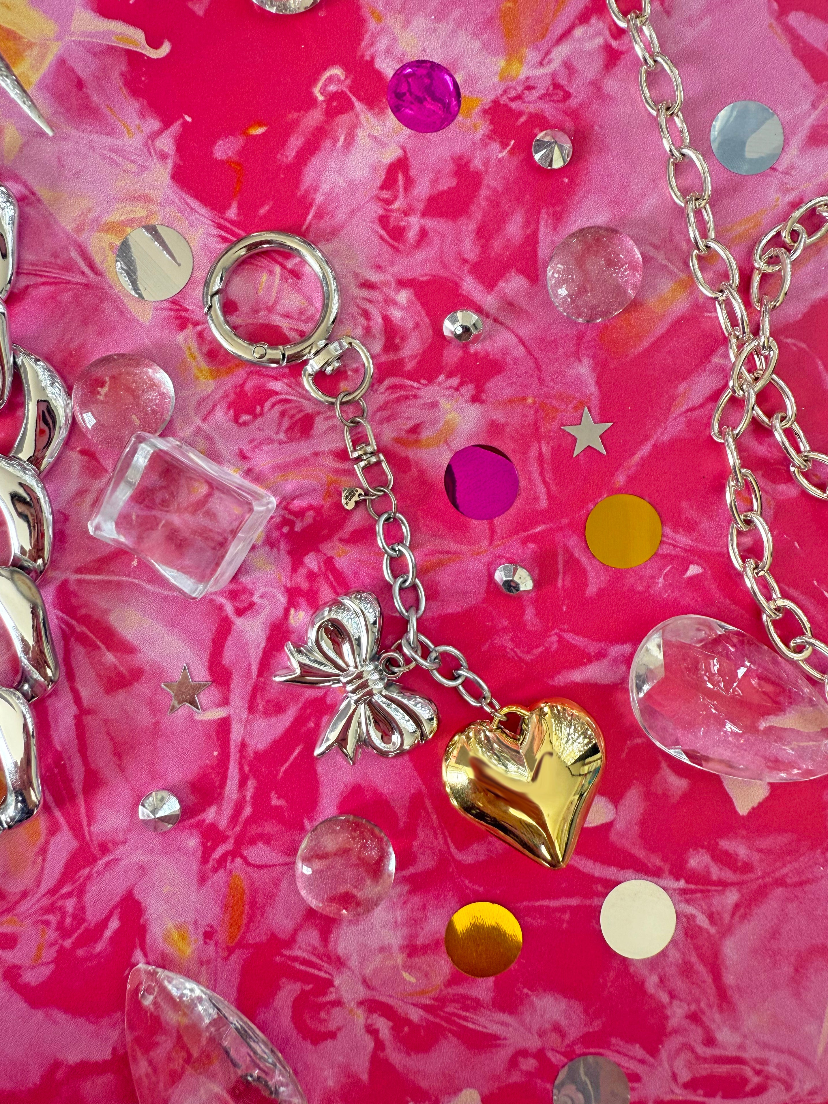 This cutie bag charm features a dangly gold heart and a silver bow - the cuntiest addition to your keys or bag! Comes with a silver stay-closed carabiner clasp that’s easy to clip on or off without ruining your manicure.
