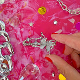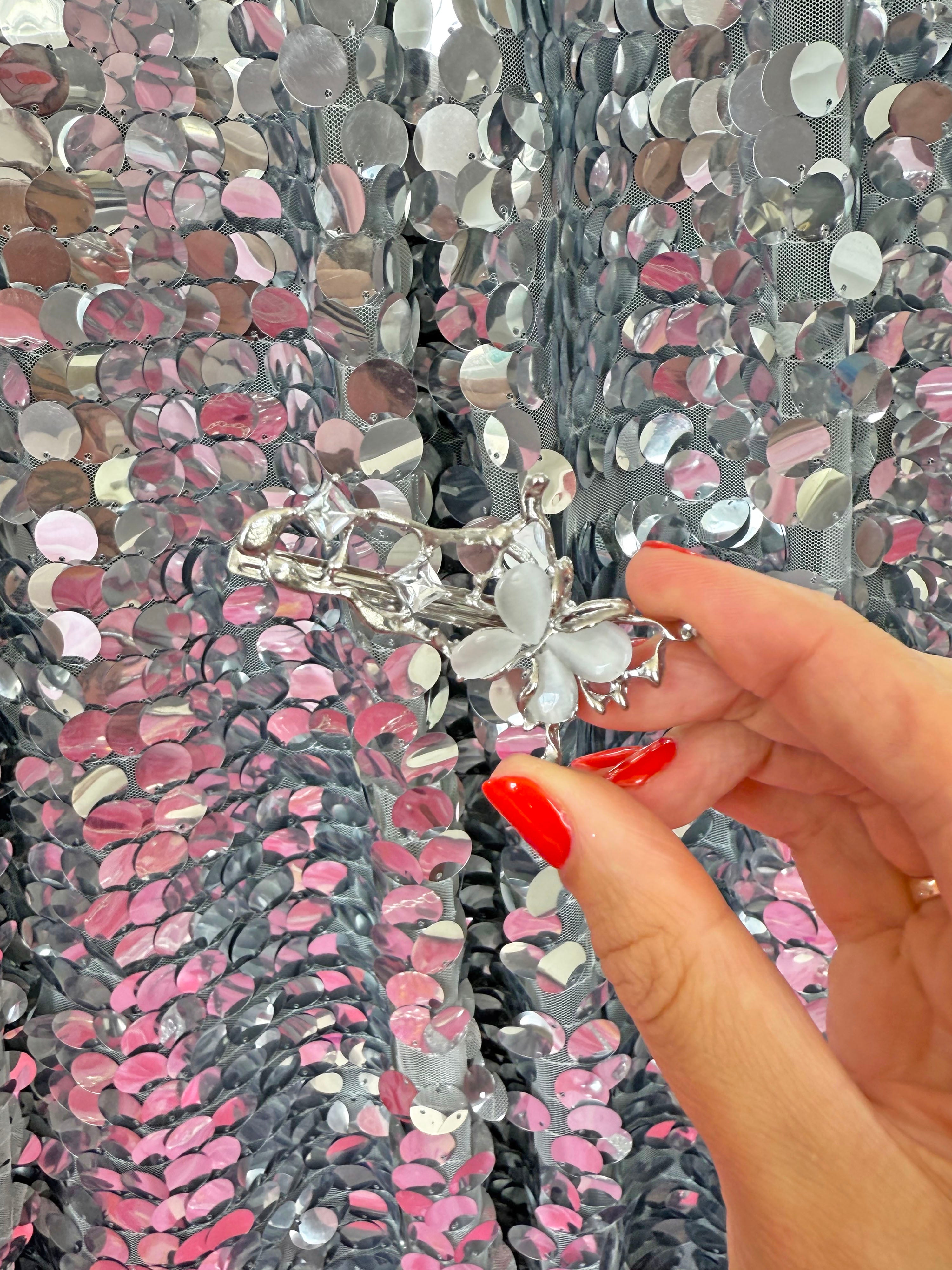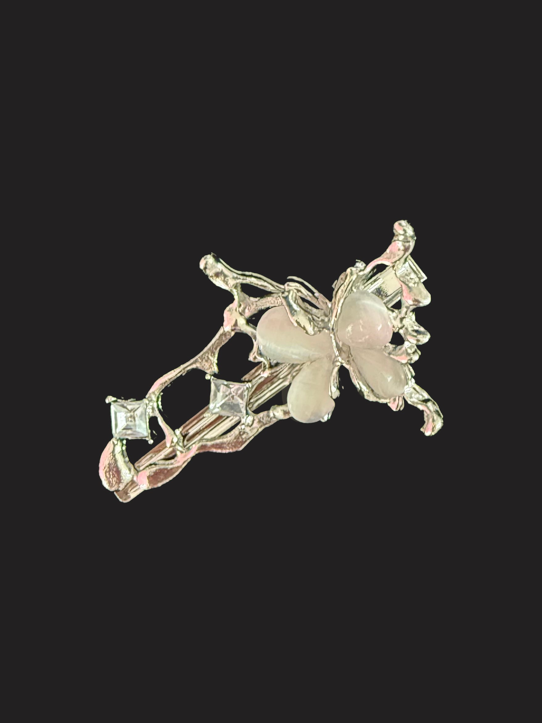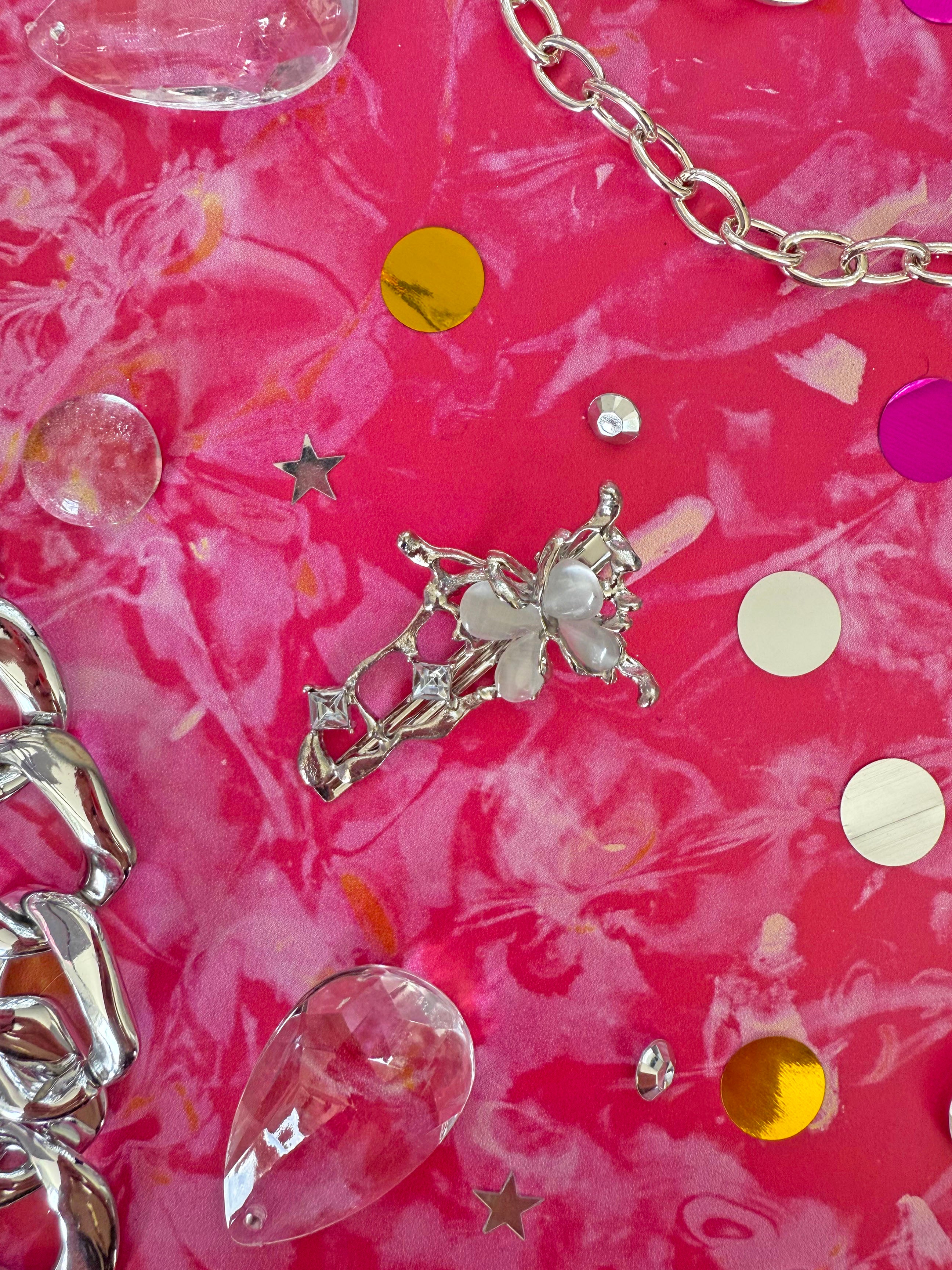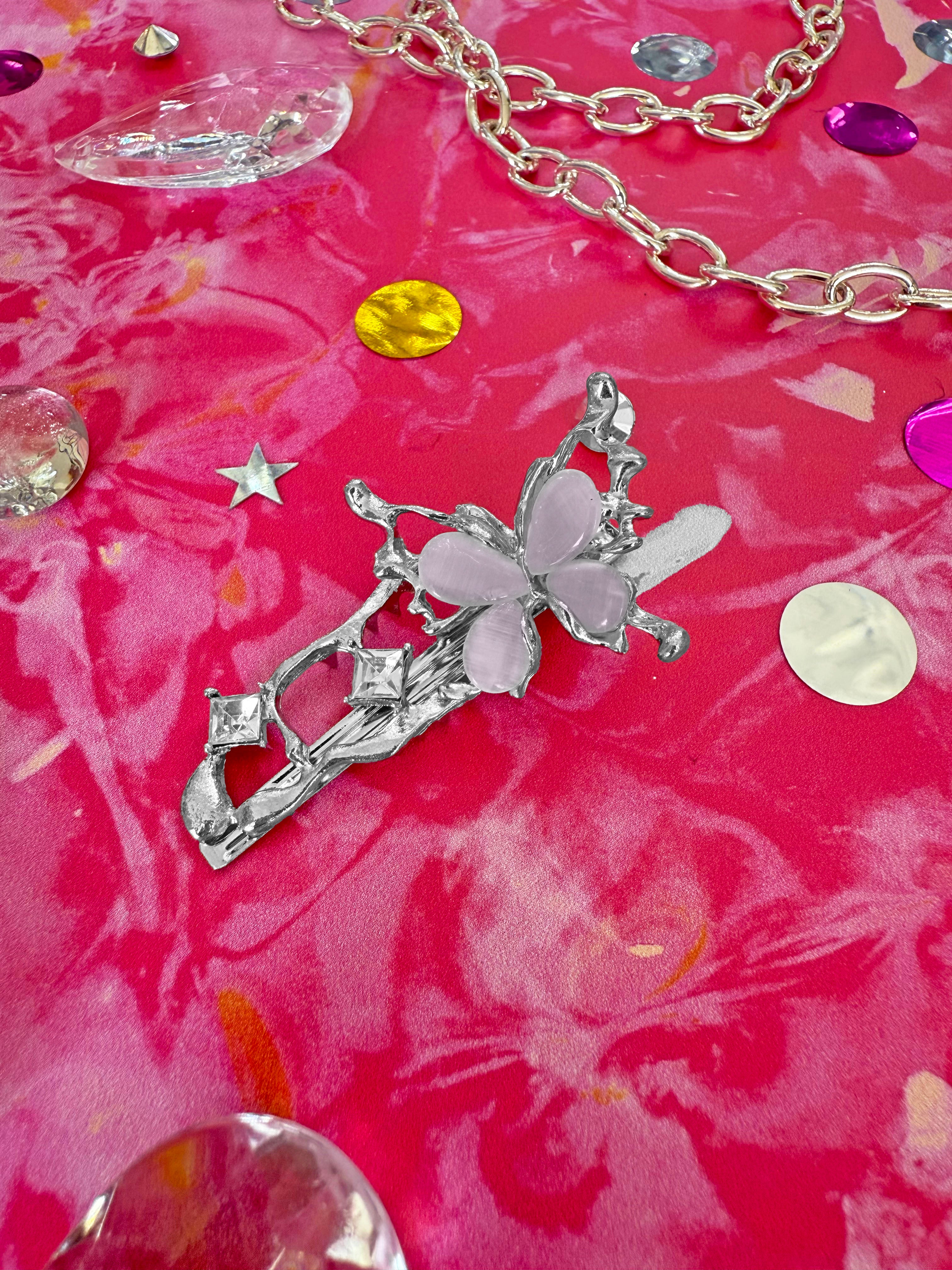 We're obsessed with the liquid metal style of this barrette! It features a crystal butterfly with gems and adds an edgy touch to any look. Attached with a silver alligator-style clip - it's perfect for a partial updo or holding up a few locks of hair for effortless style!