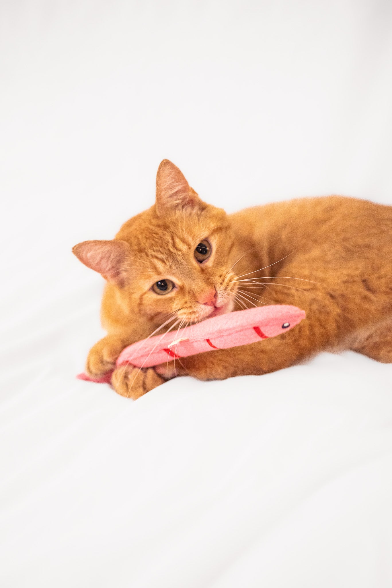 This pink worm with red stripes measures 9” and is made with super potent organic catnip.