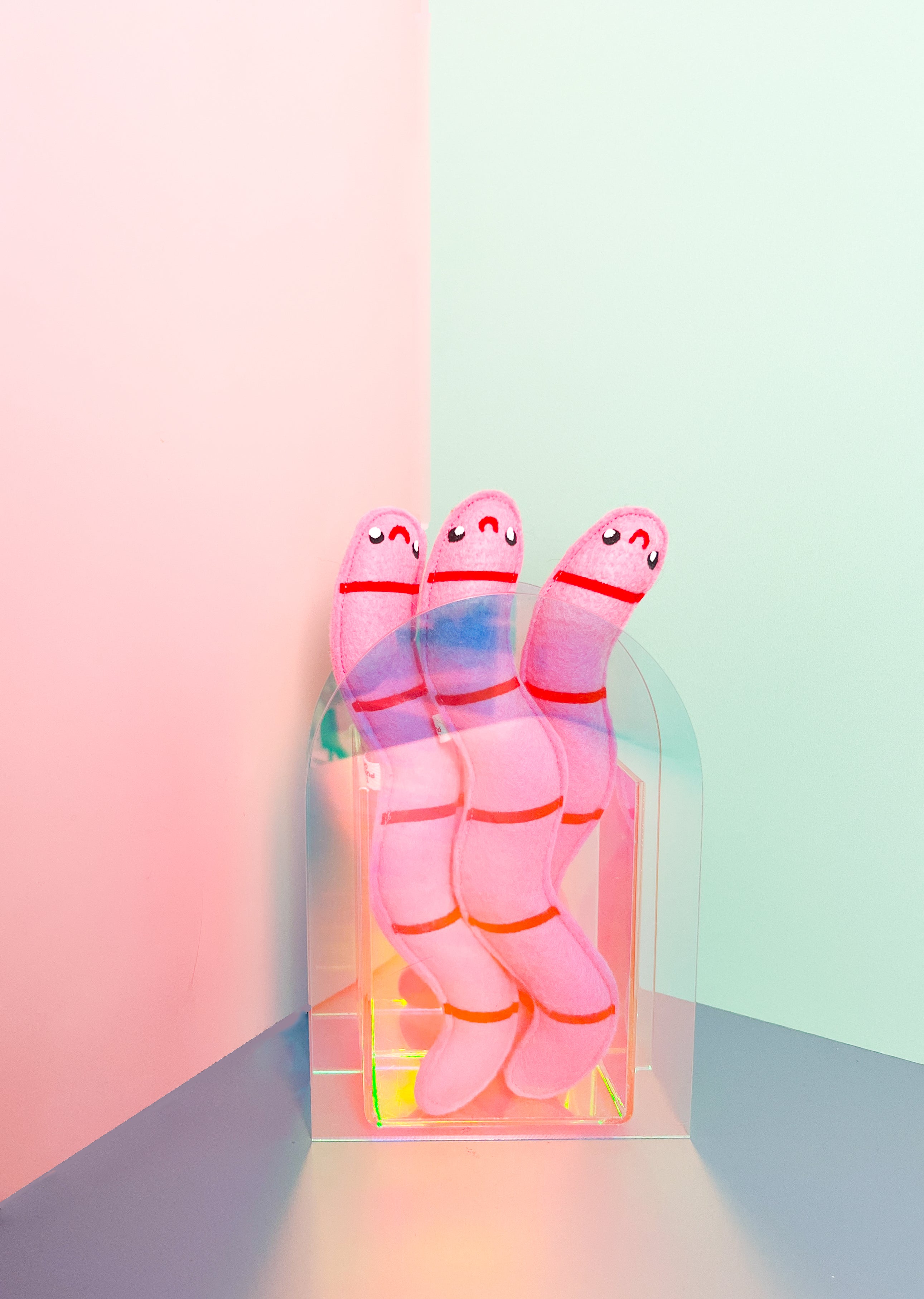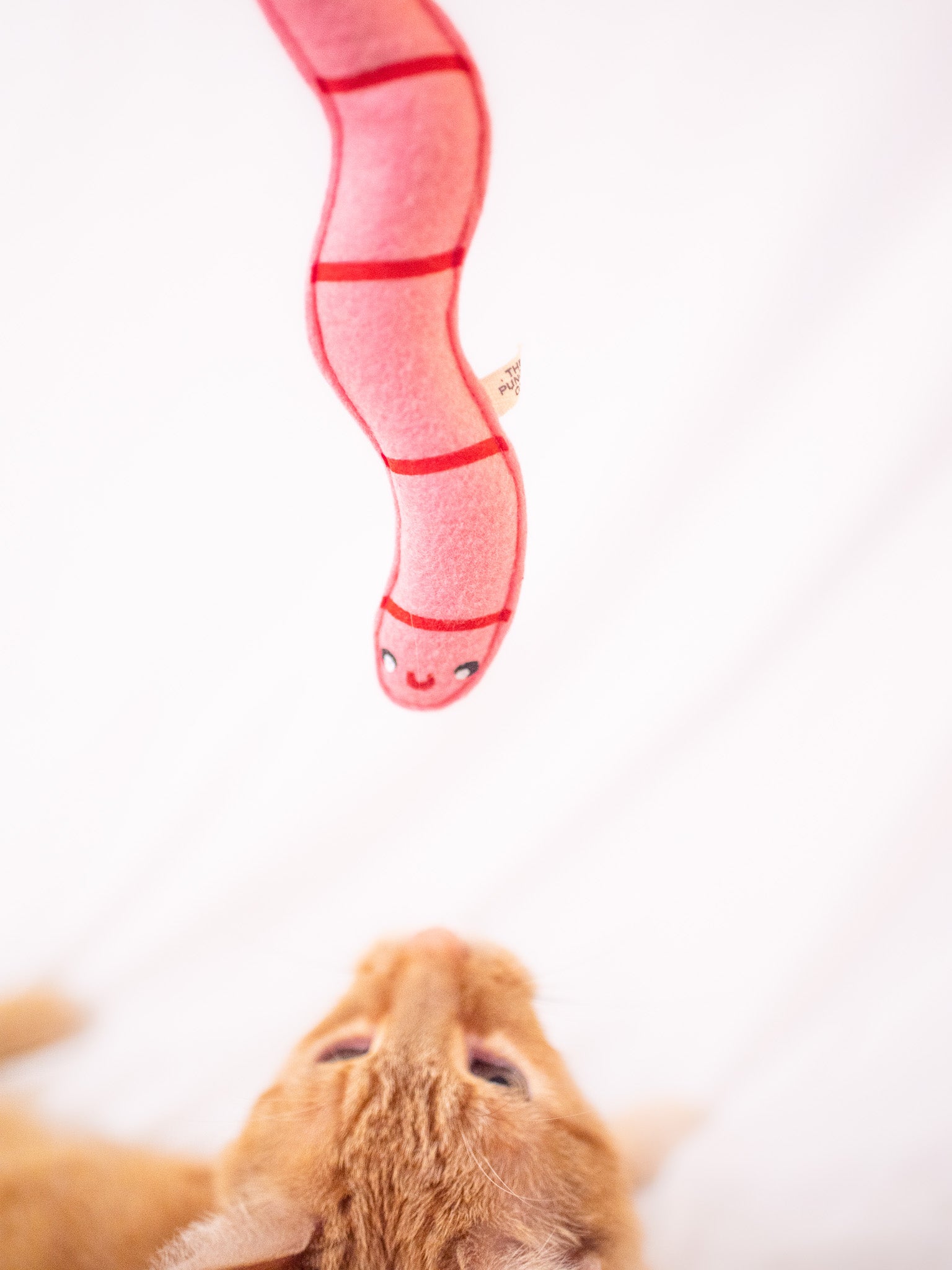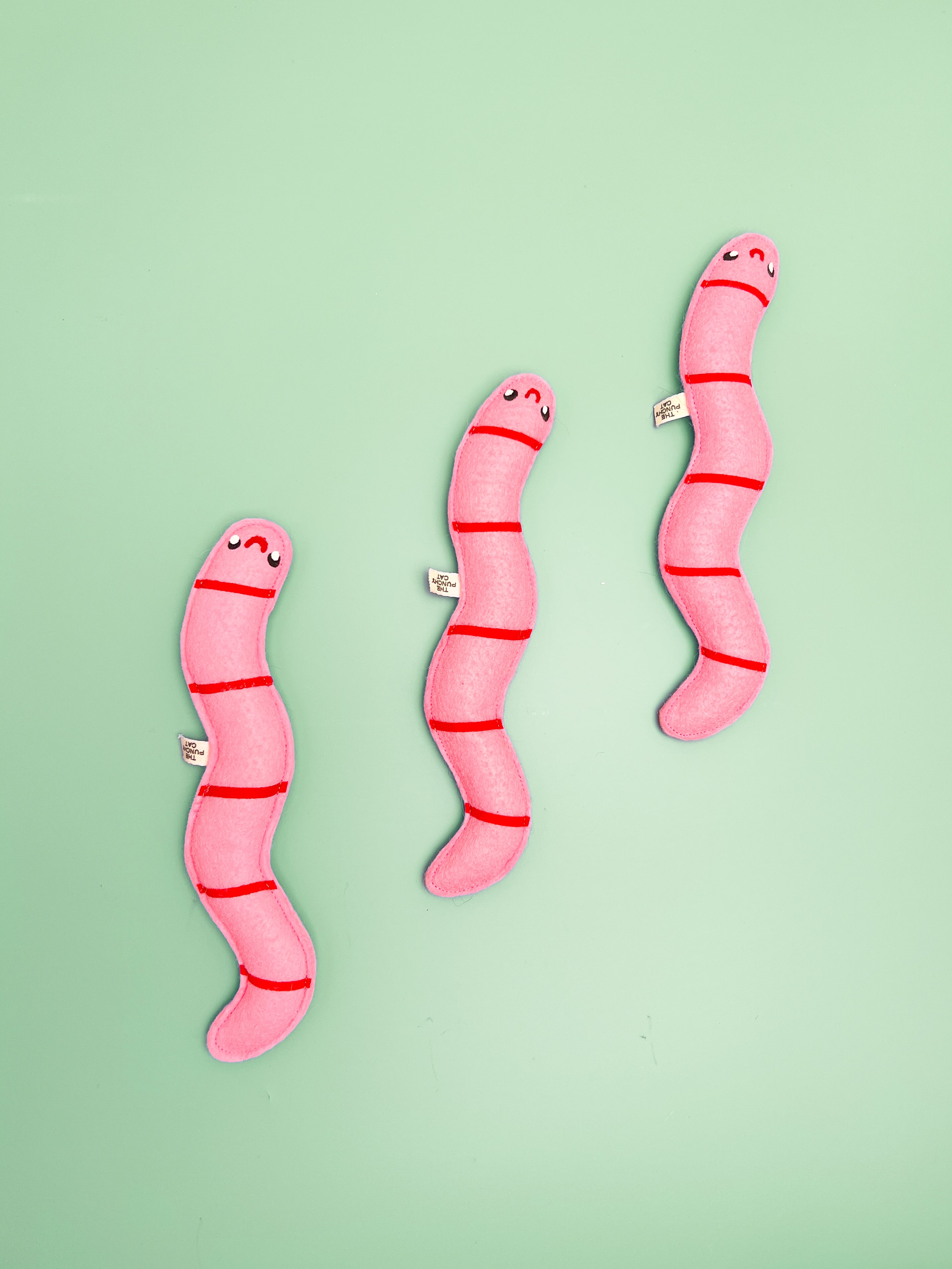 Each worm is one-of-a-kind with variations expected since these are handmade with love by Molly of Punchy Cat Toys in Iowa <3