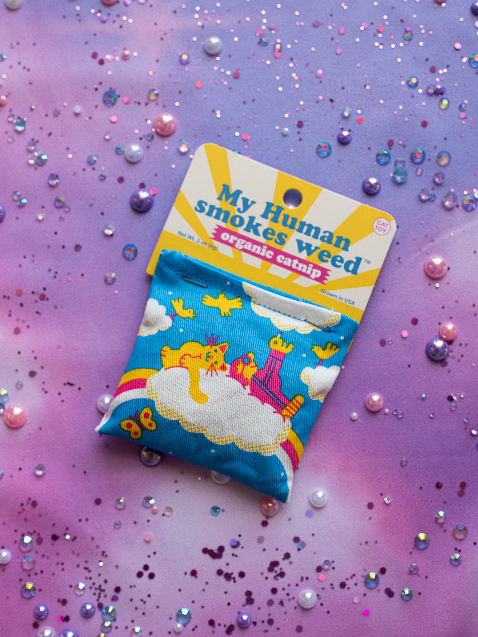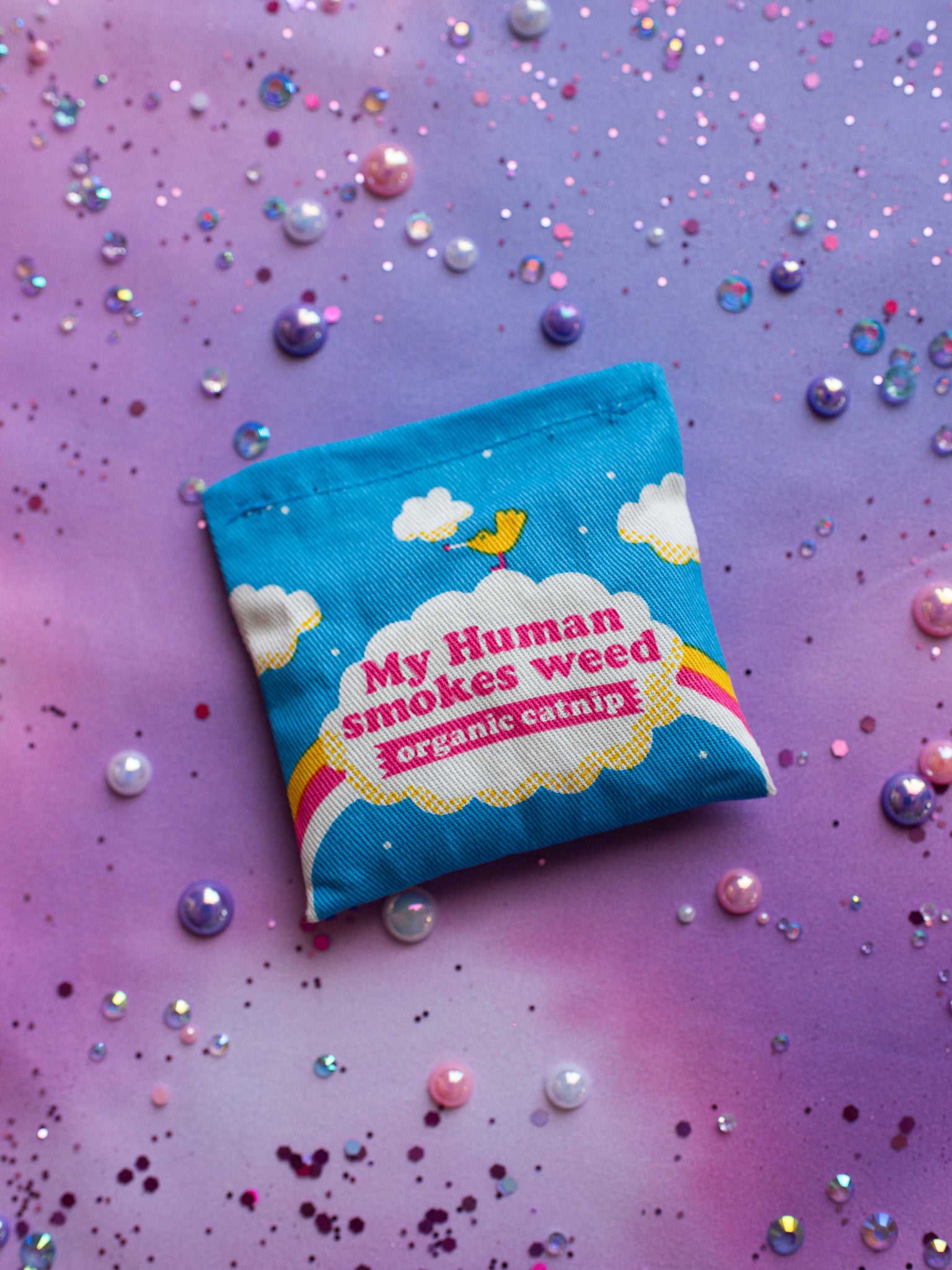 Featuring a relaxed kitty and owner on one side and the saying, "my human smokes w**d" on the other!