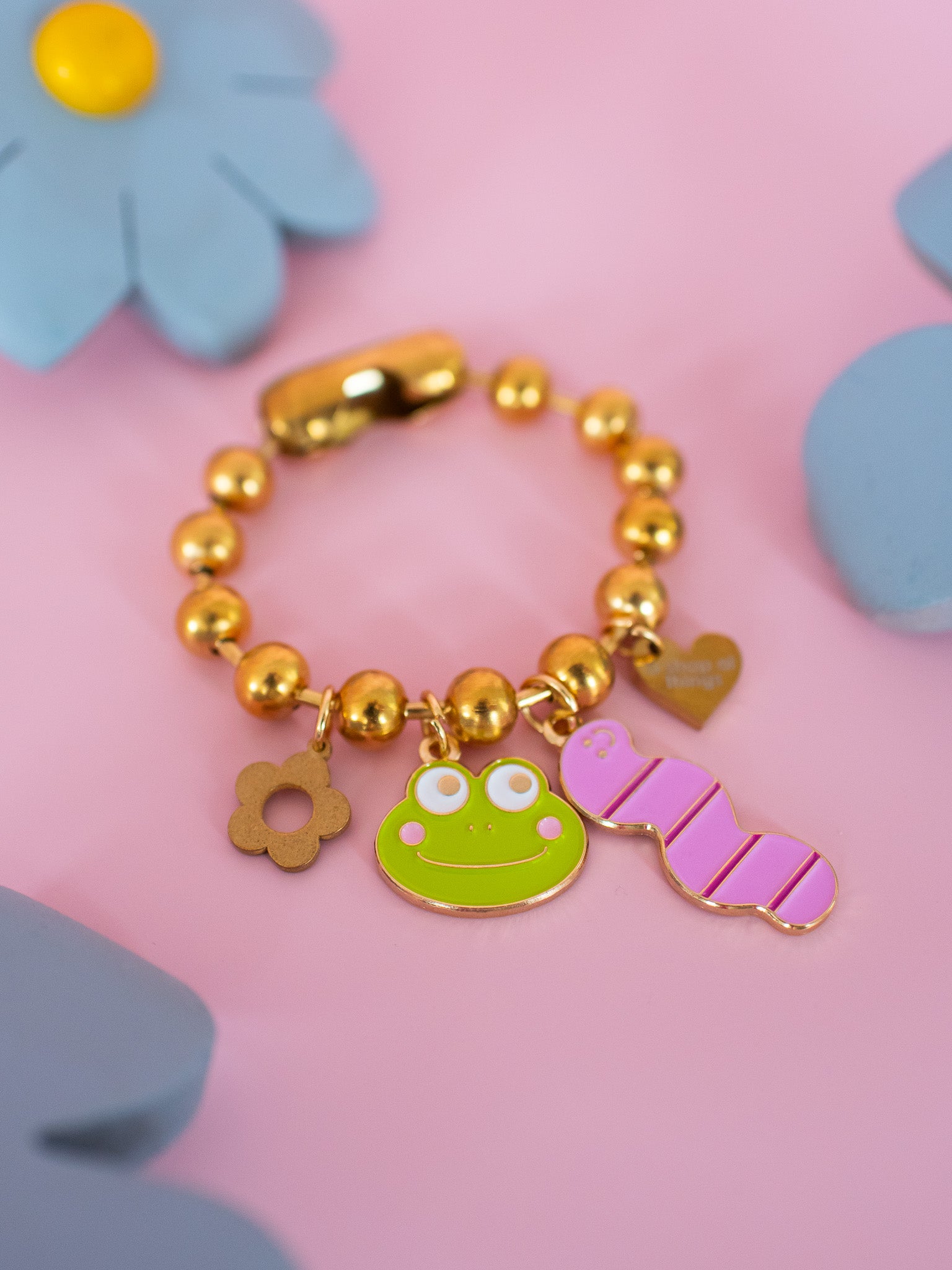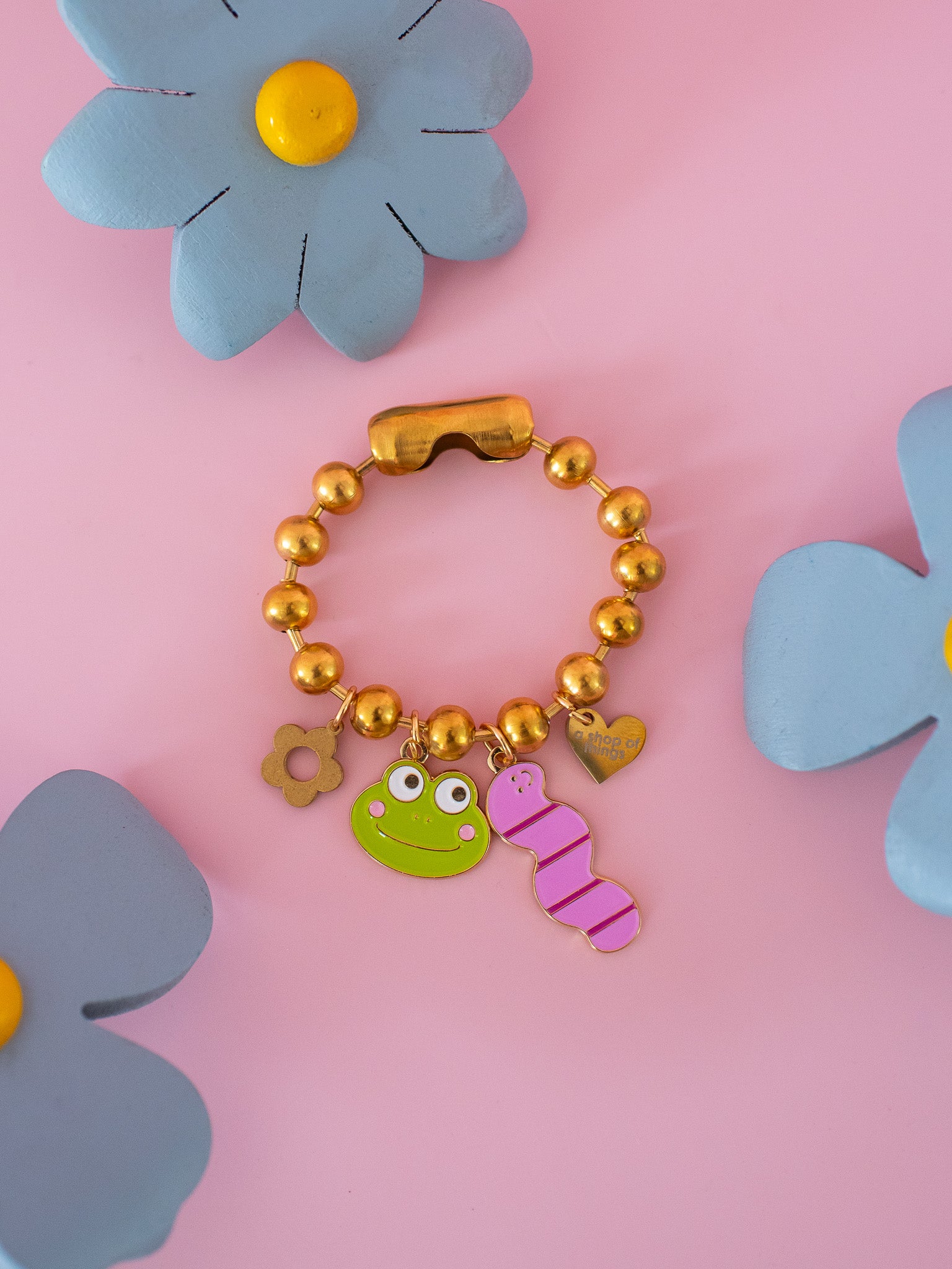 This cup charm is made from a gold toned oversized ball chain and has a daisy, frog, worm, and heart charm attached.