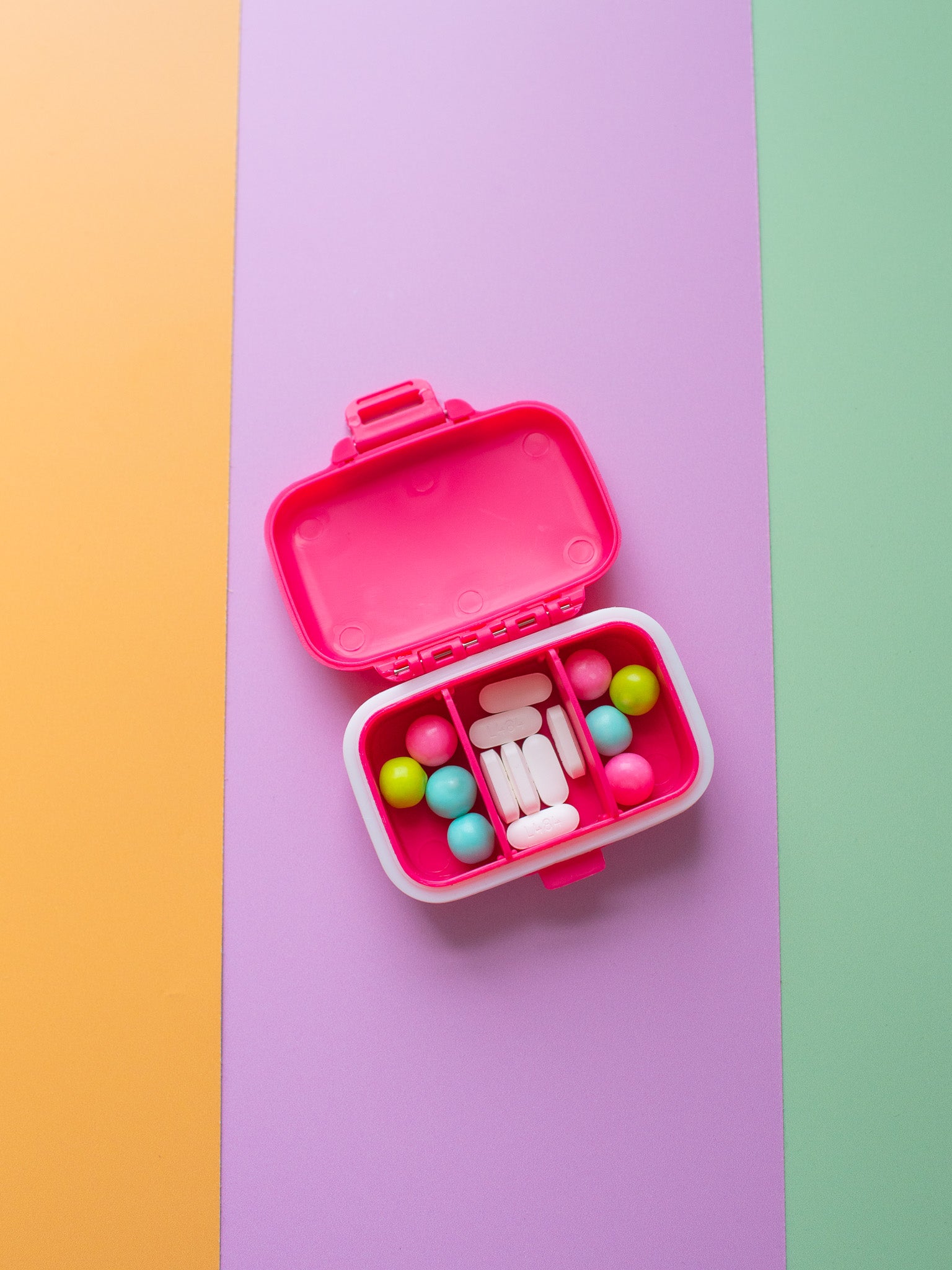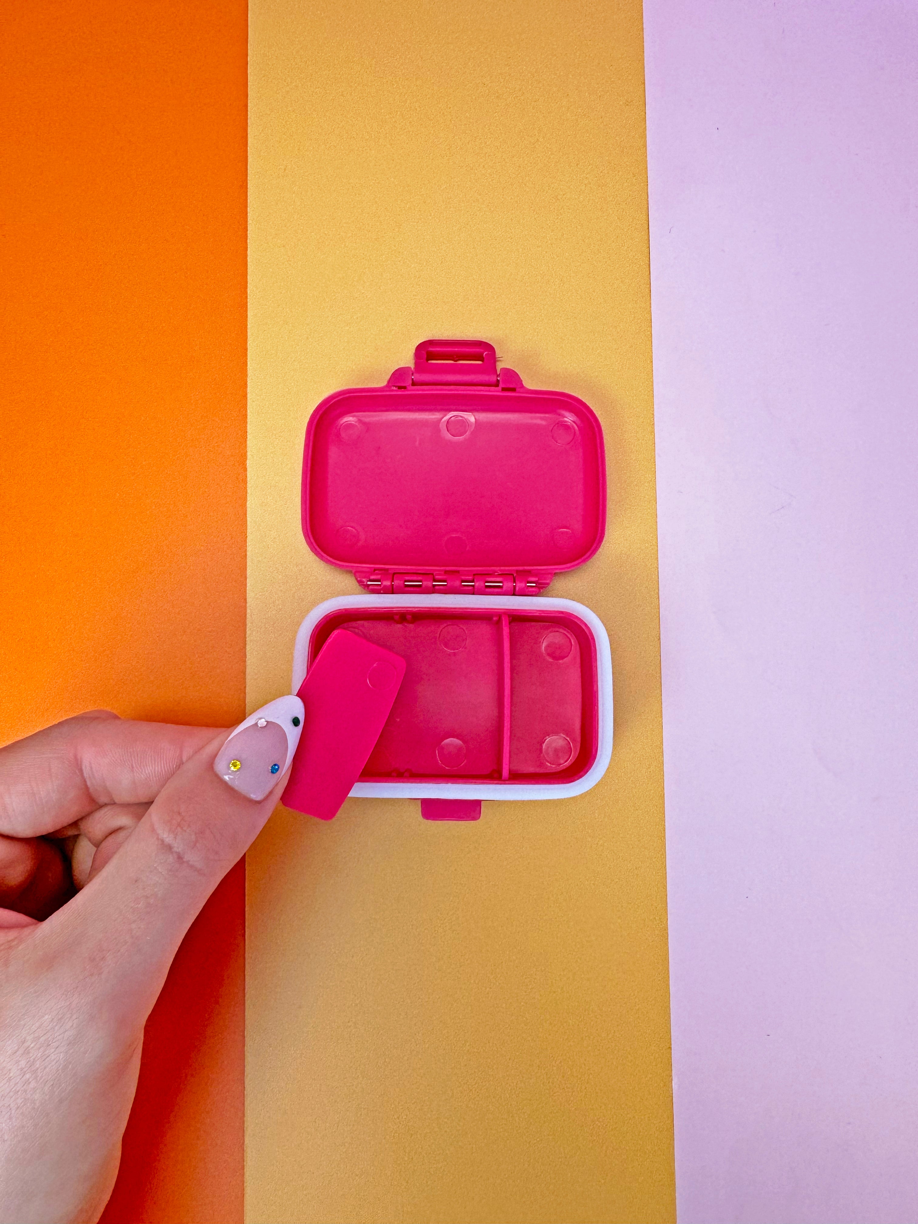 Carry your meds and vitamins in style with this pink pill case that has two convenient, removable dividers on the inside that creates 3 separate compartments . Shaped like an adorable mini suitcase. Water proof + smell proof!