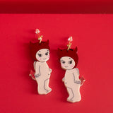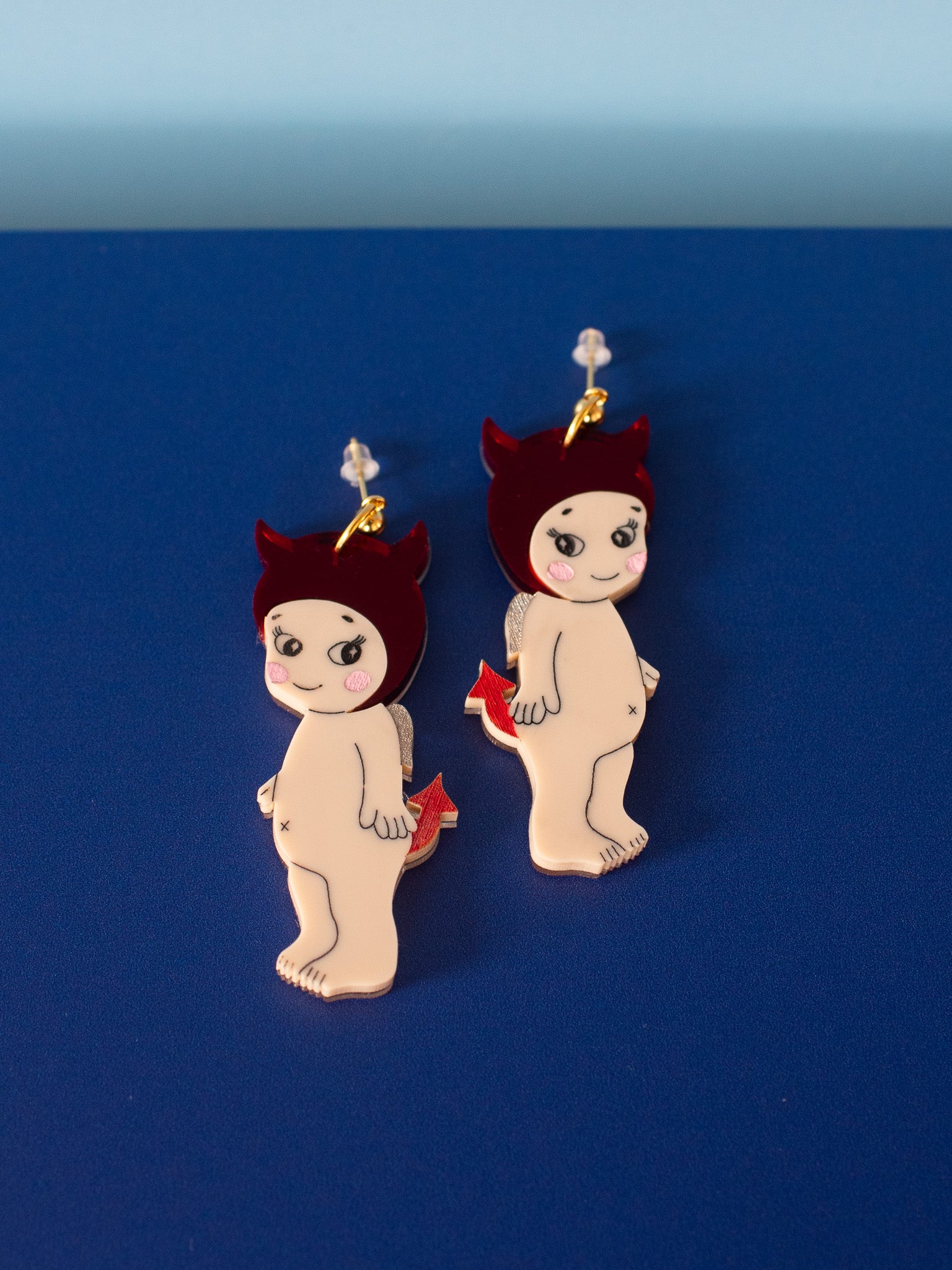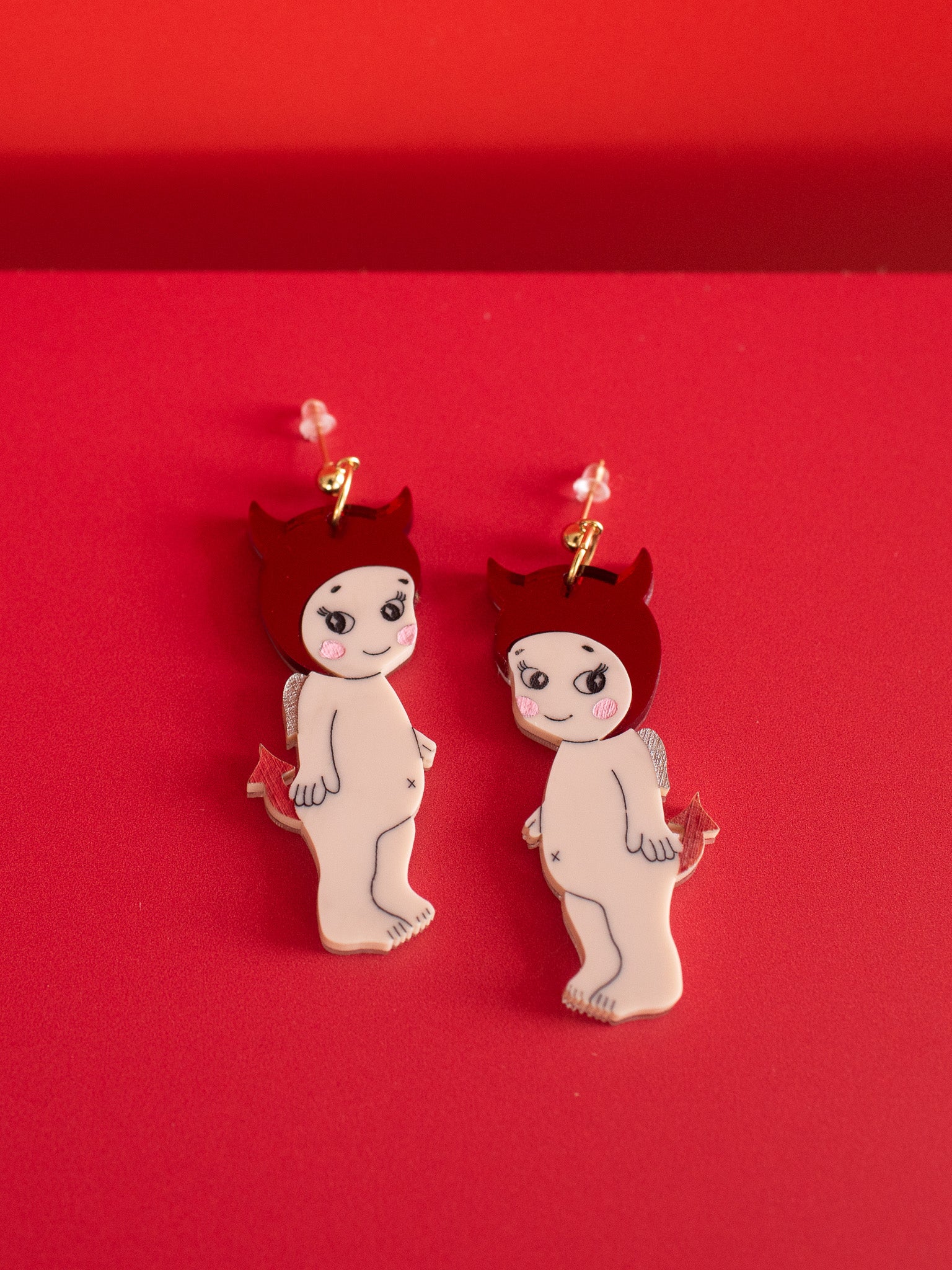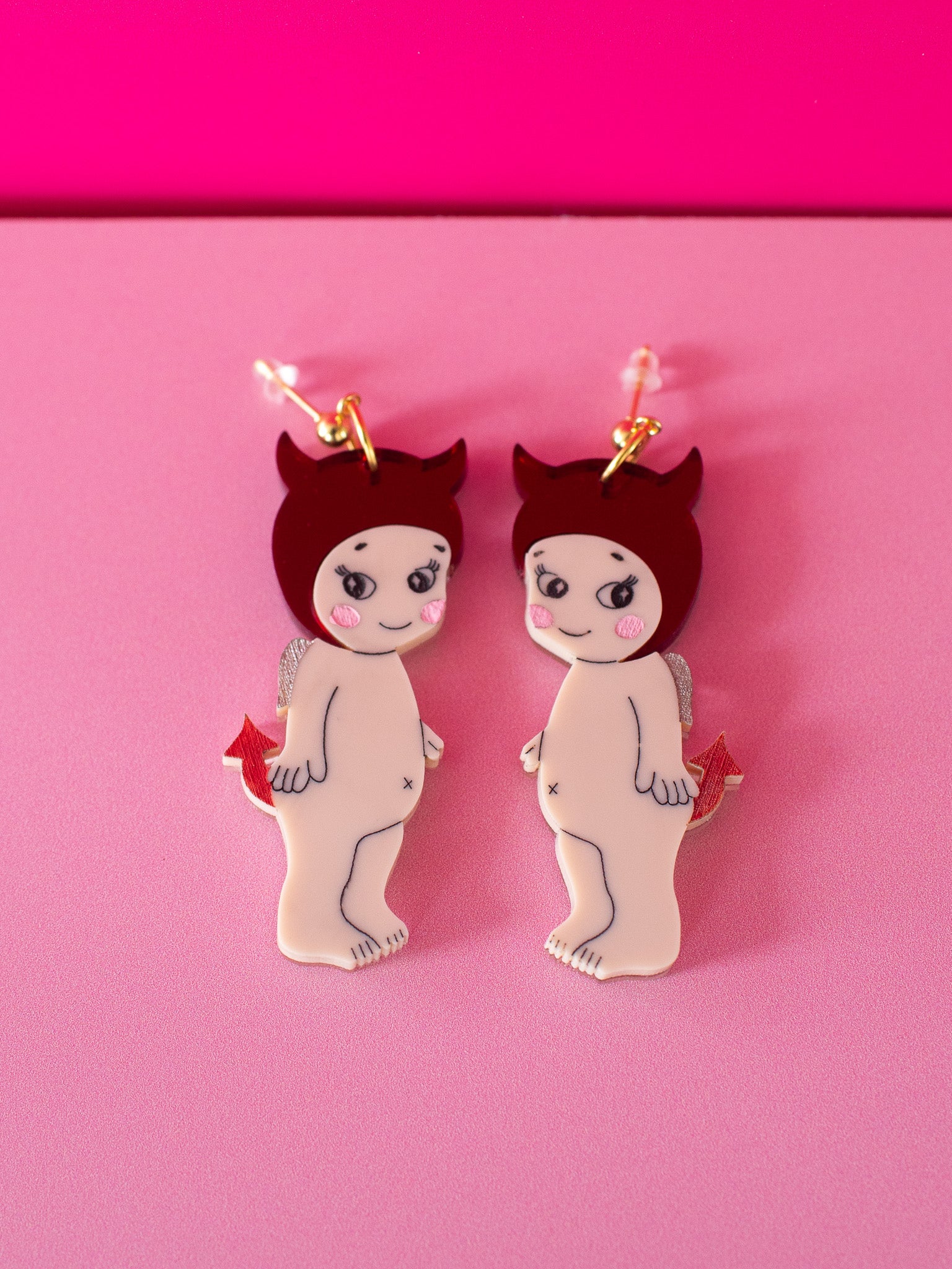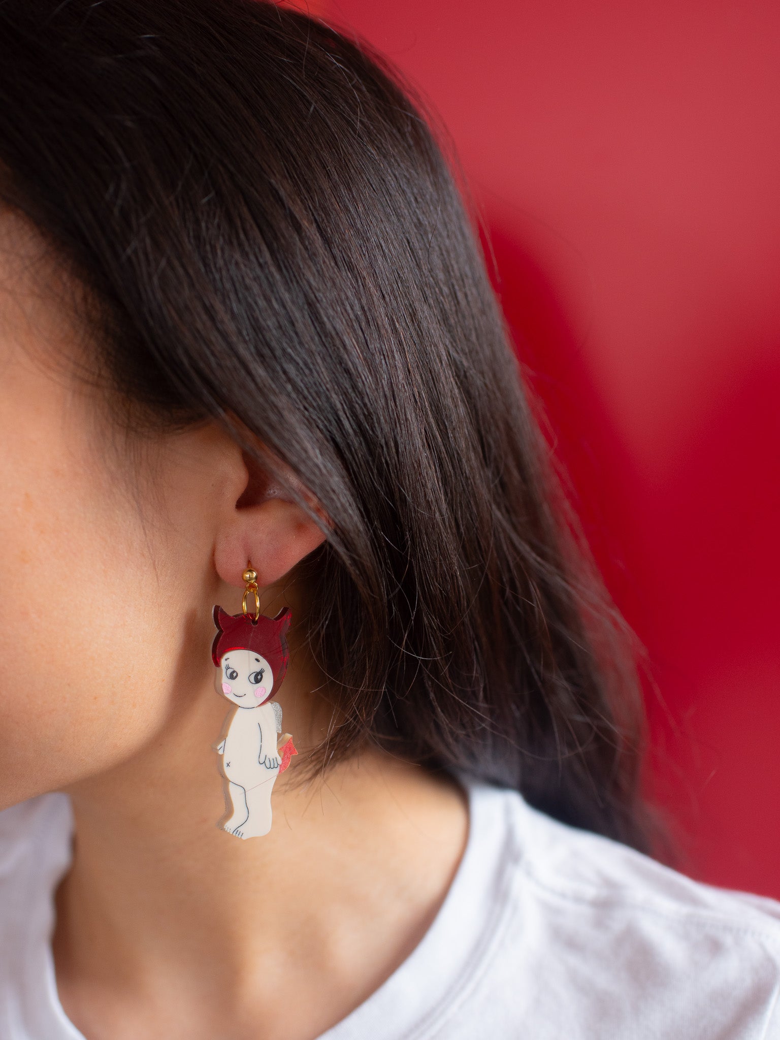 These handmade earrings feature our favorite little angels in devil outfits, horns and all!! You just know they're up to no good! Made from acrylic and 18k gold plated stainless steel.