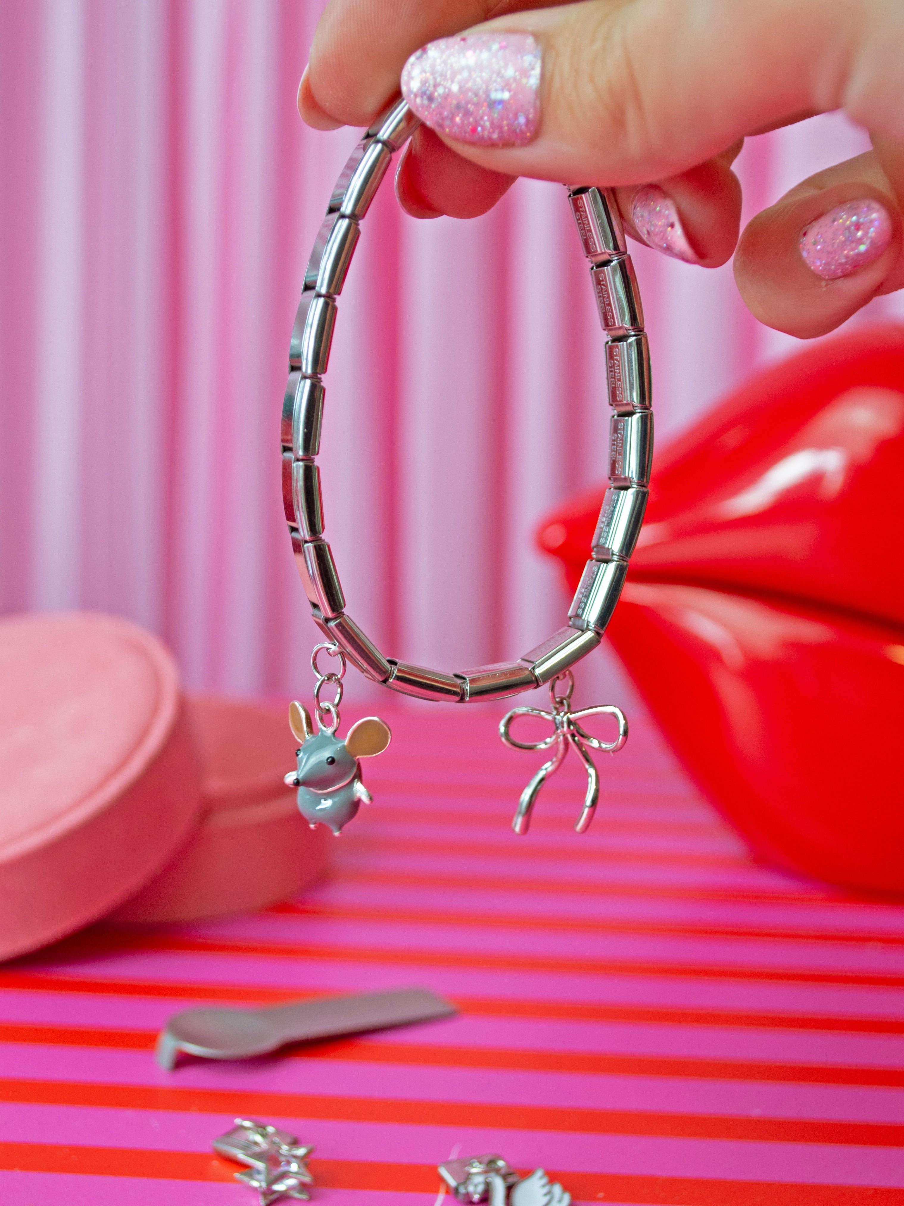 - 4 specialty charm links- mouse, bow, swan, star