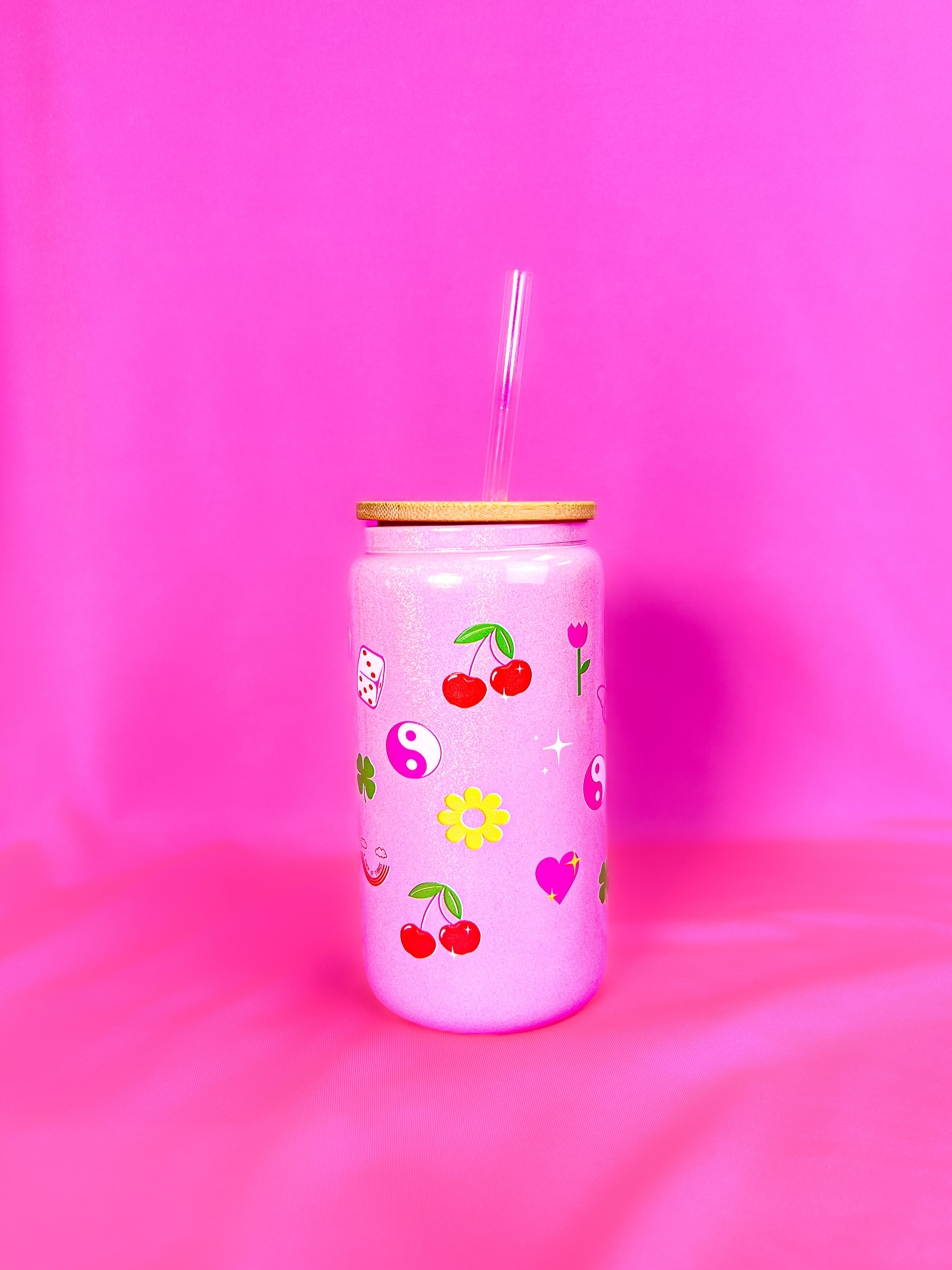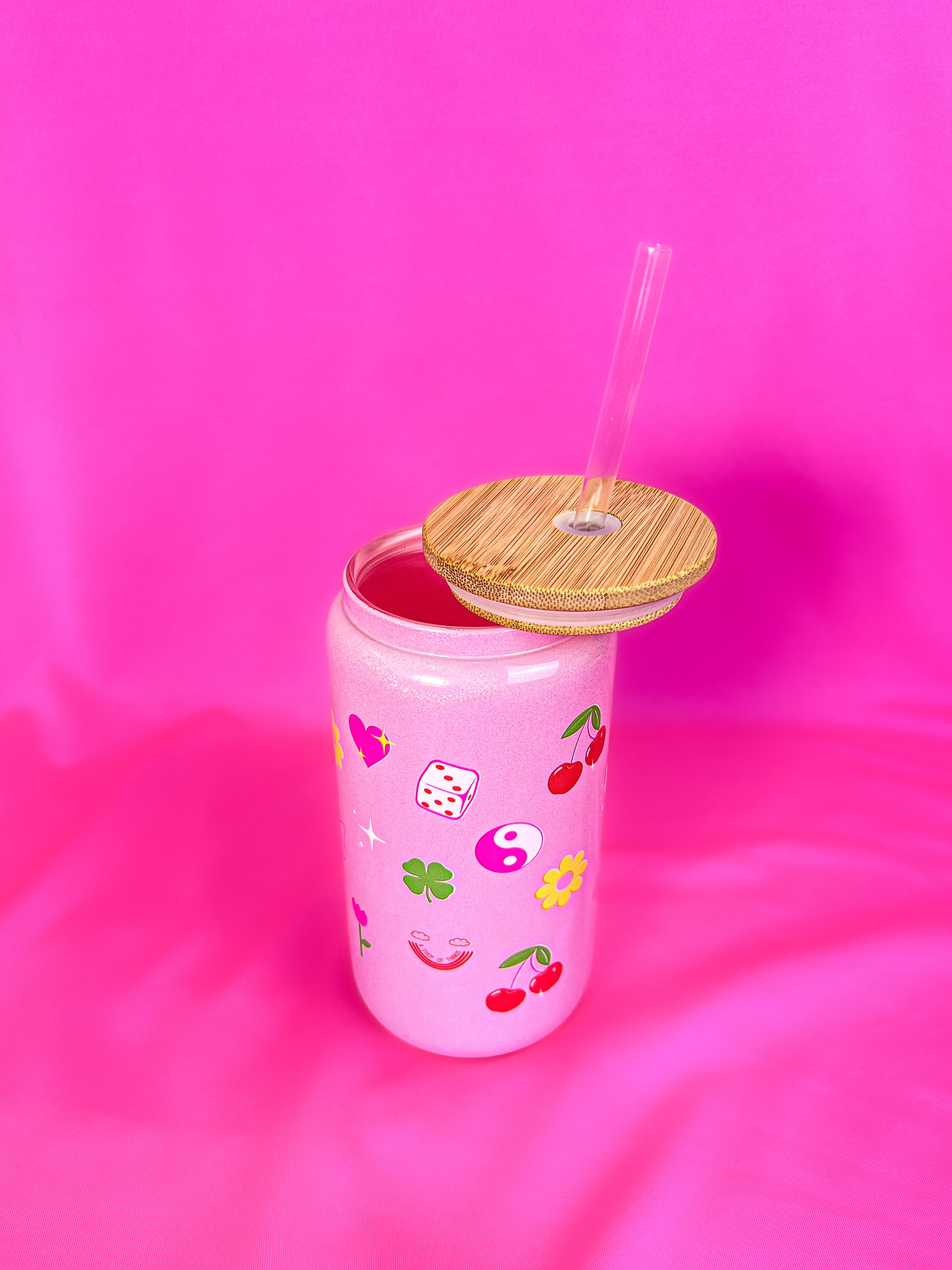 Capacity: 16 oz. Listing is for tumbler, lid, and straw. Made of pink glittery iridescent opaque glass.