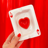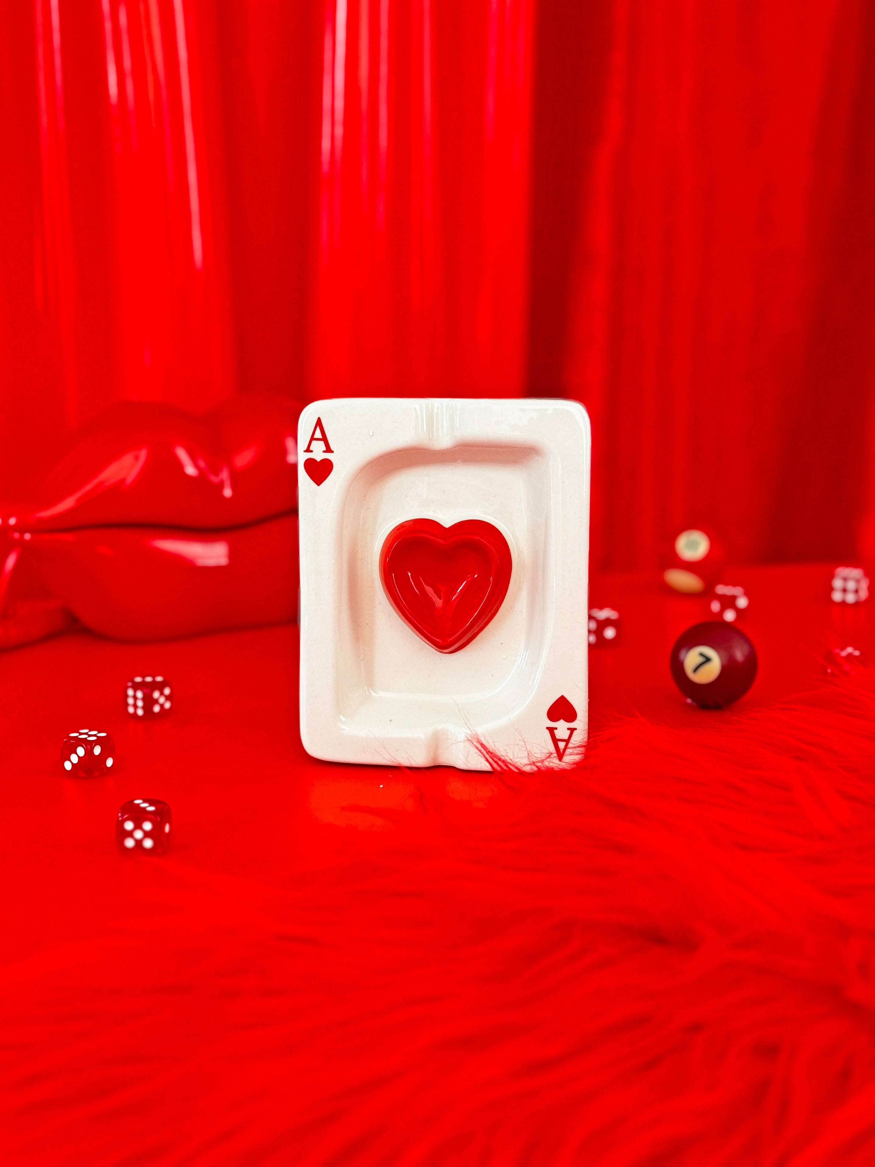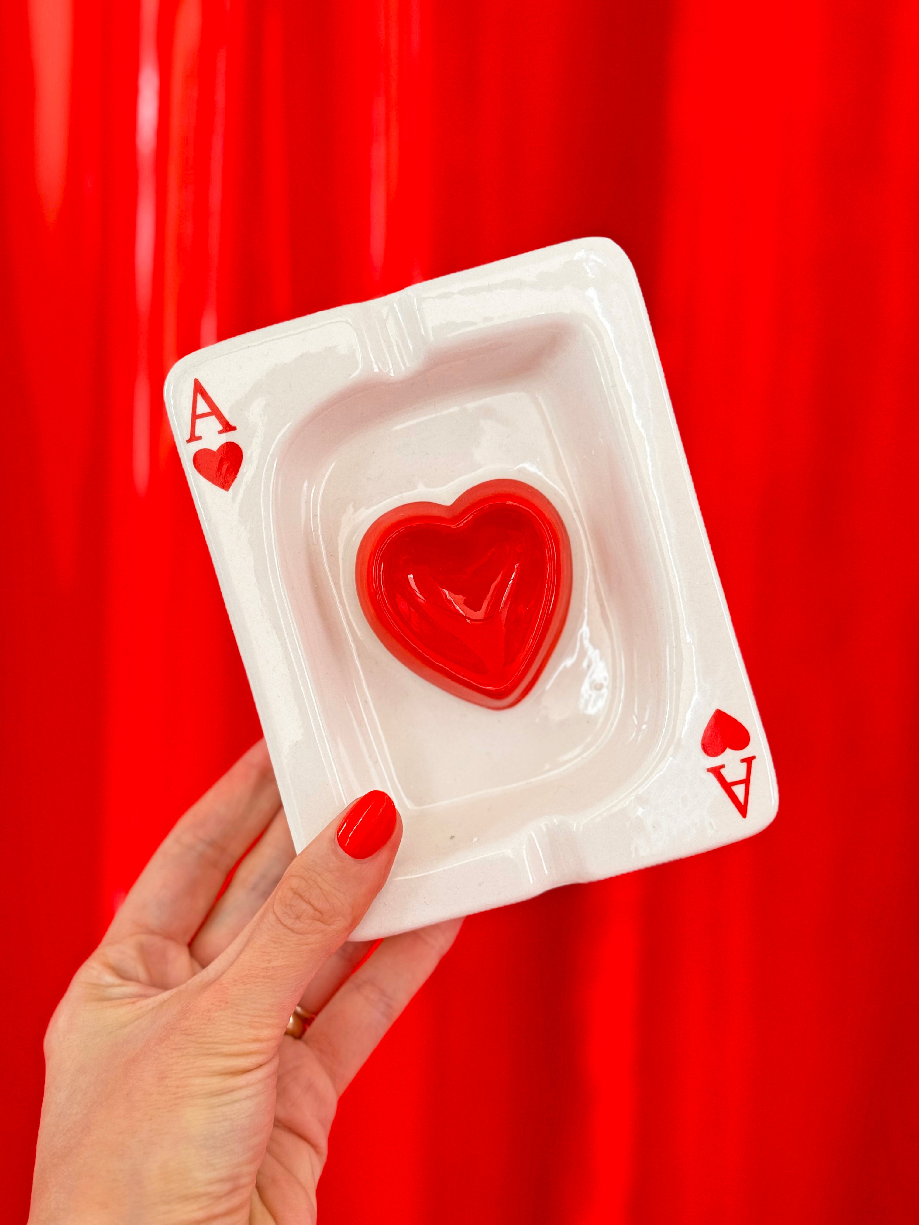 This ash tray brings some perfect vintage vibes. Made entirely of substantial ceramic, this ash tray is decorated with an ace of hearts design and features sculptural elements like the heart in the center and dents to rest your cig.