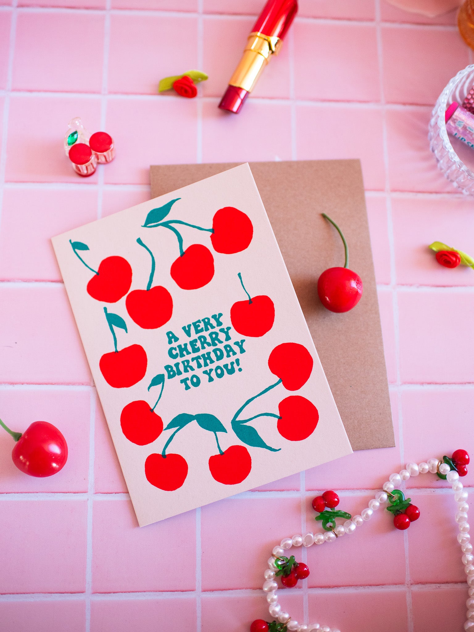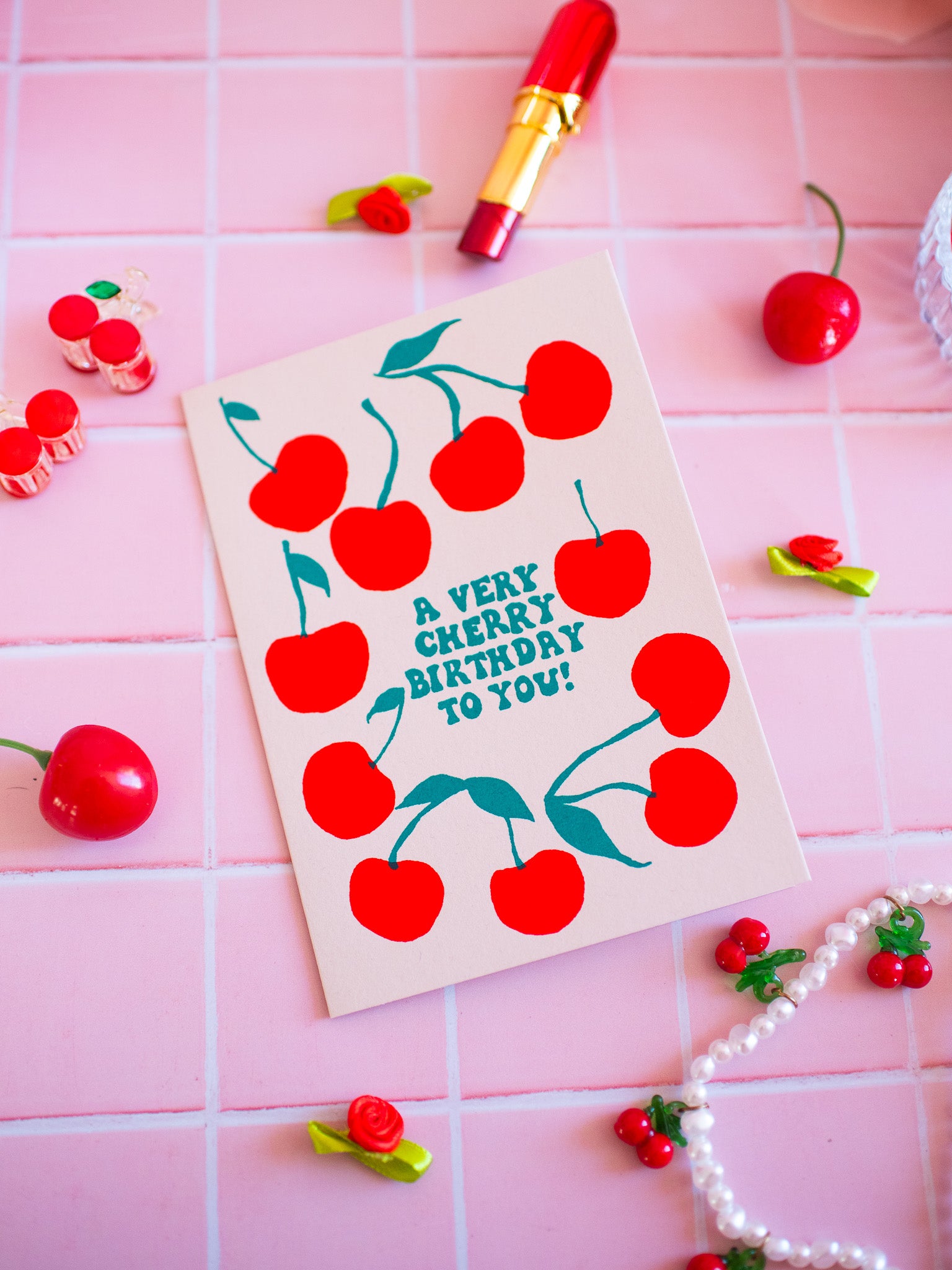 This card is the cutest! It features a bunch red cherries with green stems on a pretty pink card, complete with an even sweeter sentiment, "a very cherry birthday to you!" The perfect birthday card for your sweetest friend!