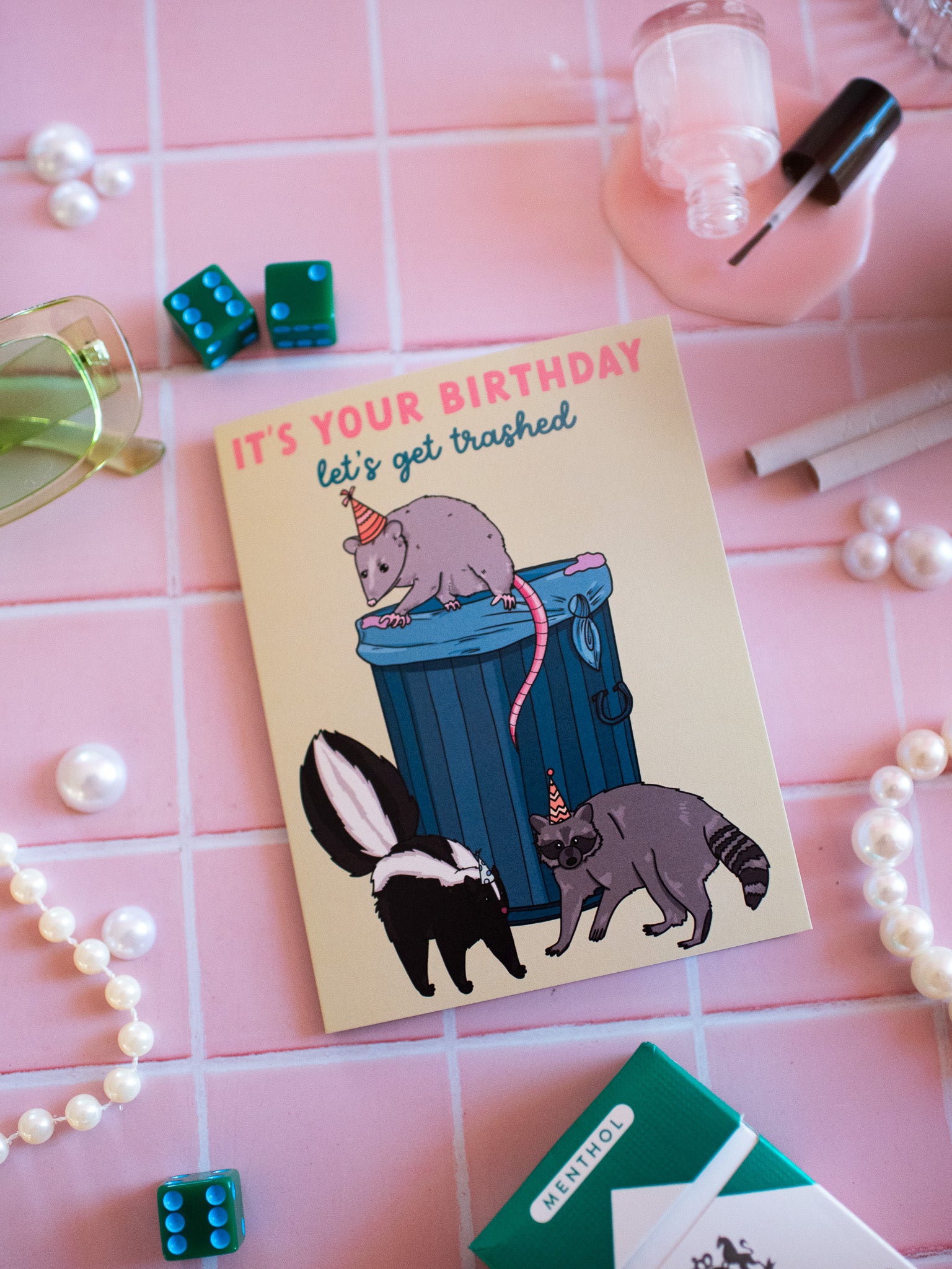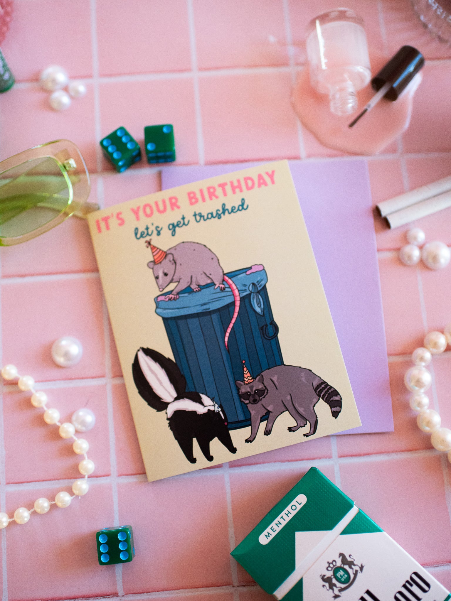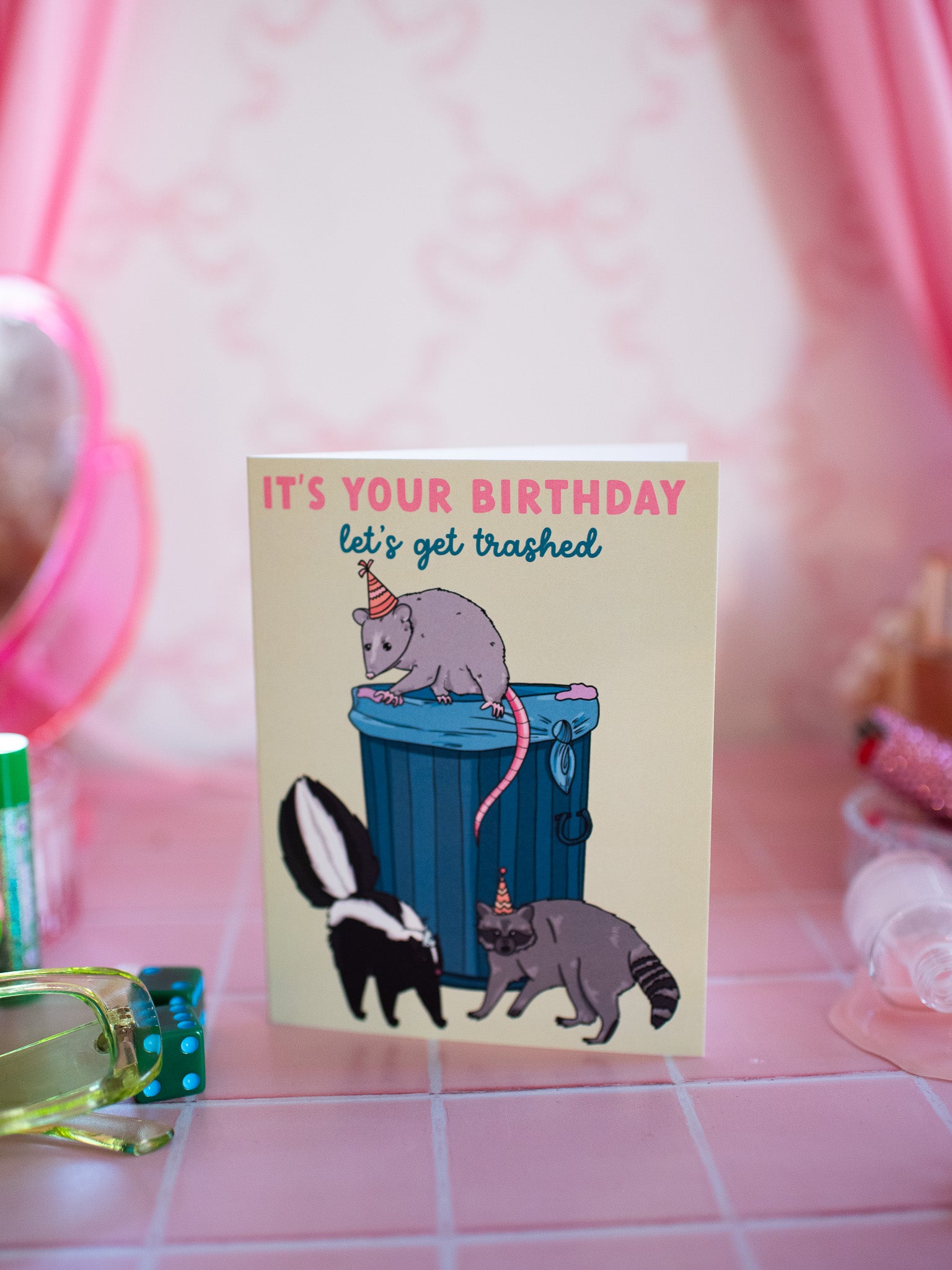 This card is adorable! It features a trashcan surrounded by a cutie raccoon, skunk and opossum wearing party hats and preparing to dig into your birthday feast leftovers! The front of the card reads "It's your birthday let's get trashed". Perfect card for the party animal in your life!