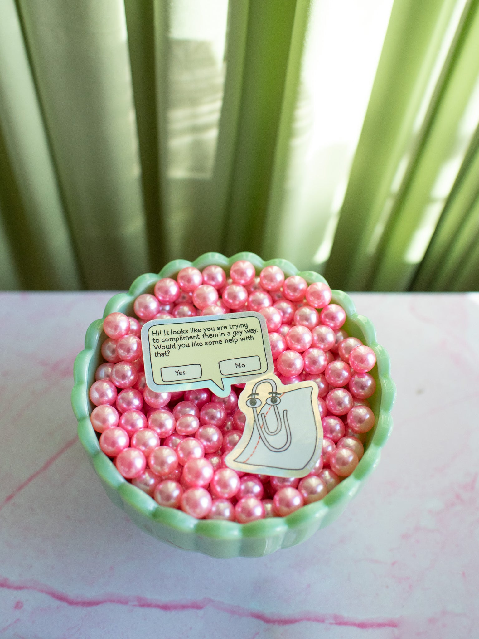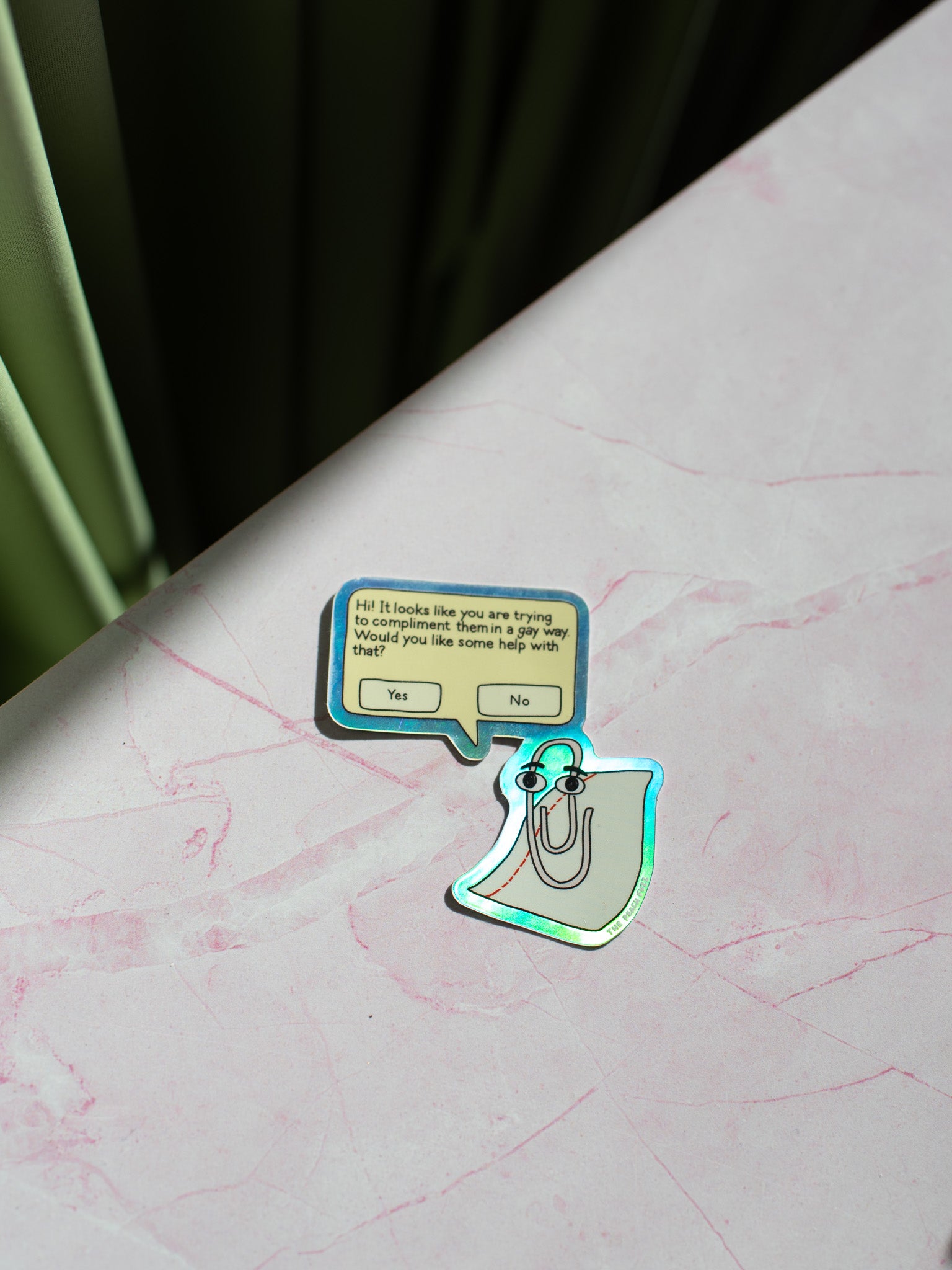 This sticker features everyone's favorite computer assistant, Clippy! It reads "Hi! It looks like you are trying to compliment them in a gay way. Would you like some help with that?"