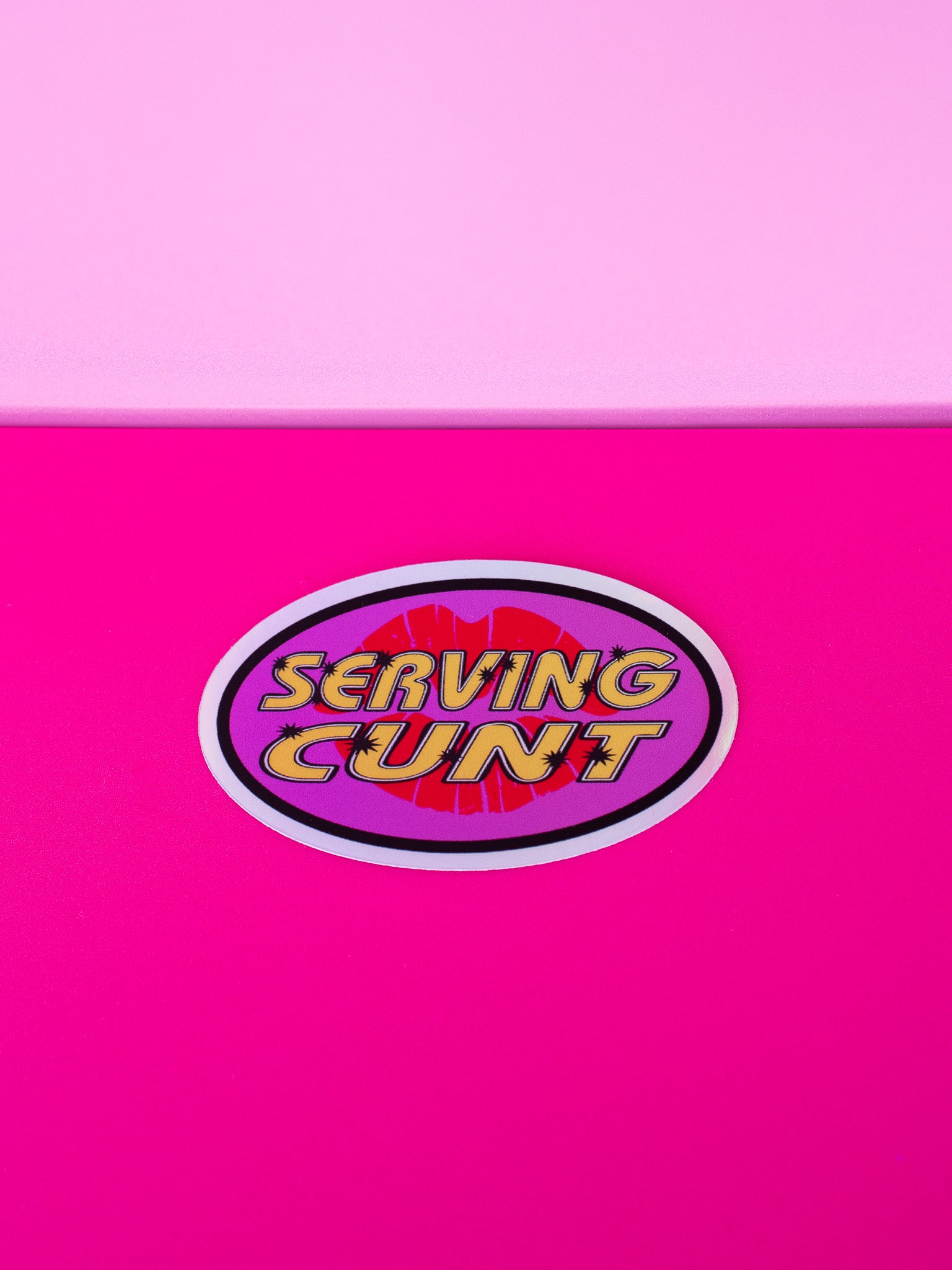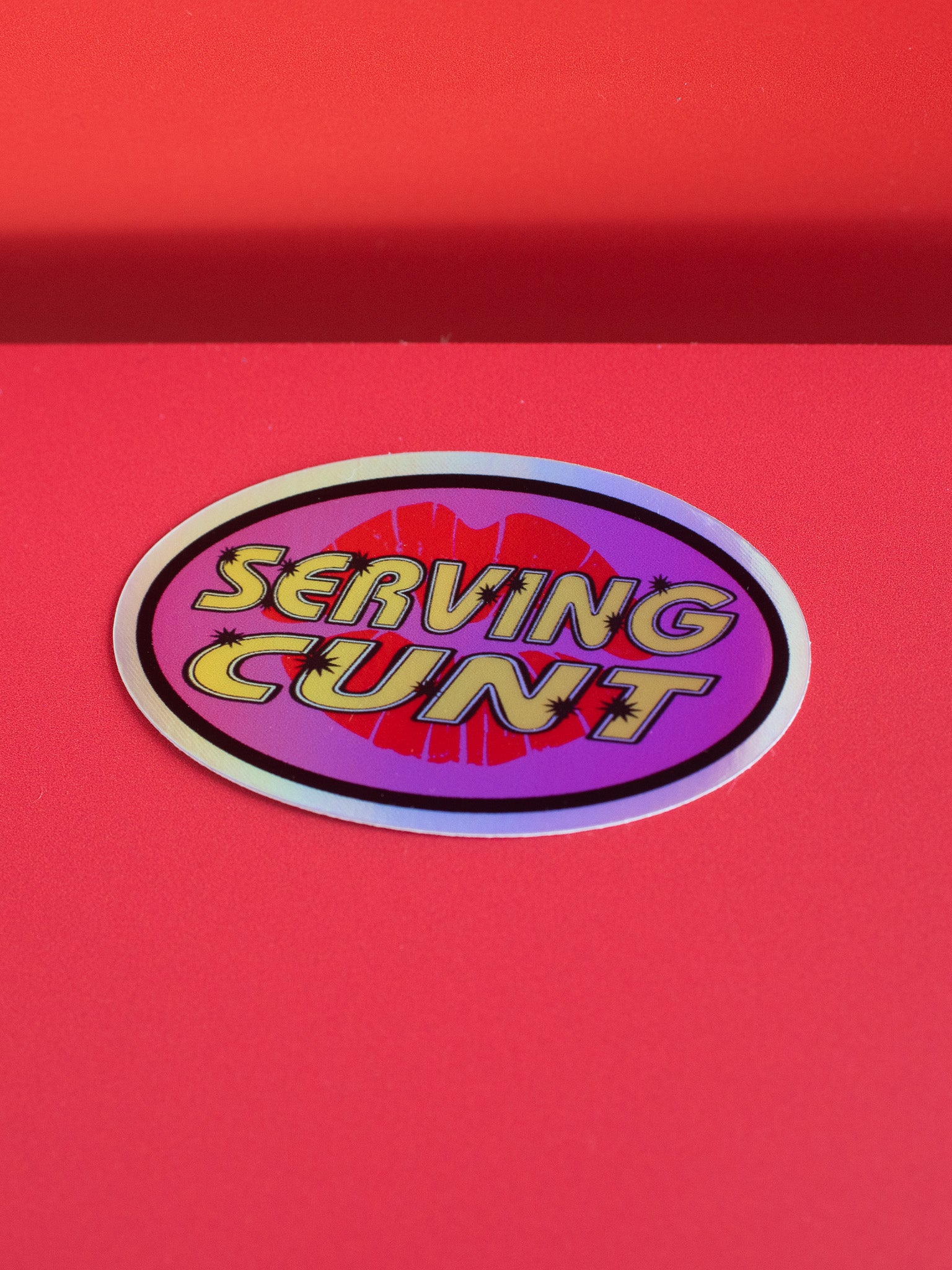 This 90's, retro inspired sticker reads "serving cunt" in holographic glitter!