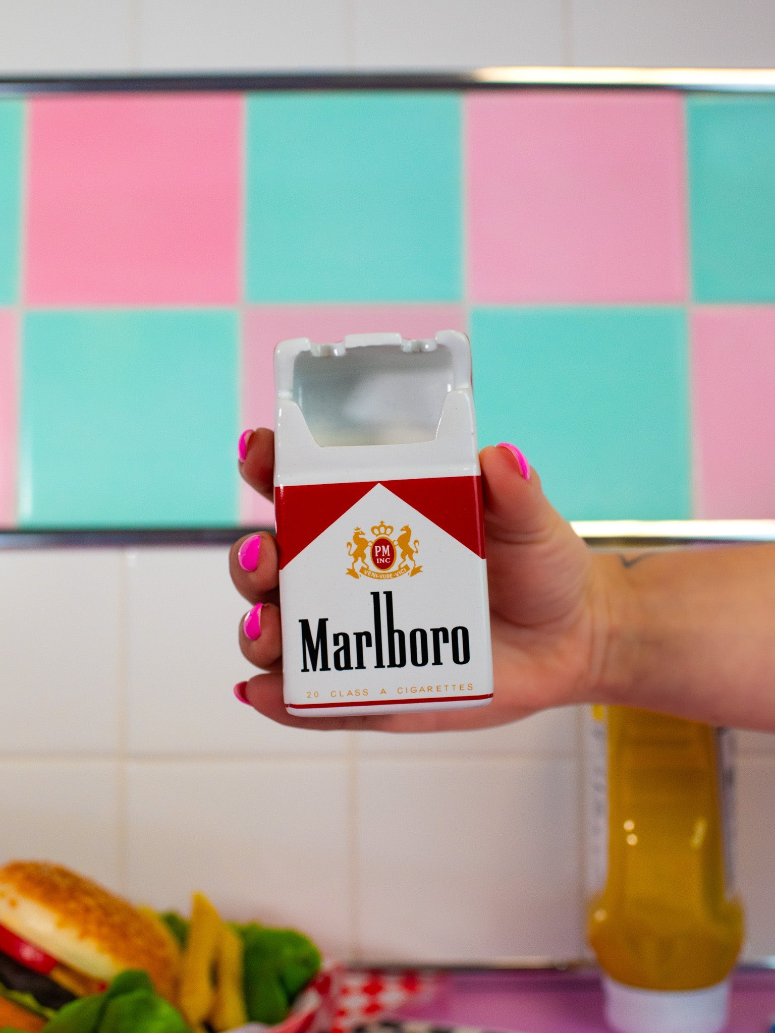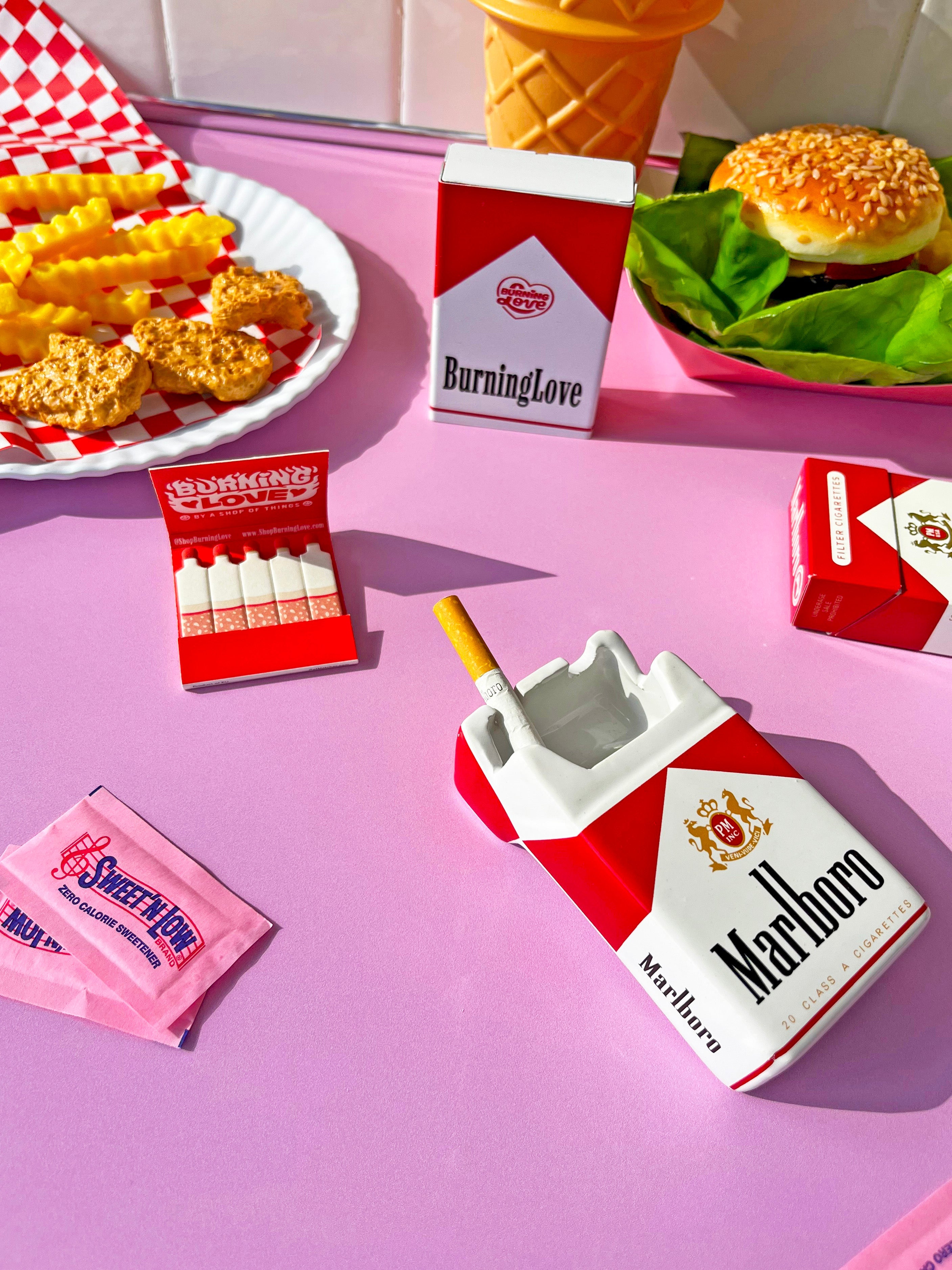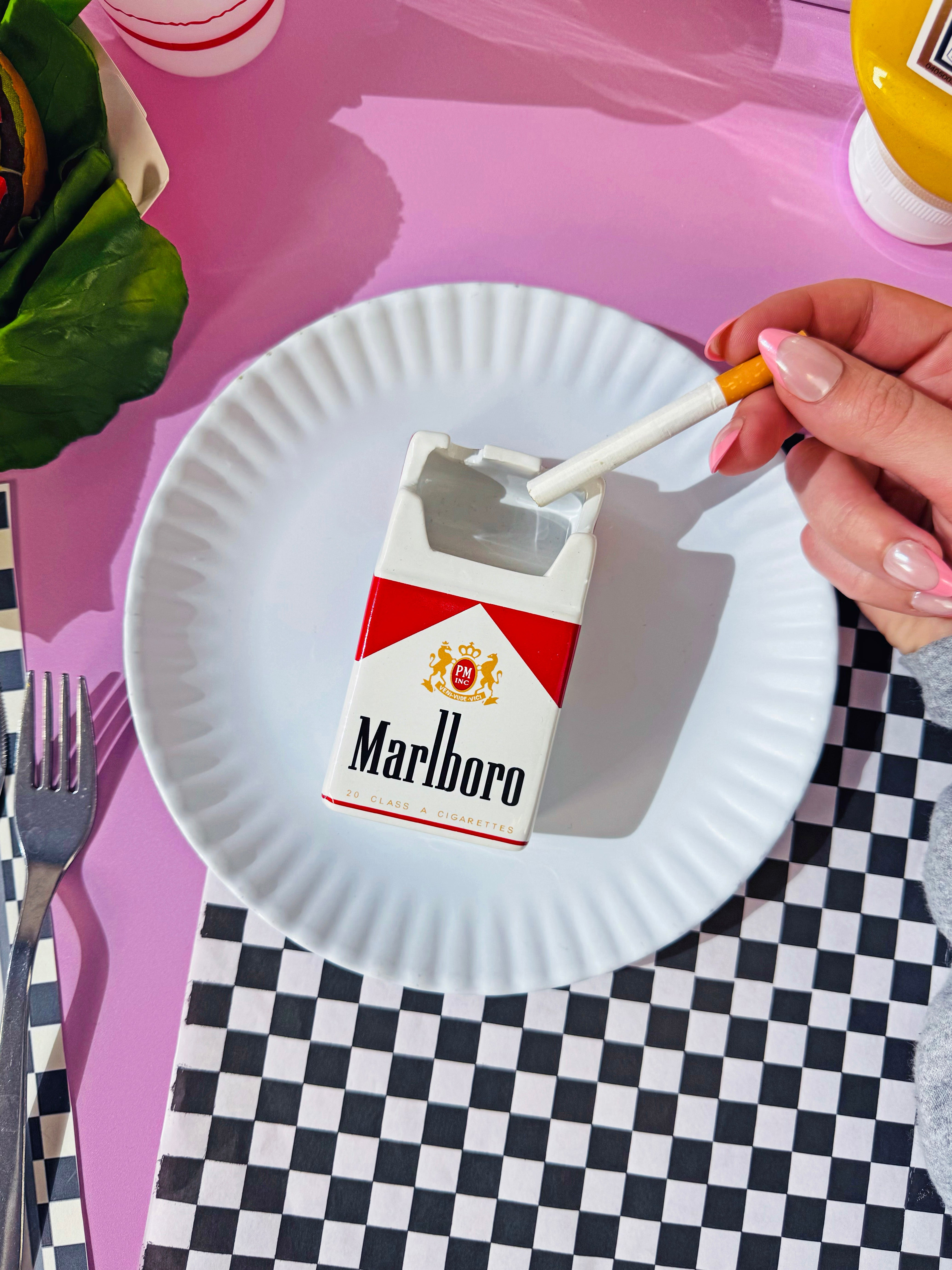 This ash tray brings some perfect vintage vibes. Made entirely of substantial ceramic, this ash tray is decorated to look like a box of your favorite cigs.