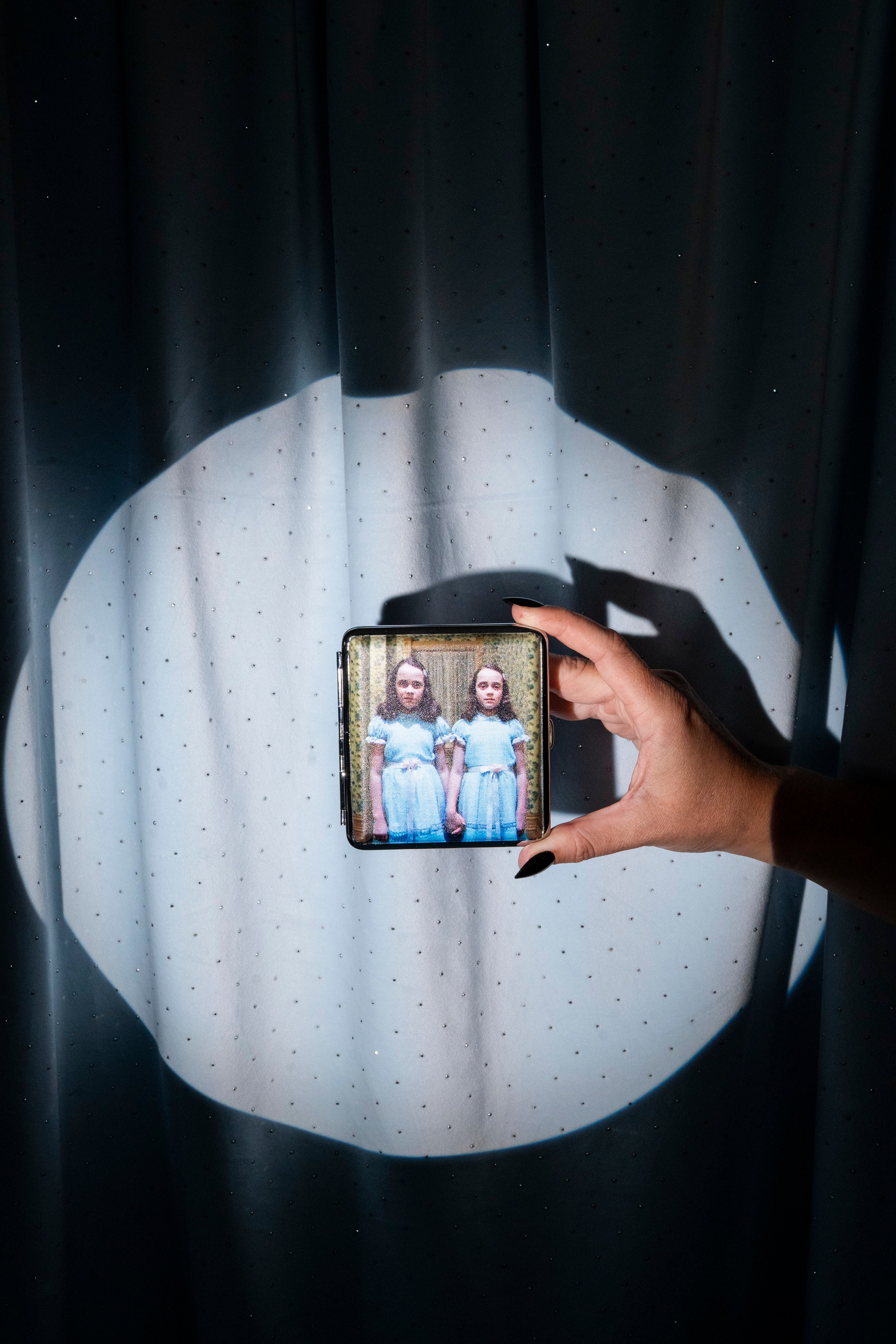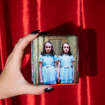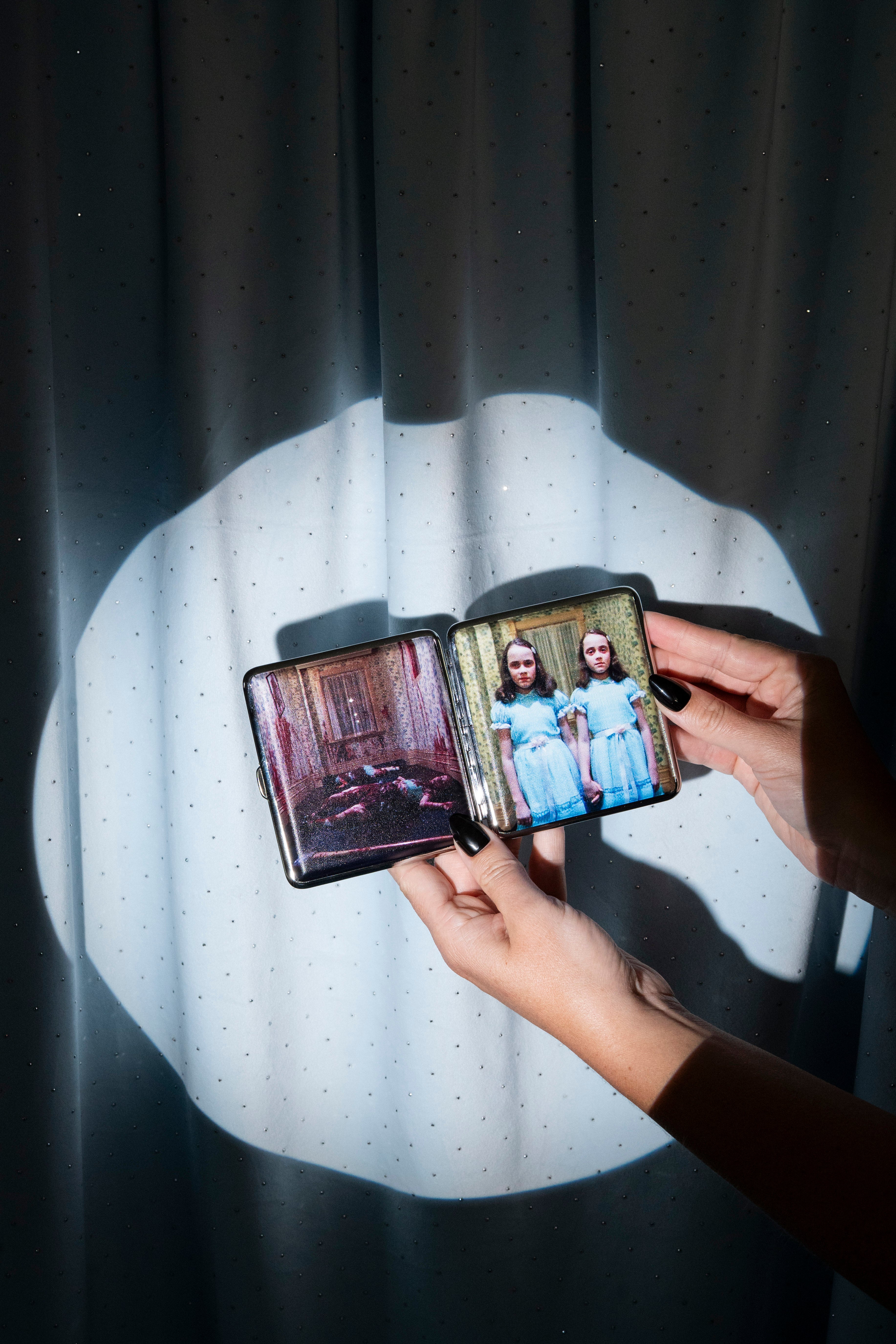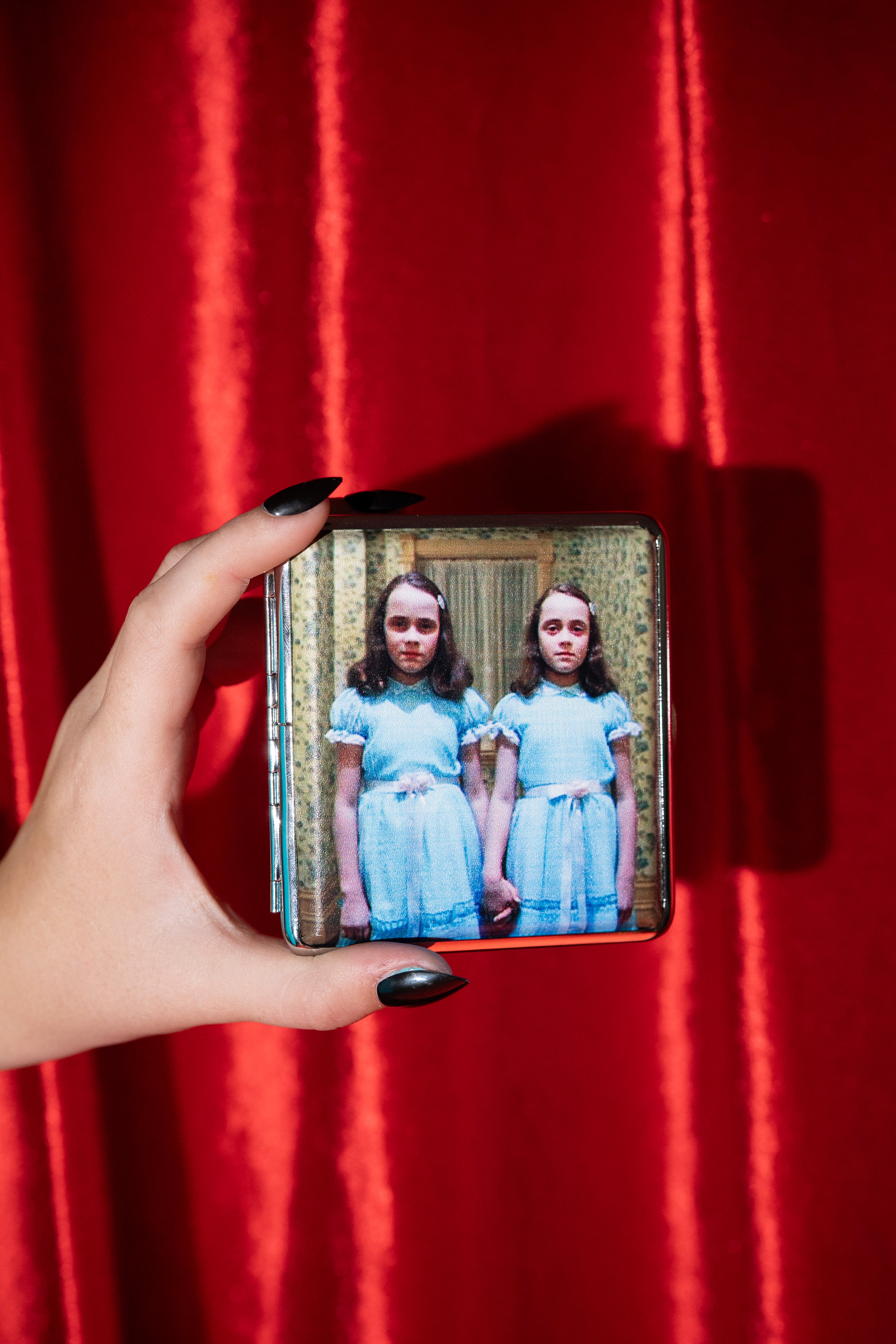 This shining cig case features a before and after of the iconic Grady twins. Perf for holding cigs or prerolls and is slim+discreet enough to toss it in your bag without worry. Also works great for cash, cards, lip gloss, whatever else fits!