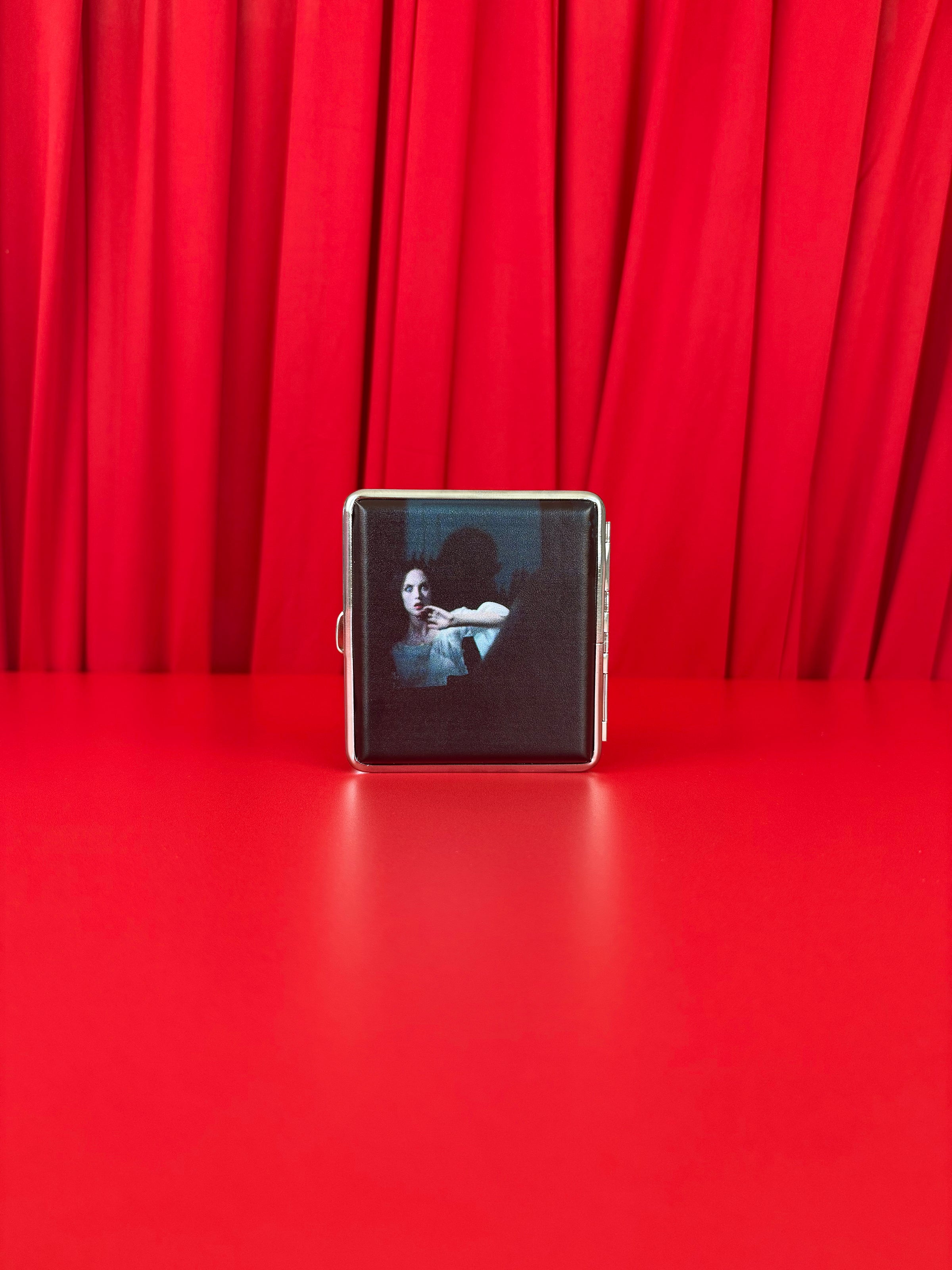 This Nosferatu inspired case features Count Orlok looming over a sleeping Ellen on one side, and her terrified reflection catching sight of him on the other. Perf for holding cigs or prerolls and is slim+discreet enough to toss it in your bag without worry. Also works great for cash, cards, lip gloss, whatever else fits!