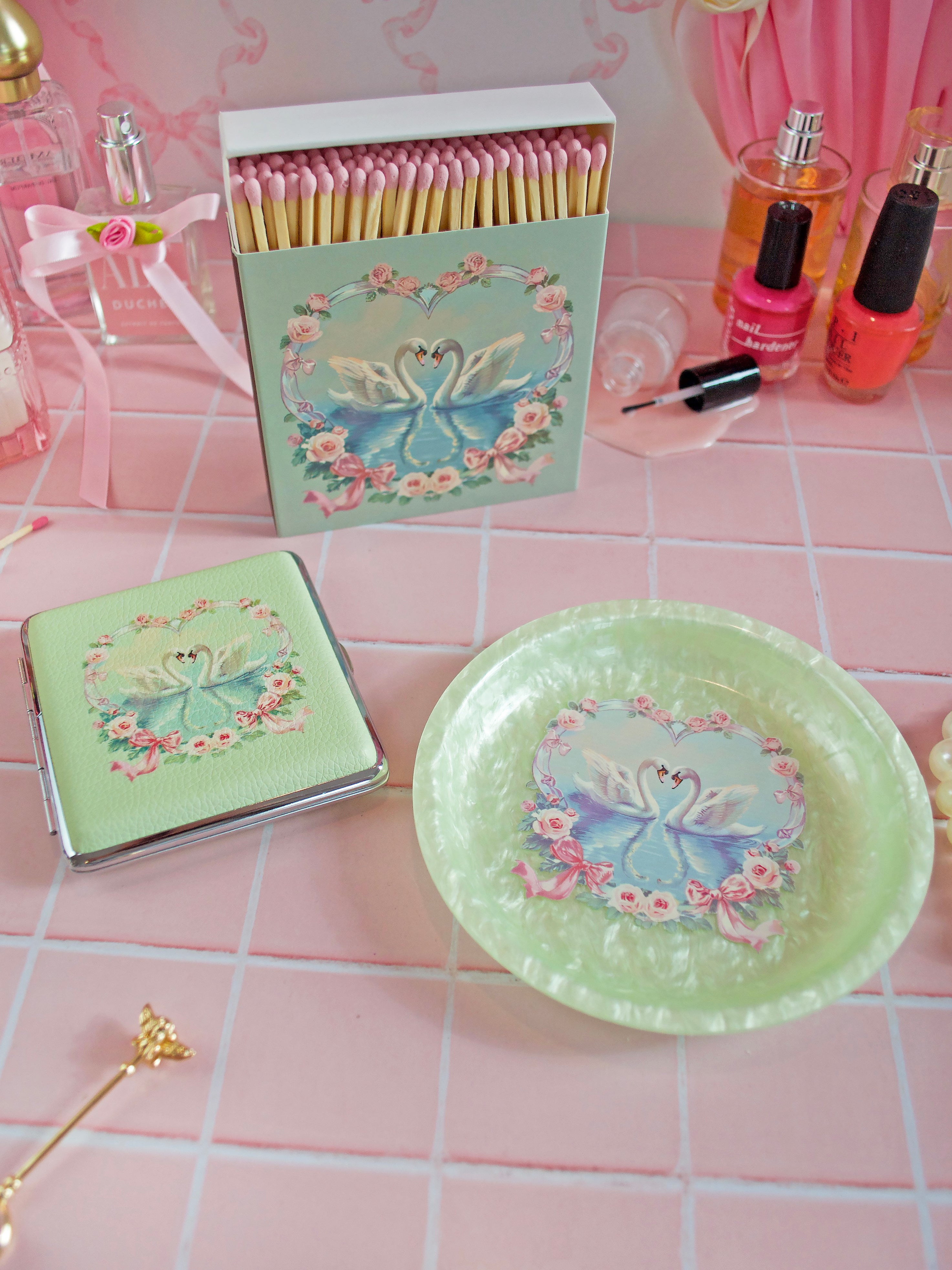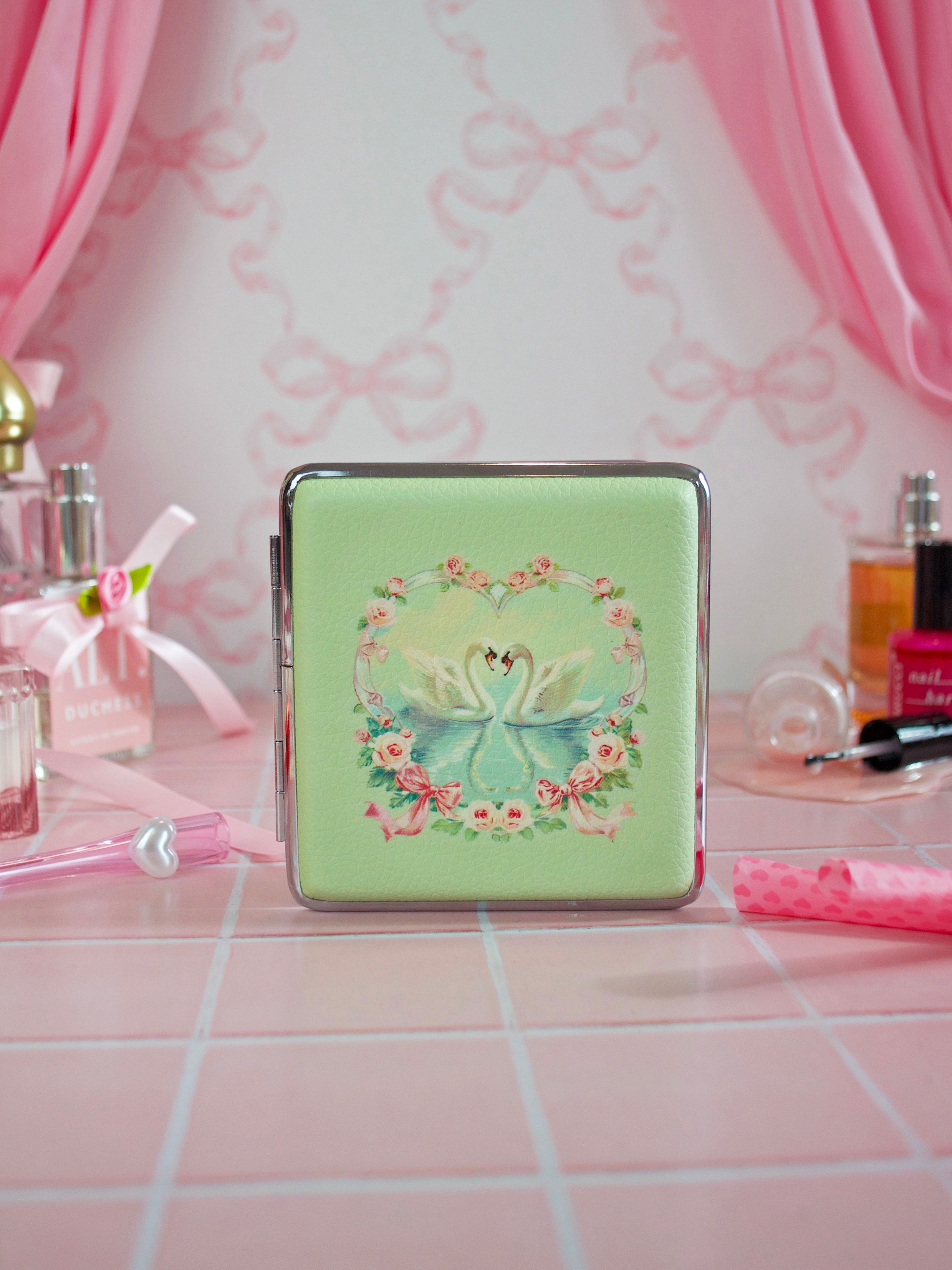 Comes in a pretty, minty green color and features the sweetest image of two swans framed by a heart that is decorated with pink roses and bows! Pulled straight out of our coquette dreams!