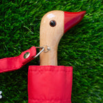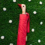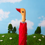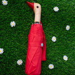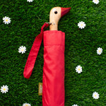The handle of this umbrella is carved to look just like a duck! The canopy comes in a bright red color and is made from 100% recycled fabric! Perfectly compact to fit in any backpack or tote bag. Also comes with a sleeve and wrist strap for easy storage!