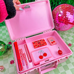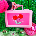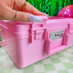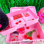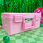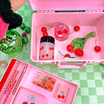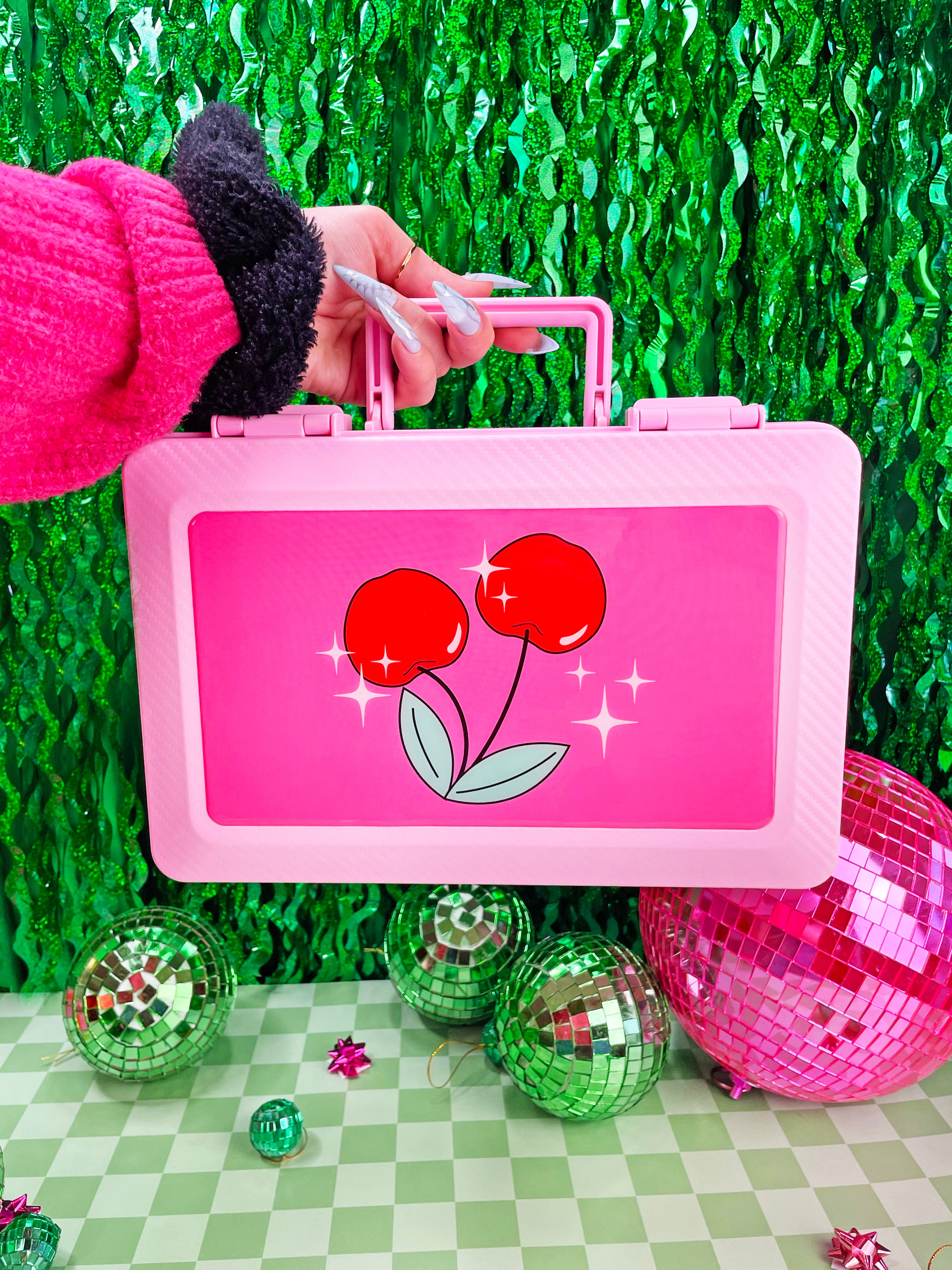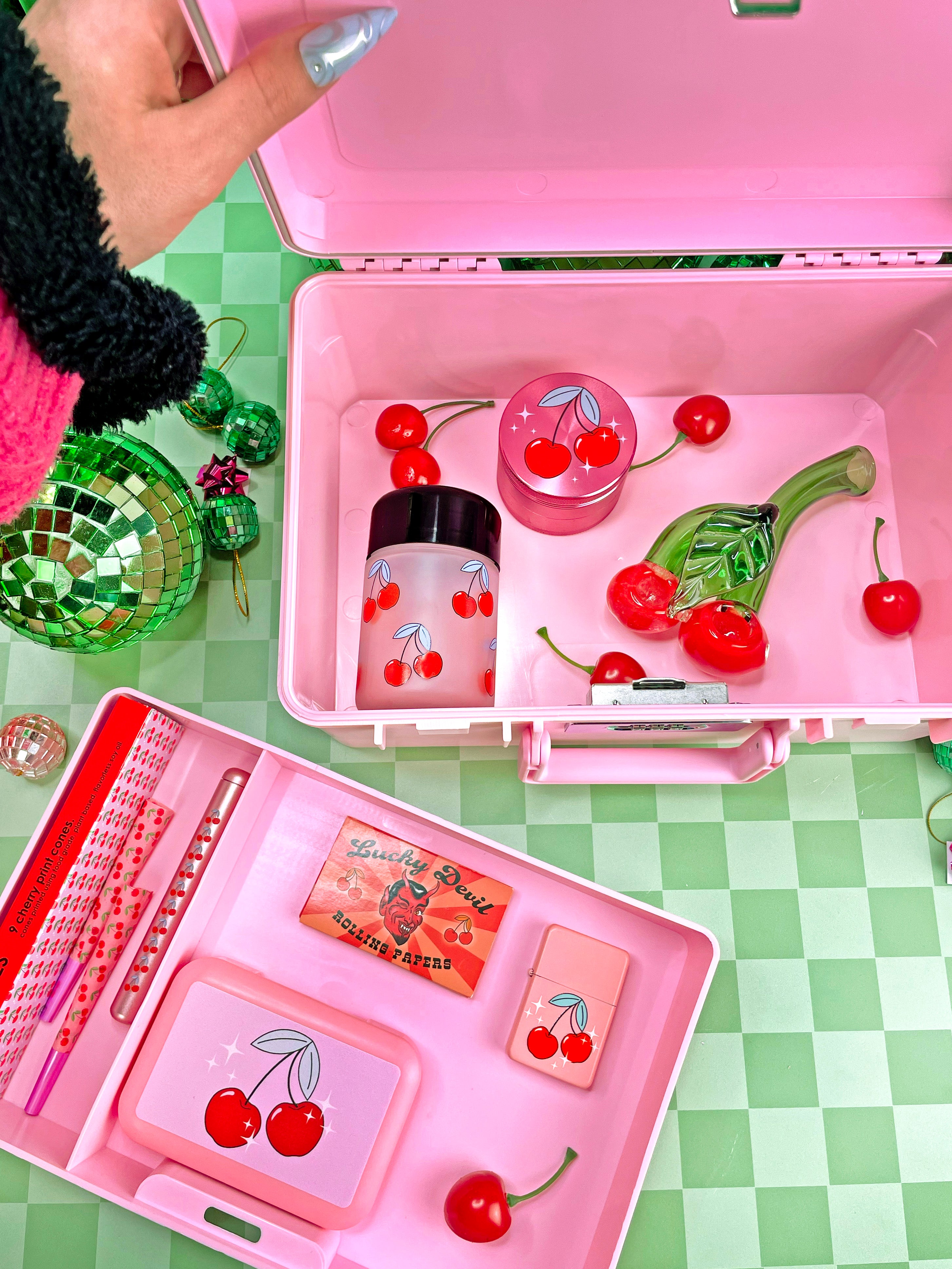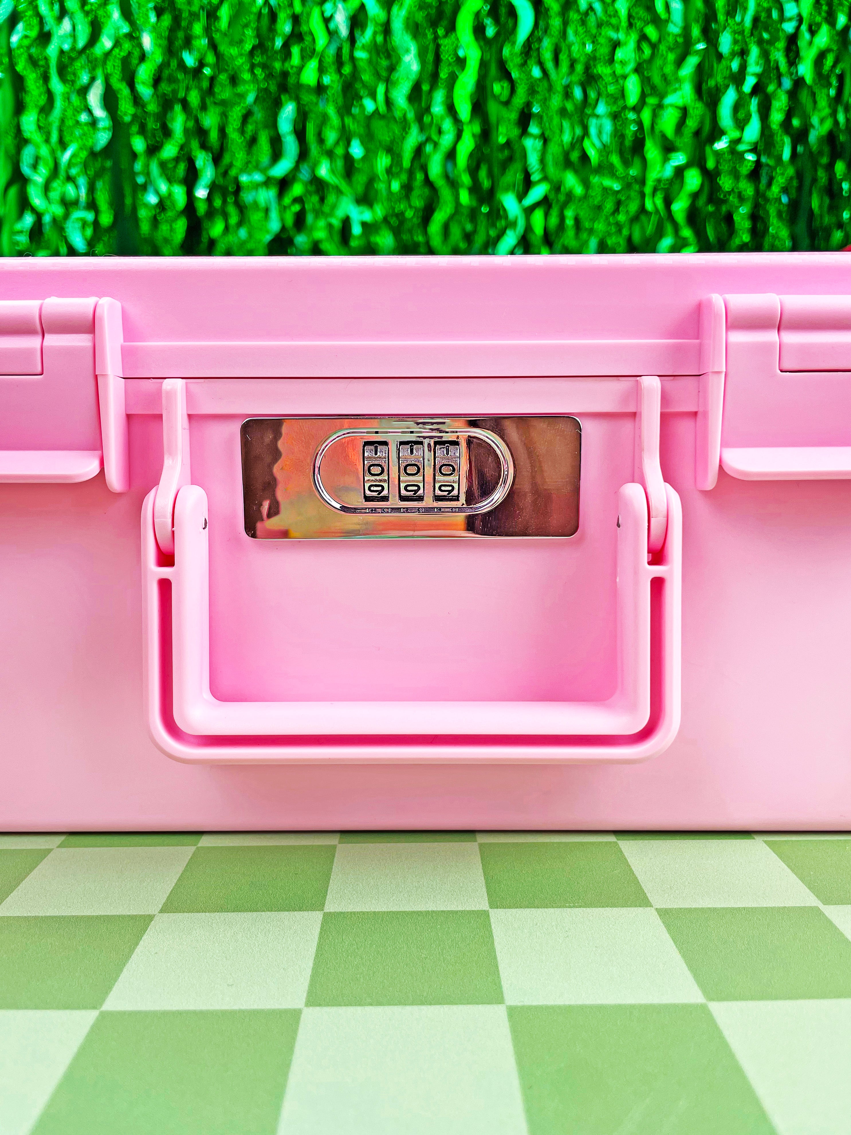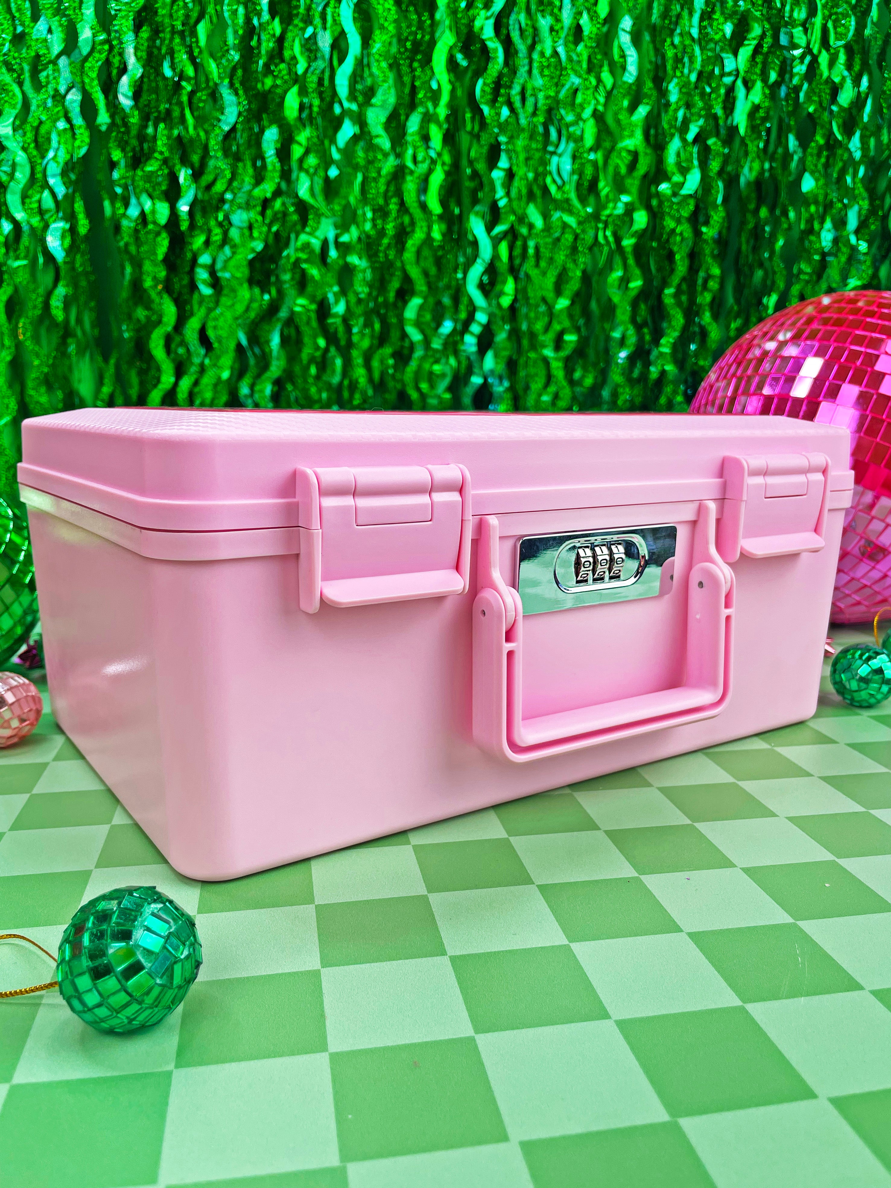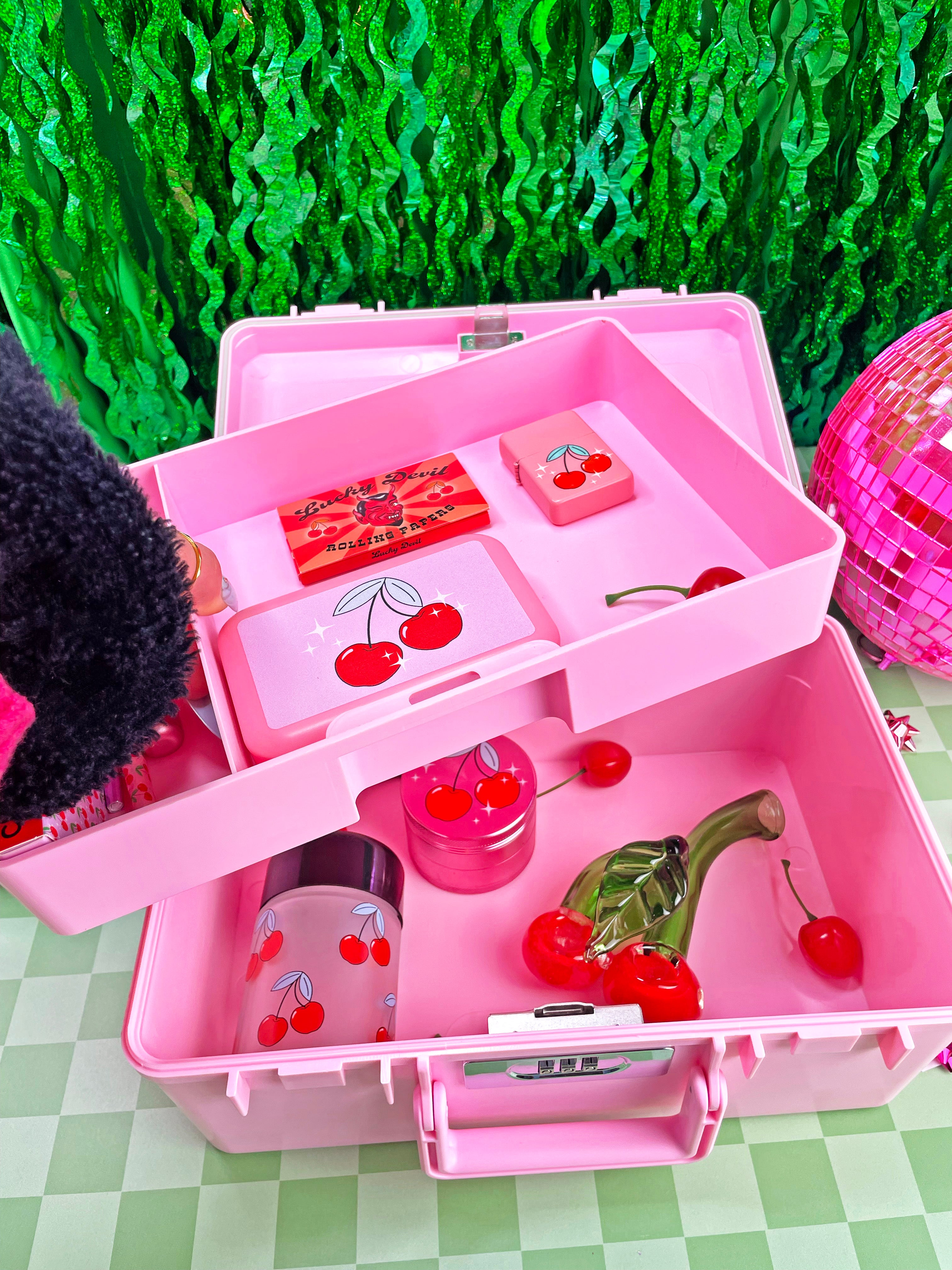 This box is huge and such an upgrade from the random box you found lying around your house to store your goods in (we see you, we are you). Sleep easy knowing your stash is safe inside this combination-style lockbox. Comes with a removable compartment for two tiers of storage capacity! The box is a light pink with hot pink and red cherry design on the top!
