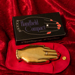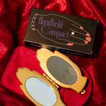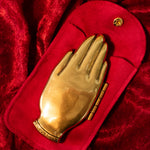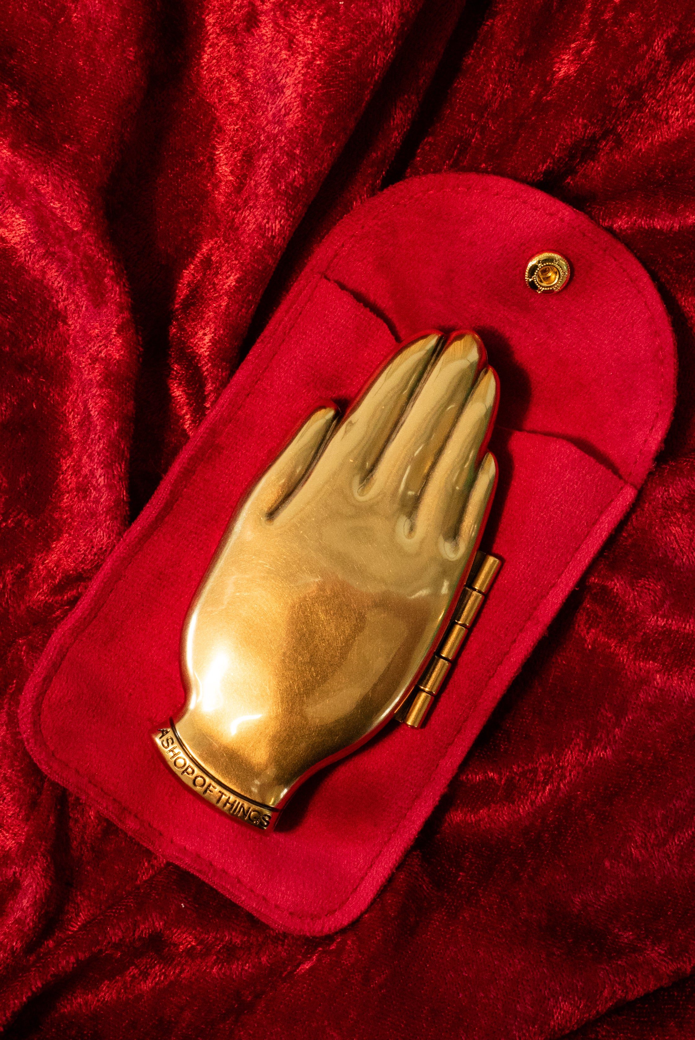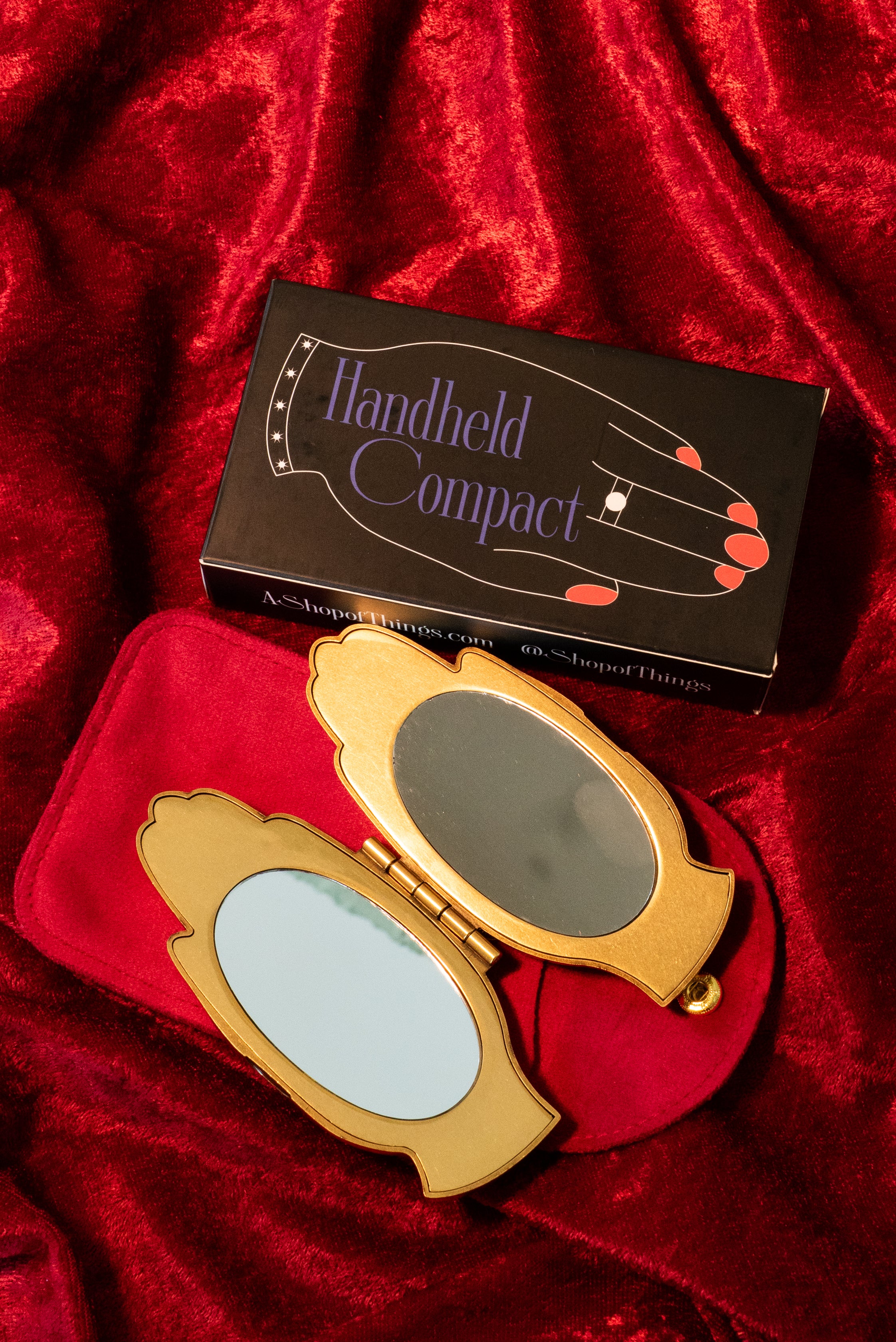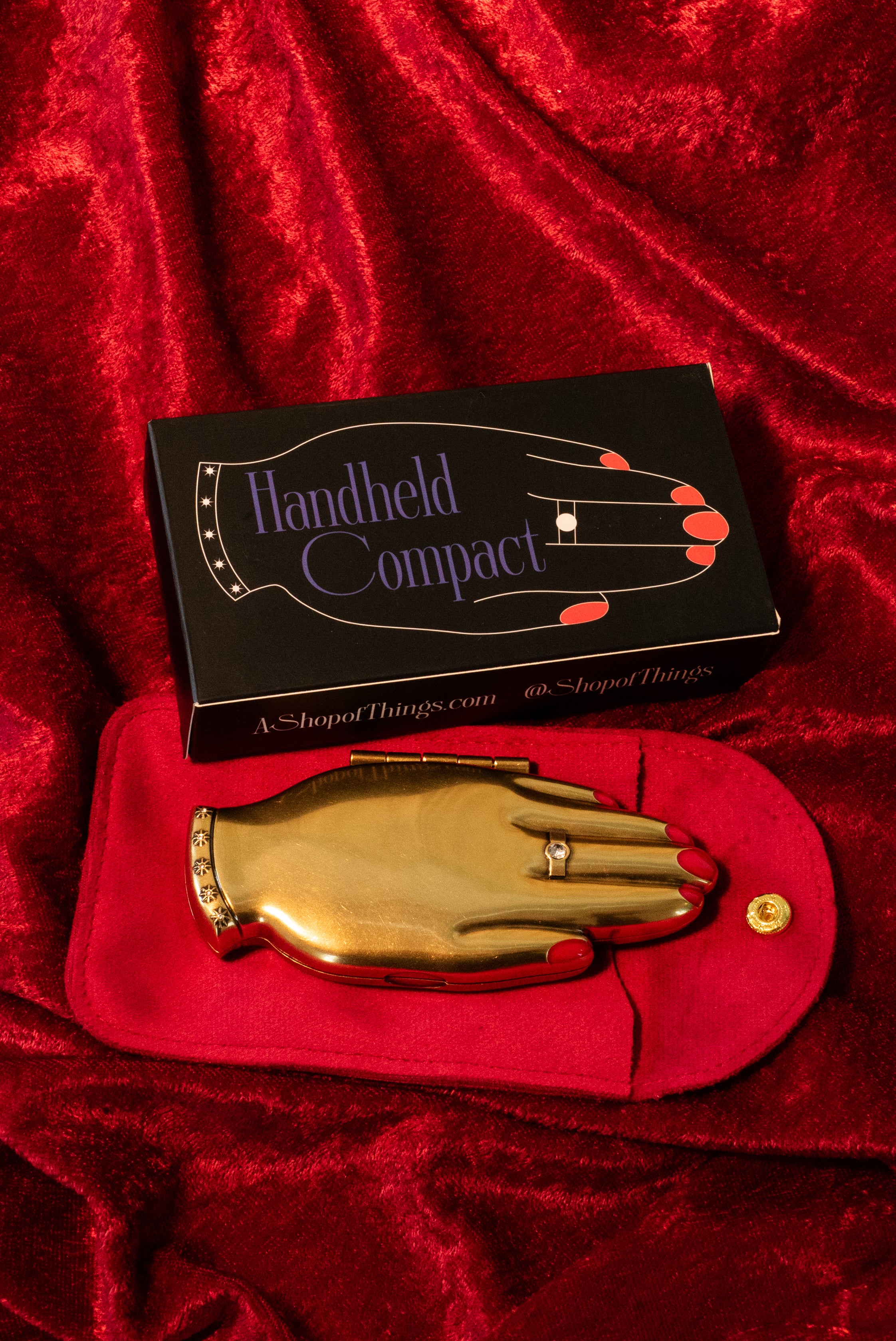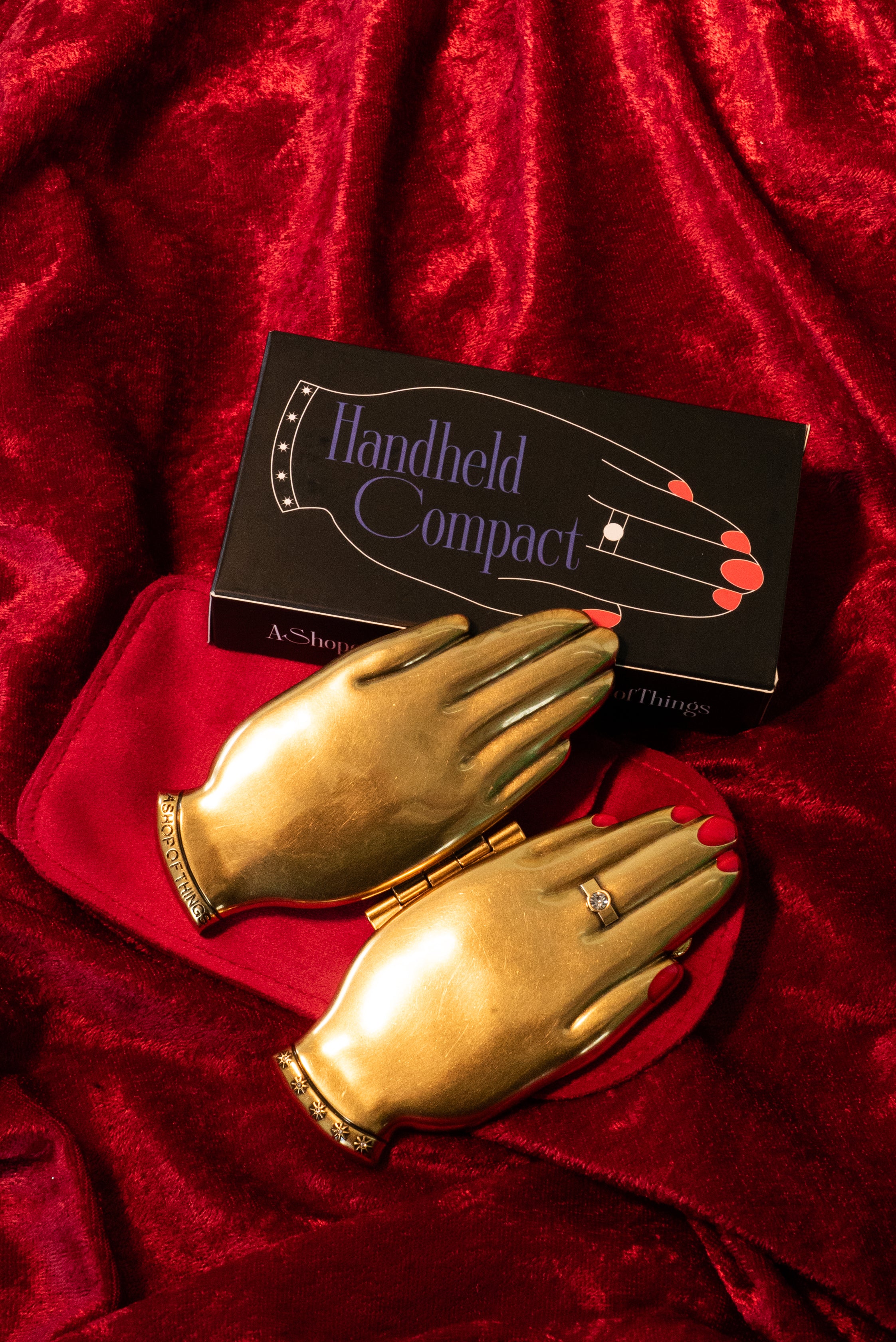 This hand-shaped mirror is inspired by vintage gesture compacts! She's got a beautiful brushed gold finish and features a bright red manicure and engraved jewelry details. Open up the compact to reveal two little mirrors inside, one is magnifying!