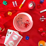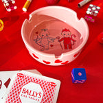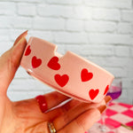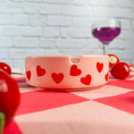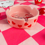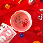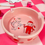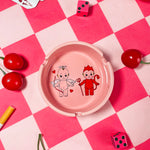 The angel and devil on your shoulder, but make 'em cute! These classic ash trays feature indents for cigs, joints, matches, etc. They are made of ceramic with pink glaze and feature two kewpies in the center. Red hearts decorate the outside of the tray :)
