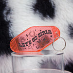 This keychain says "let's go girls" in on a glittery hot coral motel keychain.