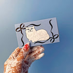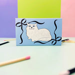 The match box features the same art on the front and back, a kitty cat with some cute bows. On the side of the matchbox is a striker and inside are special black/white and pink large match sticks.
