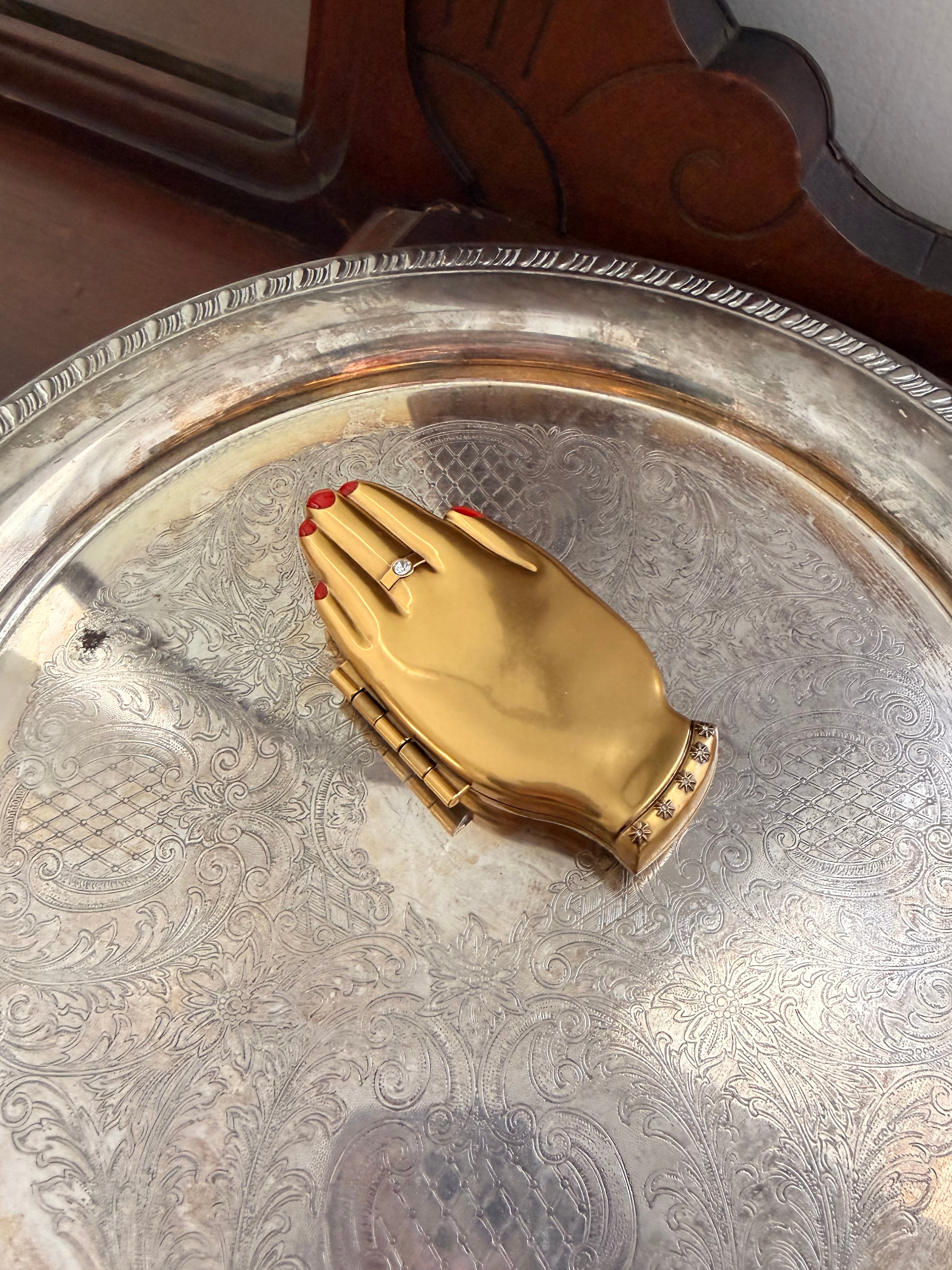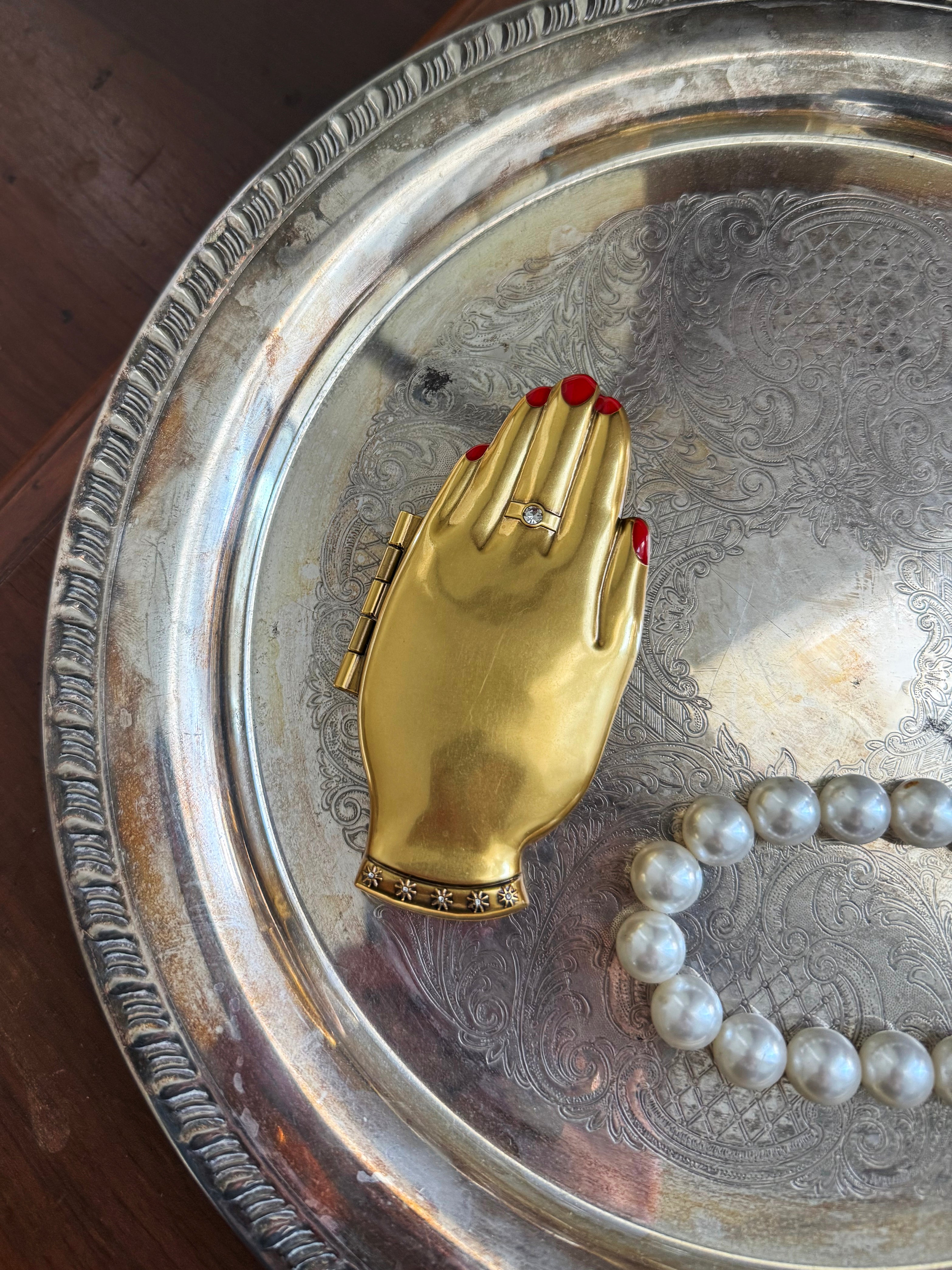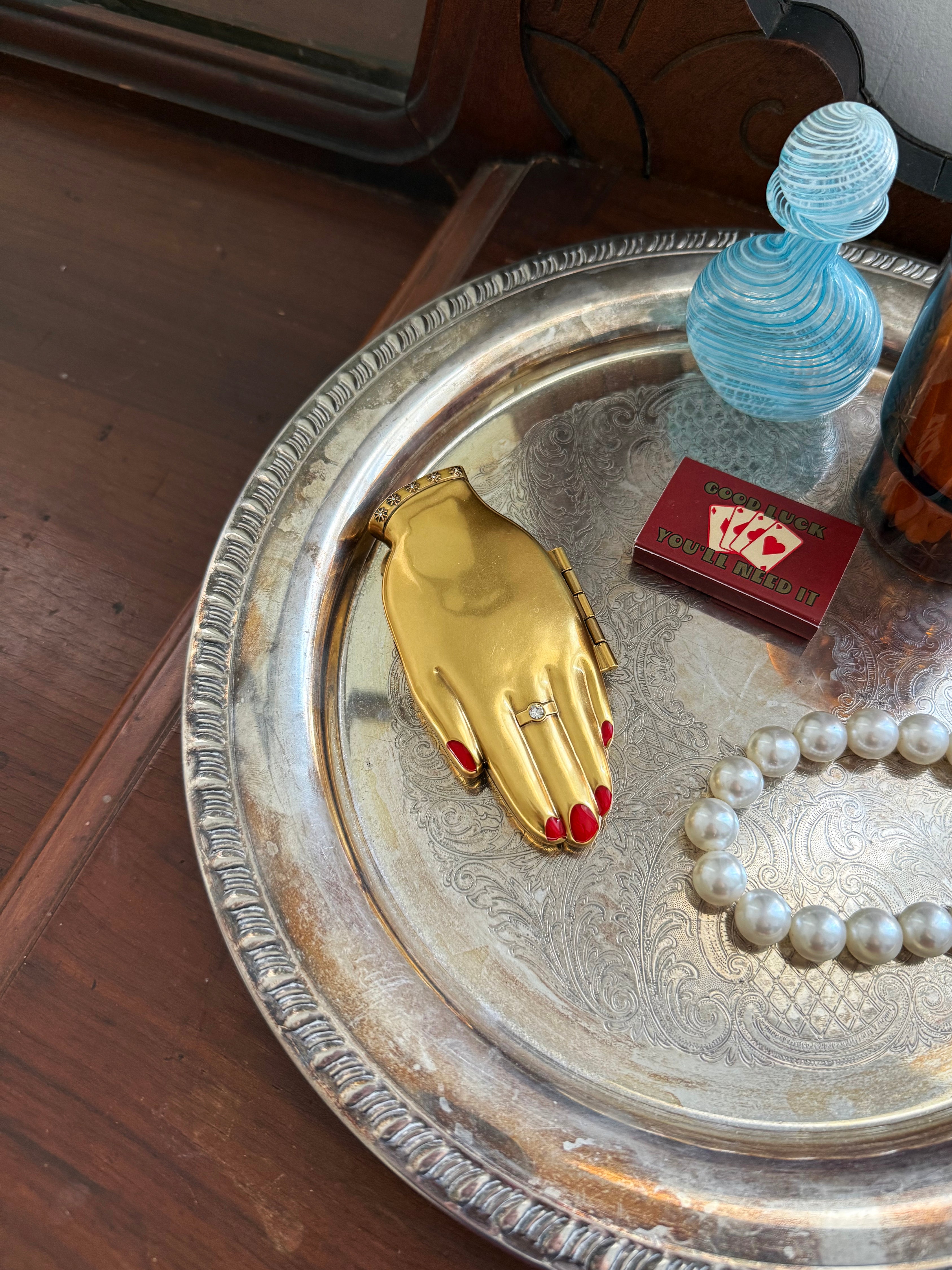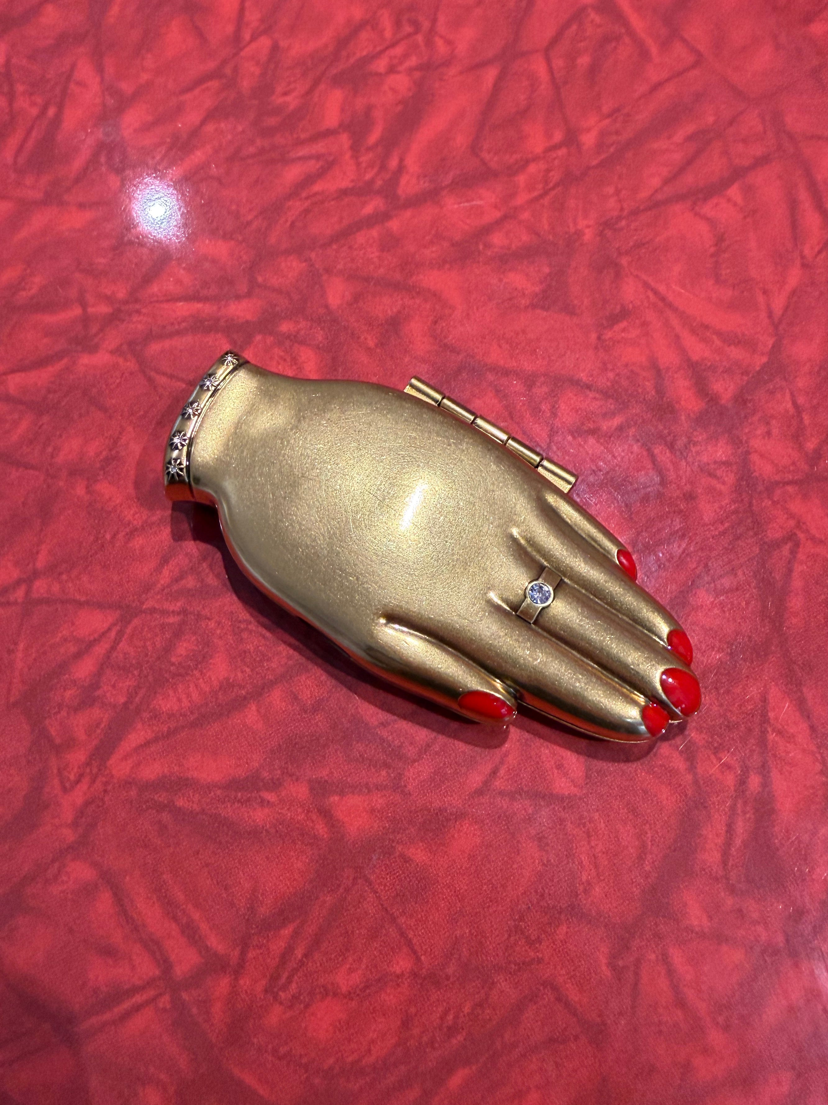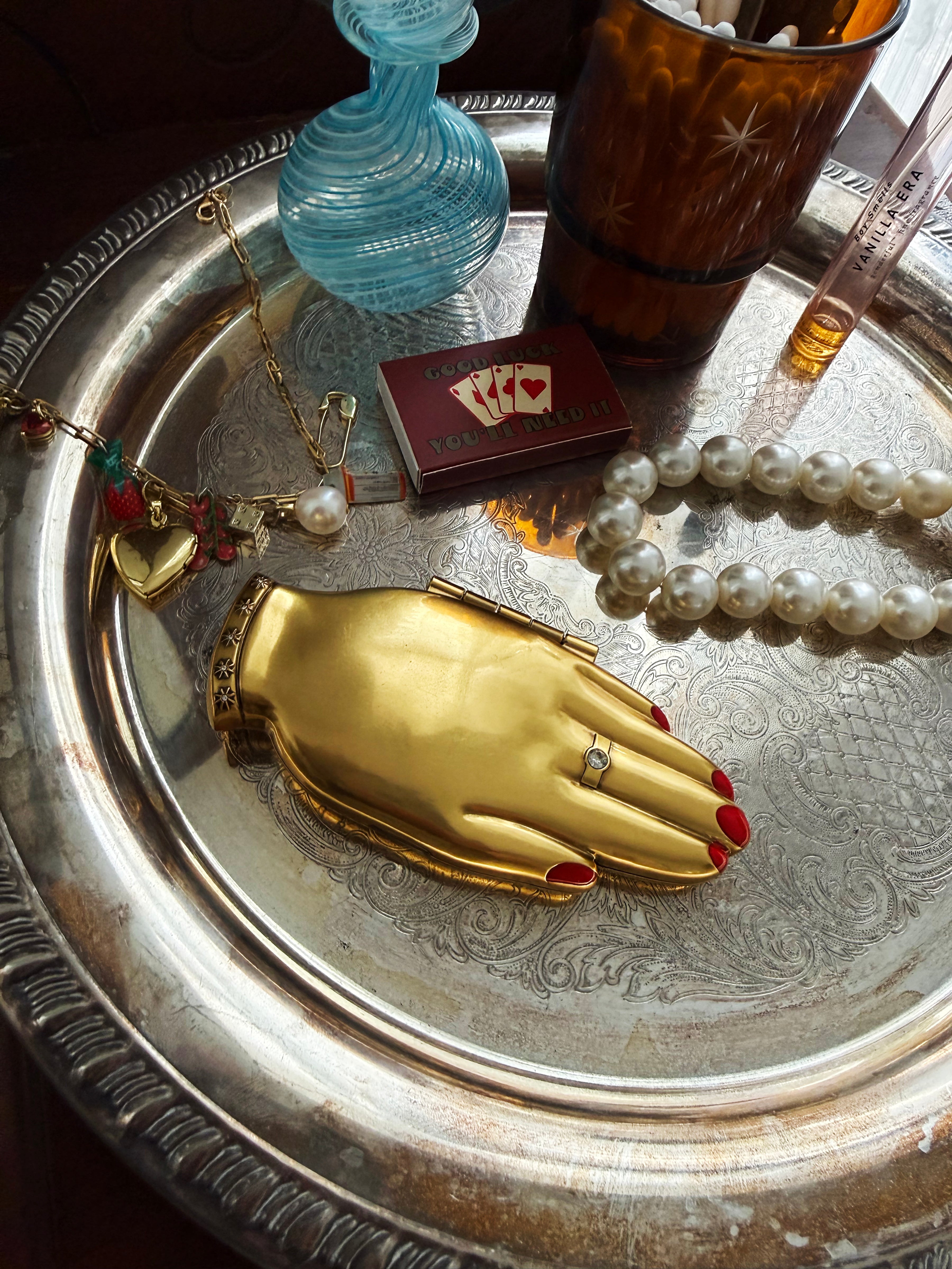 This hand-shaped mirror is inspired by vintage gesture compacts! She's got a beautiful brushed gold finish and features a bright red manicure and engraved jewelry details. Open up the compact to reveal two little mirrors inside, one is magnifying!