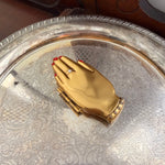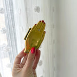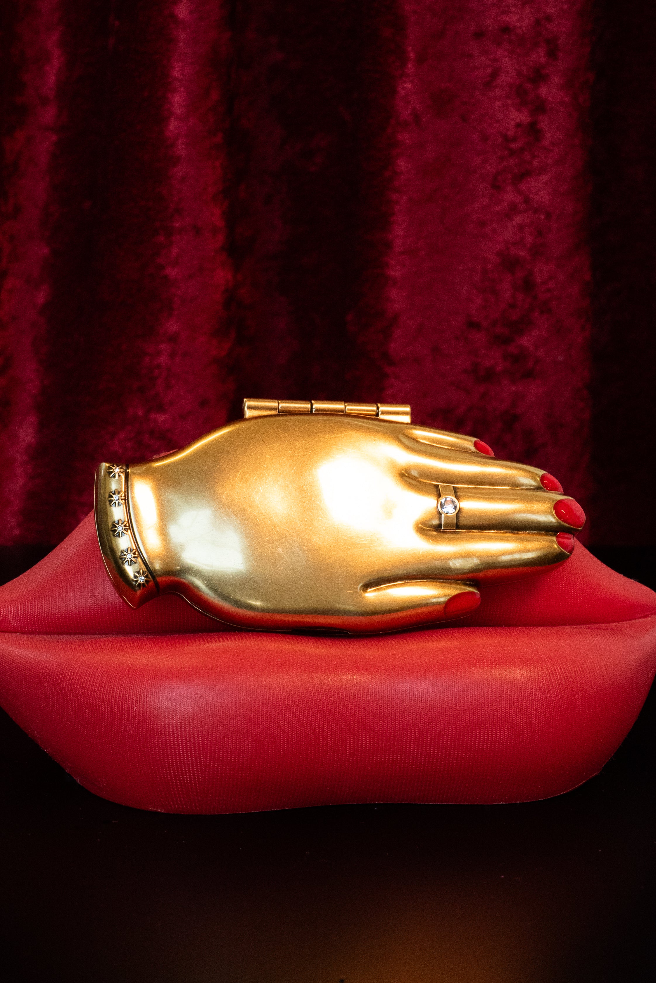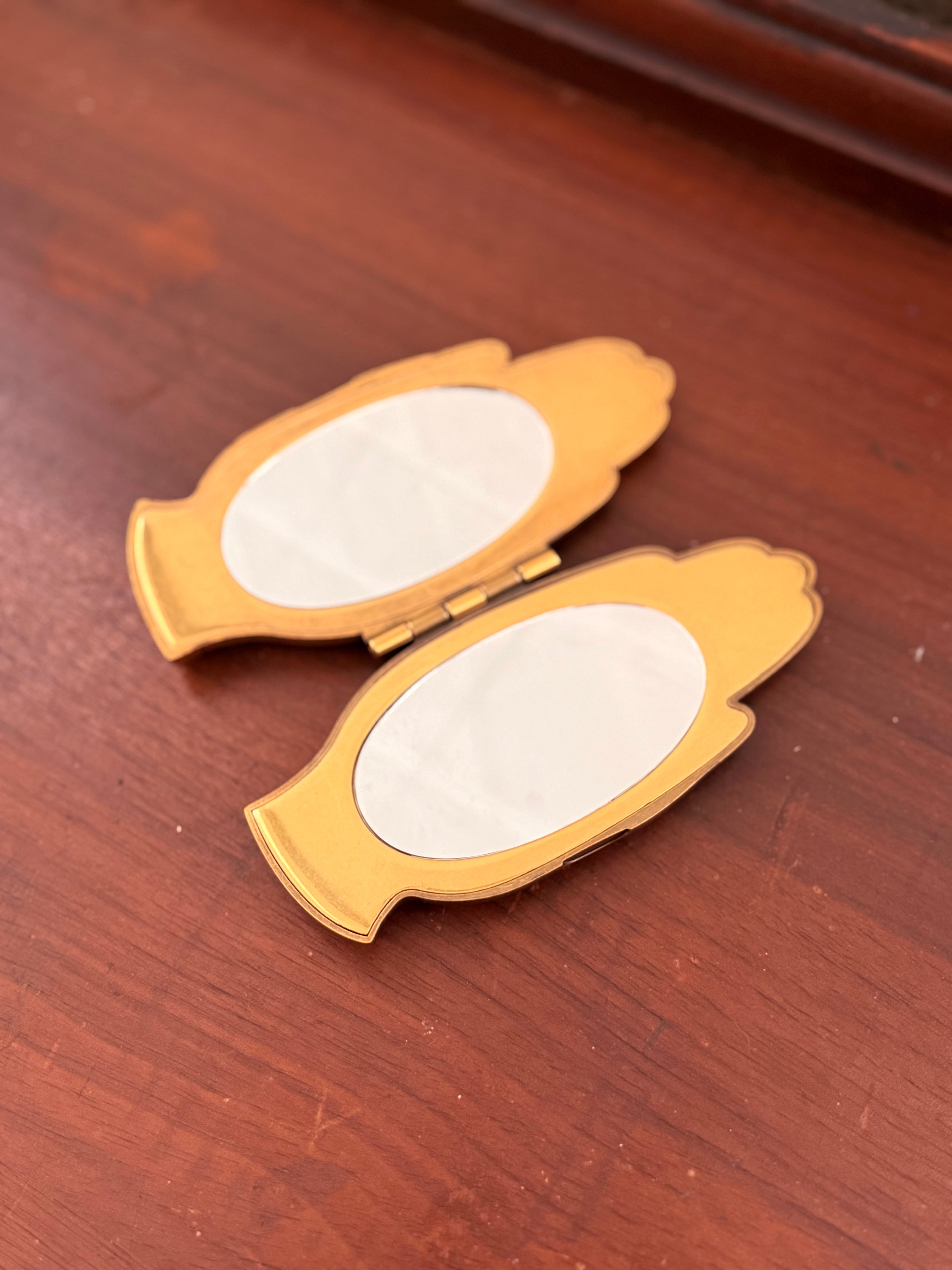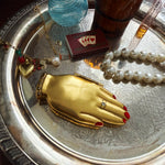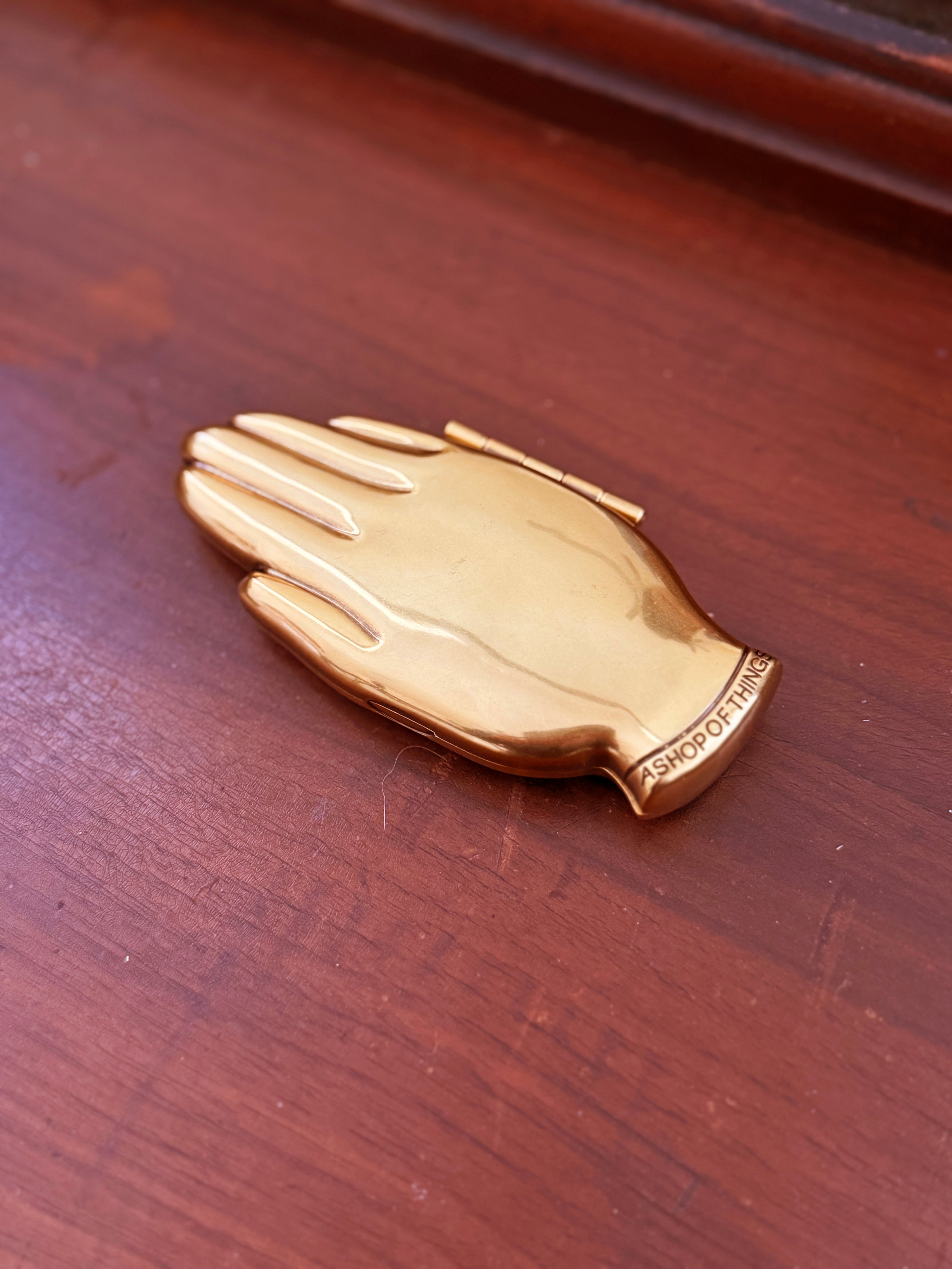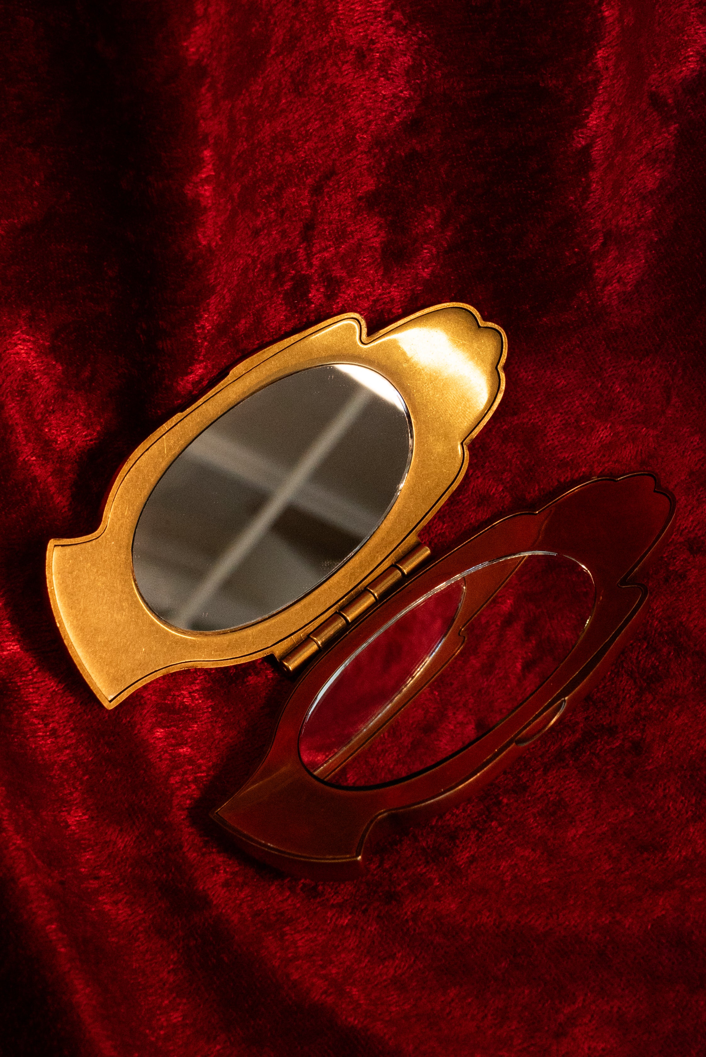 This hand-shaped mirror is inspired by vintage gesture compacts! She's got a beautiful brushed gold finish and features a bright red manicure and engraved jewelry details. Open up the compact to reveal two little mirrors inside, one is magnifying!