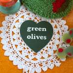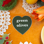 The perfect sticker for the foodie in your life! The cutest olive green heart that reads "green olives" in the center.